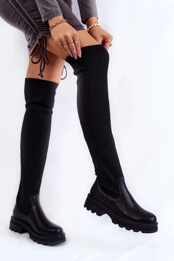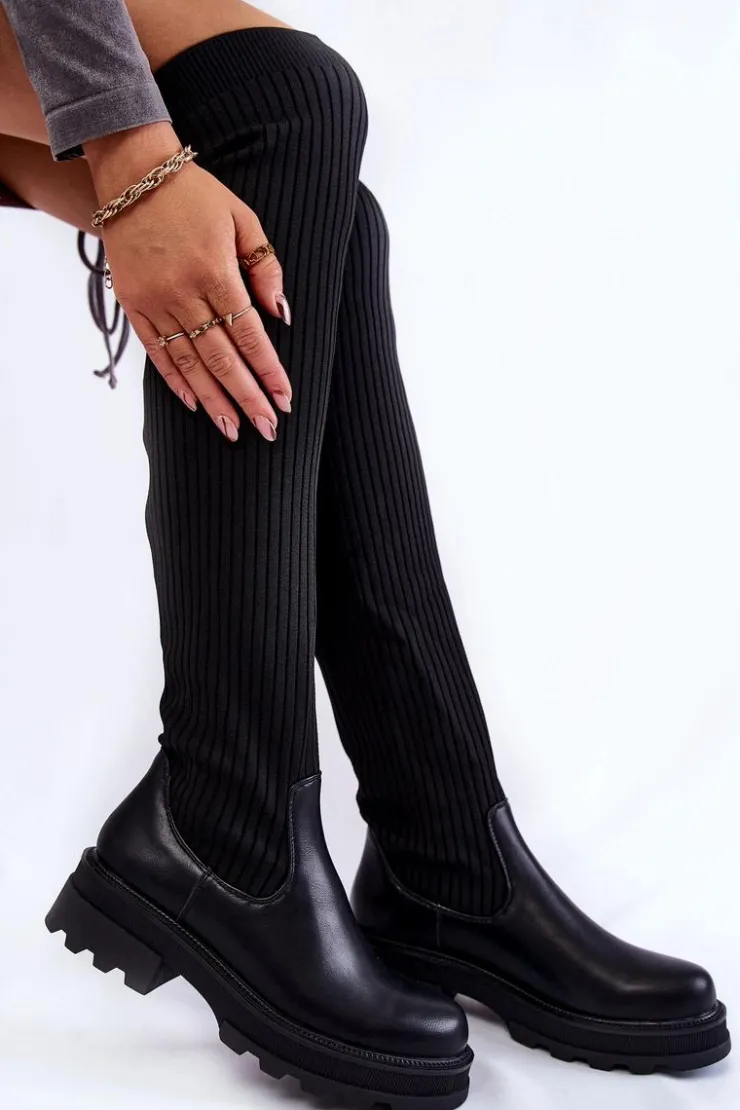 Modne kozaki w stylu workerów zostały wykonane z połączenia eko skóry oraz prążkowanej, elastycznej tkaniny. Model wsuwany, z cholewką za kolano. Kozaki osadzono na płaskim obcasie i delikatnej platformie ze żłobieniami. Buty te posiadają materiałową wkładkę oraz zaokrąglony nosek. Zapiętek jest delikatnie usztywniany. Świetnie będą prezentować się z sukienkami lub spódniczkami mini. Przy wyborze rozmiaru prosimy kierować tabelą rozmiarów.