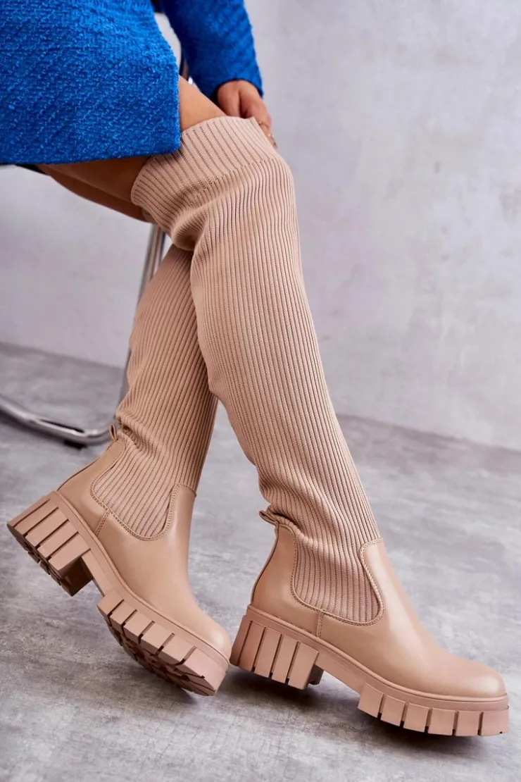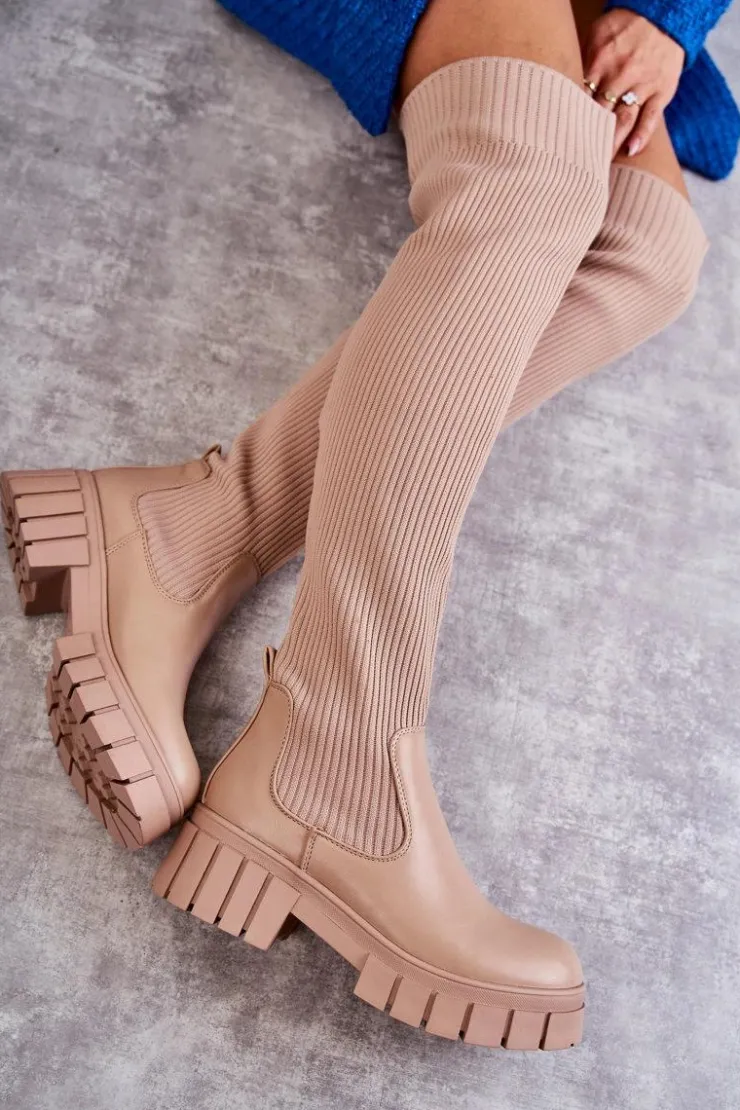 Modne damskie kozaki zostały wykonane z połączenia eko skóry oraz prążkowanej tkaniny. Cholewka za kolano. Model osadzony na płaskim obcasie i delikatnej platformie ze żłobieniami. Buty te posiadają ocieplaną wkładkę. Nosek zaokrąglony. Model wsuwany. Świetnie będą prezentować się z sukienkami lub spódniczkami mini. Przy wyborze rozmiaru prosimy kierować tabelą rozmiarów.