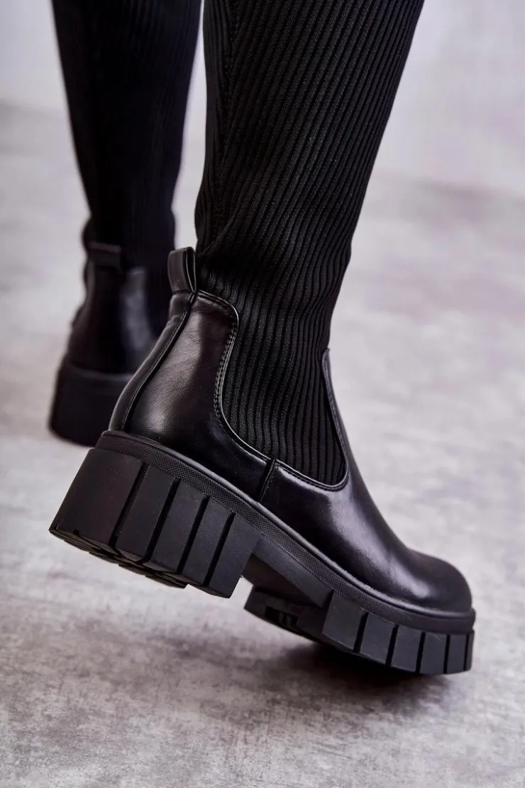 Modne damskie kozaki zostały wykonane z połączenia eko skóry oraz prążkowanej tkaniny. Cholewka za kolano. Model osadzony na płaskim obcasie i delikatnej platformie ze żłobieniami. Buty te posiadają ocieplaną wkładkę. Nosek zaokrąglony. Model wsuwany. Świetnie będą prezentować się z sukienkami lub spódniczkami mini. Przy wyborze rozmiaru prosimy kierować tabelą rozmiarów.