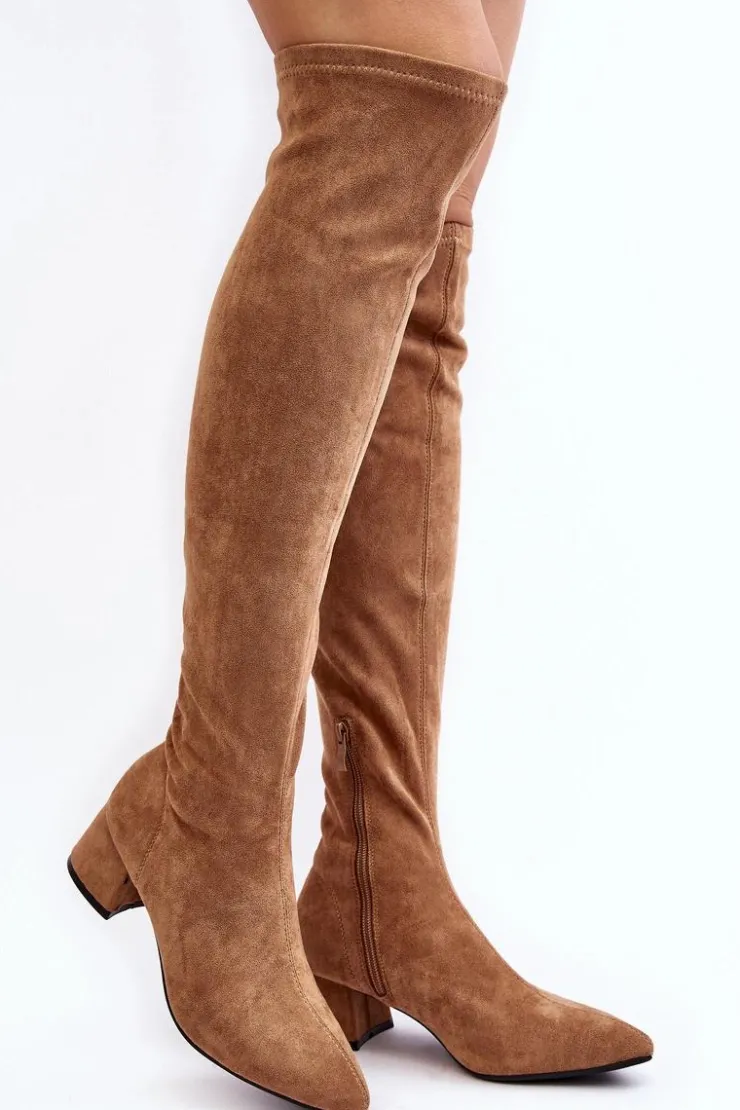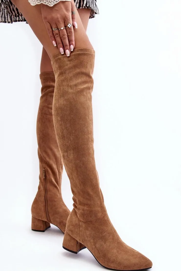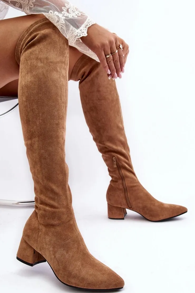 Modne kozaki damskie z cholewką za kolano. Wykonane z eko zamszu. Osadzone na niskim obcasie klocku. Noski w szpic optycznie wysmuklą nogi. Model wsuwany z dodatkowym zapięciem na suwak. Cholewka ozdobiona przeszyciami. Idealny model do sukienek mini czy spódniczek. Koniecznie powinnaś je mieć! Przy wyborze rozmiaru prosimy sugerować się tabelą rozmiarów.