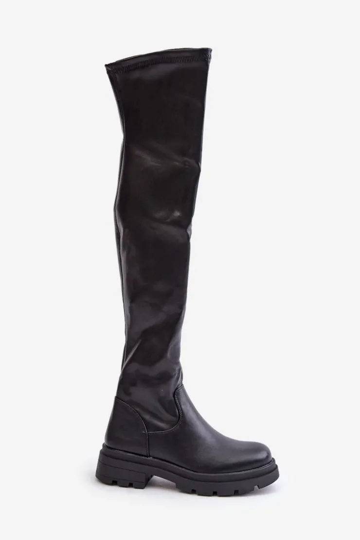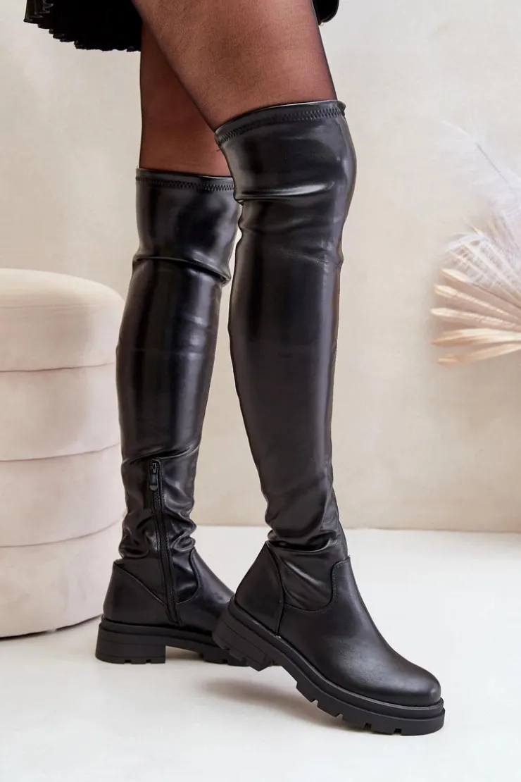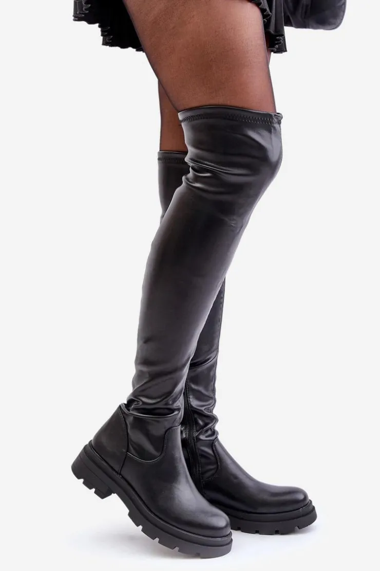 Kozaki za kolano z eko skóry to elegancka opcja na chłodniejsze dni. Osadzone na platformie z płaskim obcasem, gwarantują wygodę noszenia przez cały dzień. Model wsuwany z praktycznym zamkiem na dole ułatwia zakładanie. Ocieplenie kocem obuwniczym na wysokości stopy zapewnia ciepło, a ich stylowy design świetnie pasuje zarówno do sukienek, jak i spódnic, dodając każdej stylizacji modnego akcentu. Przy wyborze rozmiaru prosimy sugerować się tabelą rozmiarów.
