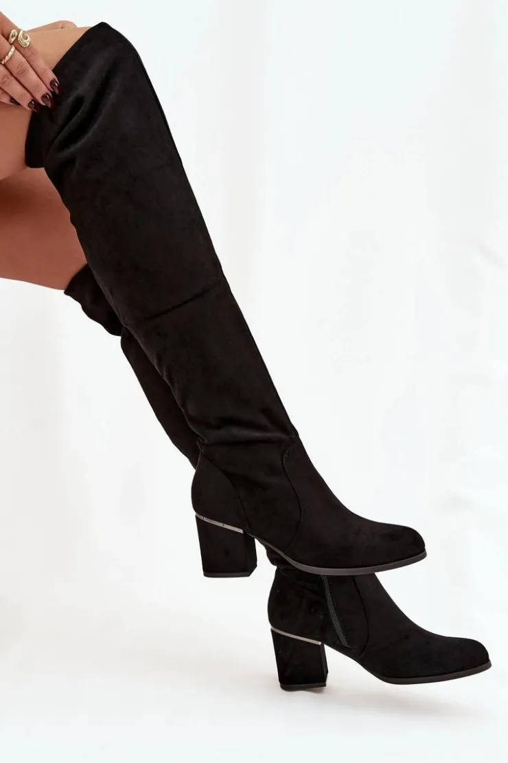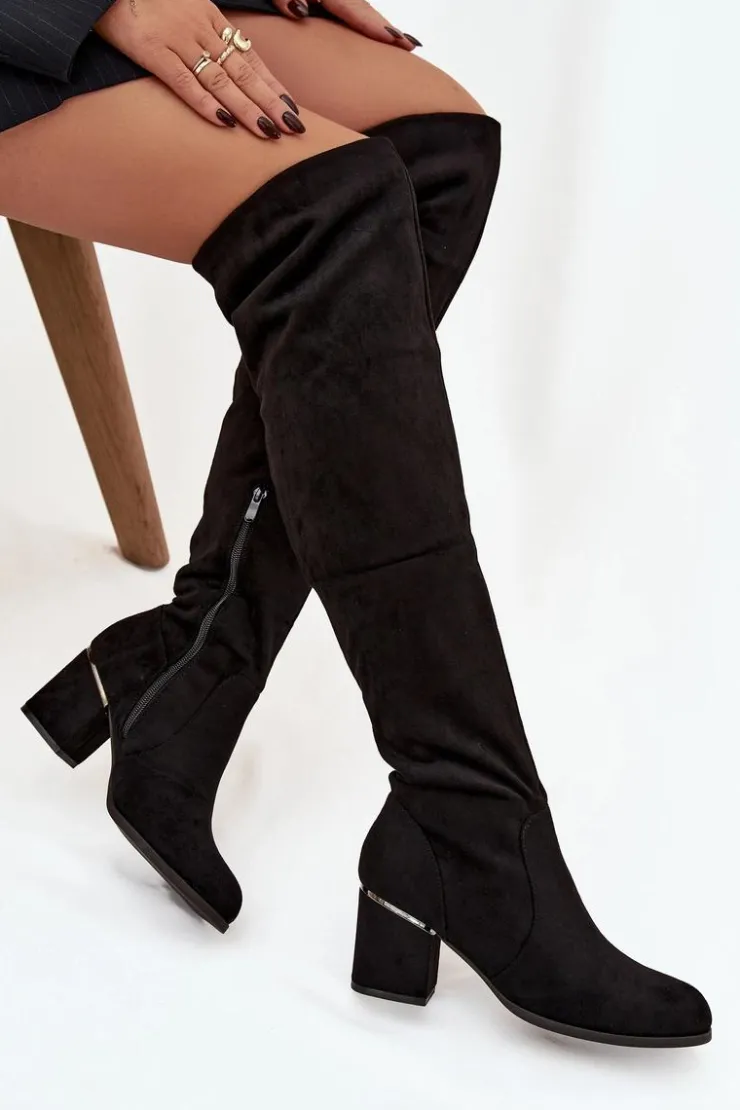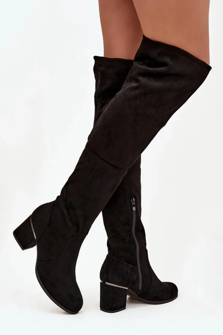 Kozaki damskie wykonane z imitacji zamszu to modna propozycja na chłodniejsze dni. Model z wysoką cholewką za kolano pięknie podkreśla nogi, dodając stylizacji kobiecego charakteru. Osadzone na stabilnym obcasie typu słupek zapewniają wygodę i pewność kroku. Kozaki są wsuwane, a zamek umieszczony na dole ułatwia zakładanie i dopasowanie do nogi. To doskonały wybór zarówno do sukienek i spódnic, jak i do dopasowanych spodni. Przy wyborze rozmiaru prosimy sugerować się tabelą rozmiarów.