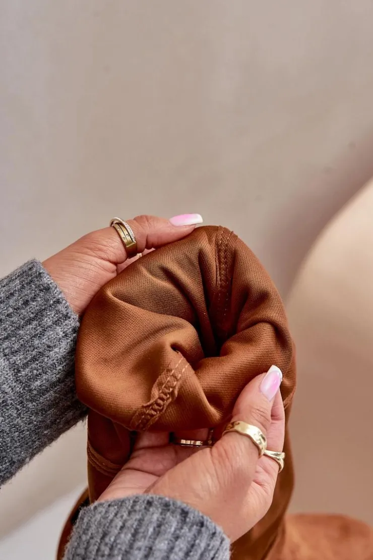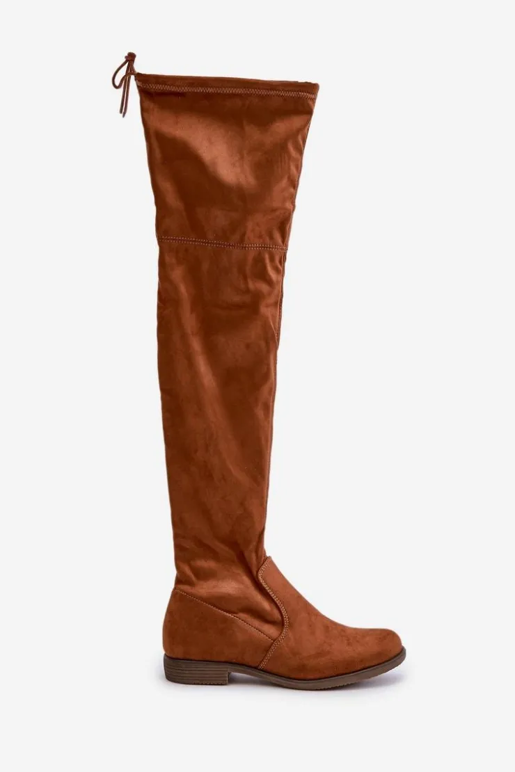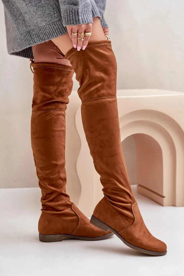 Damskie kozaki z cholewką sięgającą za kolano, wykonane z ekologicznego zamszu. Osadzone na płaskim, stabilnym obcasie z zaokrąglonymi noskami i usztywnionym zapiętkiem. Model wsuwany z regulowaną górą cholewki. Doskonale komponują się z sukienkami i spódnicami. Przy wyborze rozmiaru prosimy kierować tabelą rozmiarów.