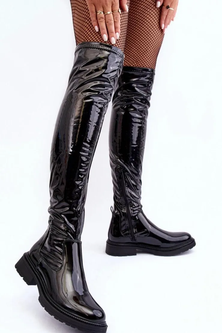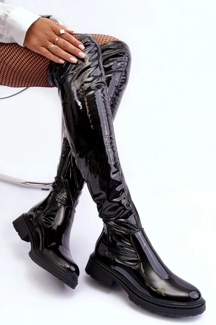 Kozaki damskie z cholewką za kolano. Osadzone na płaskim, stabilnym obcasie. Model z zaokrąglonym noskiem. Wsuwane z dodatkowym suwakiem na dole cholewki. Wewnątrz na wysokości stopy ocieplenie w postaci koca obuwniczego. Przy wyborze rozmiaru prosimy sugerować się tabelą rozmiarów.
