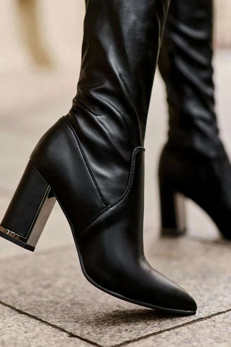 Kozaki damskie z cholewką za kolano. Wykonane z eko skóry. Osadzone na obcasie w postaci słupka, który wzbogacony został lustrzanym elementem. Na górze cholewki znajduje się wiązanie. Model wsuwany z dodatkowym suwakiem. W środku ocieplone na wysokości stopy. Idealny model do sukienek mini czy spódniczek. Koniecznie powinnaś je mieć! Przy wyborze rozmiaru prosimy sugerować się tabelą rozmiarów.