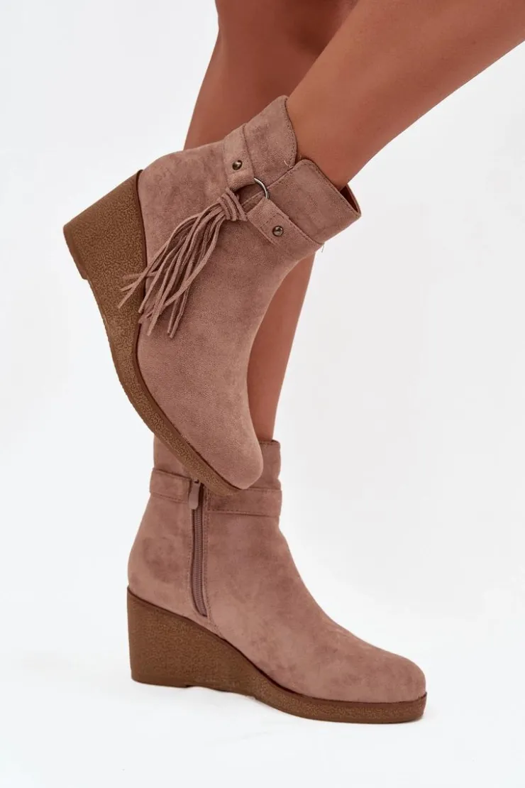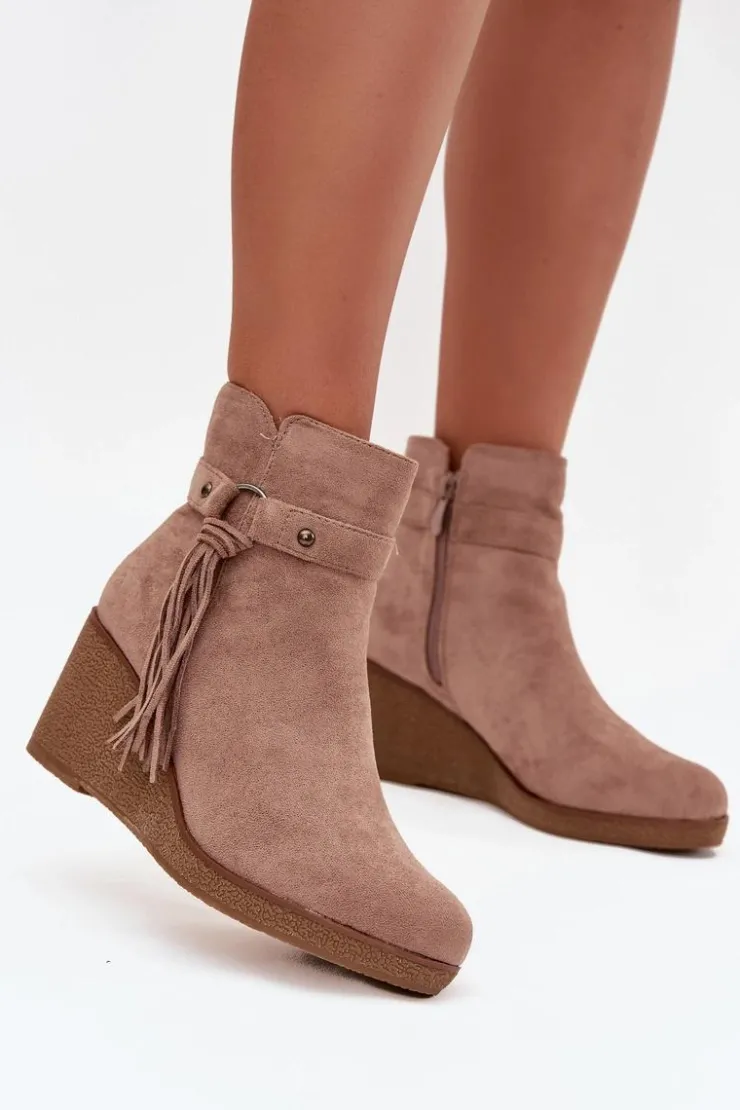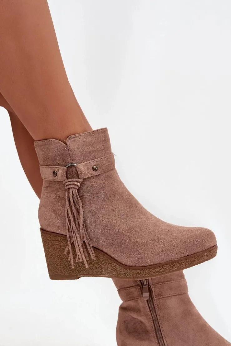 Botki damskie z eko zamszu to modny i wygodny wybór na chłodniejsze dni. Wnętrze butów zostało ocieplone kocem obuwniczym, dzięki czemu zapewniają komfort i ciepło. Zamek po boku ułatwia zakładanie i zdejmowanie, a całości wyjątkowego charakteru nadaje ozdobny pasek z frędzlami, który podkreśla stylowy wygląd modelu. To obuwie doskonale sprawdzi się w codziennych stylizacjach – pasuje zarówno do spodni, jak i do sukienek czy spódnic, dodając im modnego akcentu.