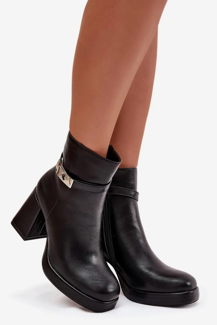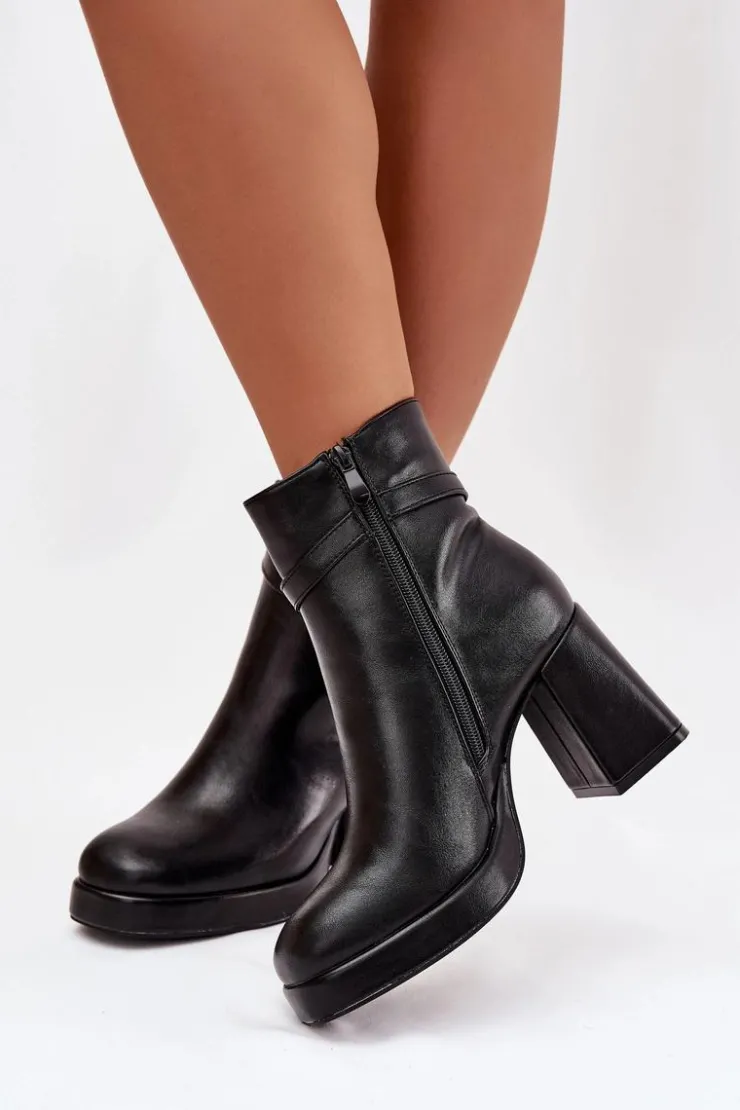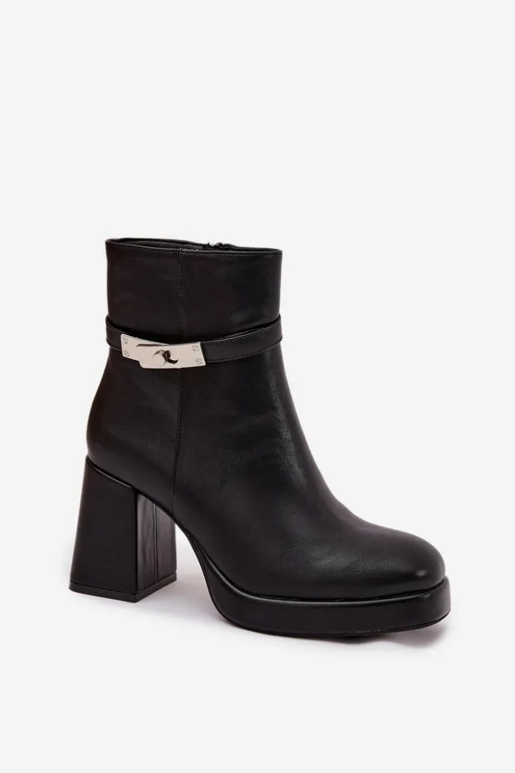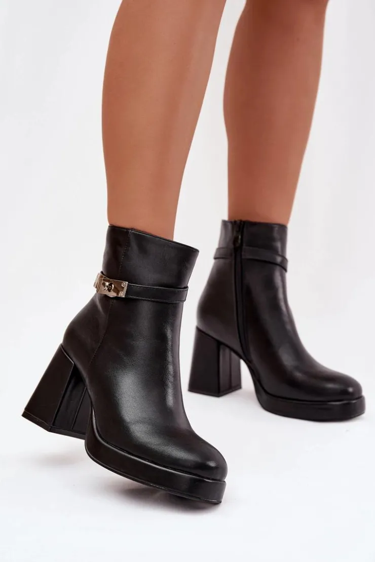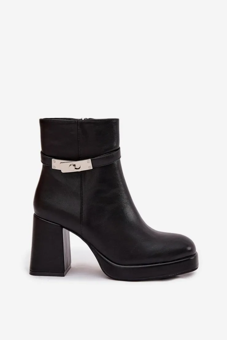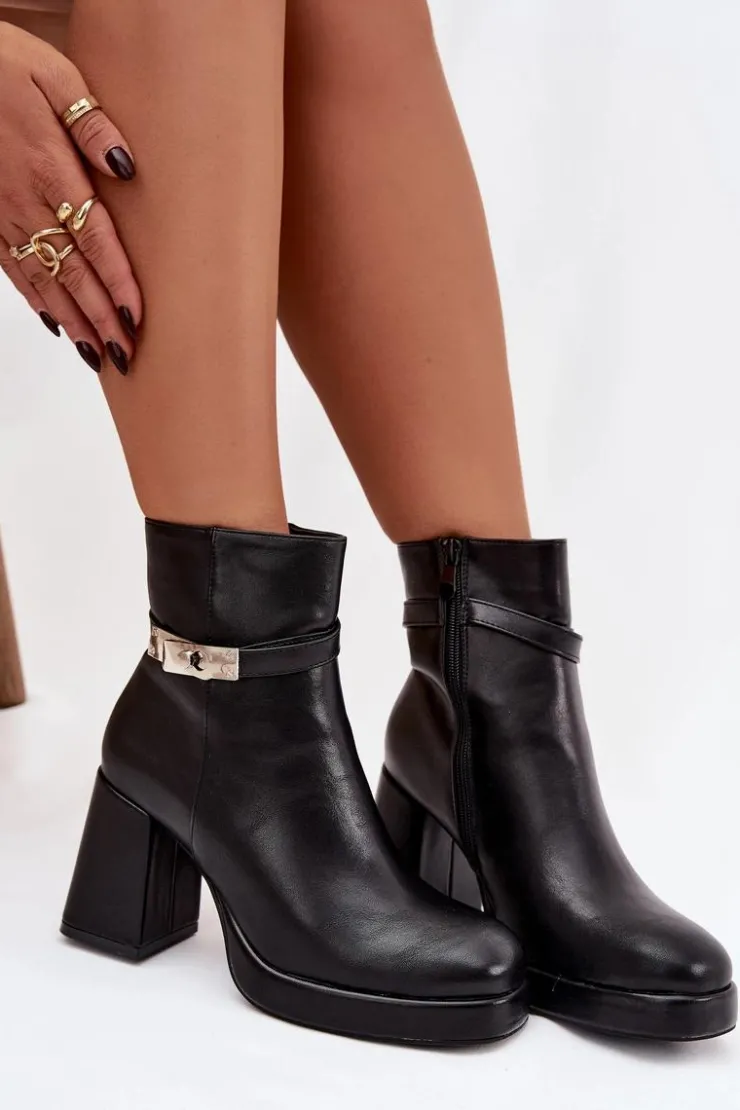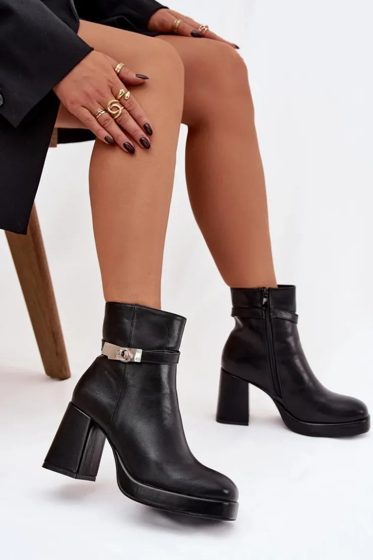 Ocieplane botki damskie na słupku z ozdobnym paskiem czarne Giordina