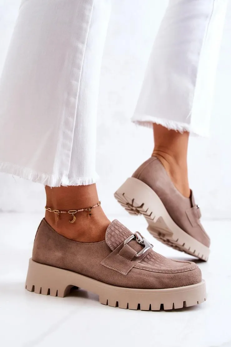 Półbuty wsuwane wykonane z naturalnego zamszu z zaokrąglonym noskiem. Osadzone na masywnej platformie i płaskim, stabilnym obcasie. Model z wysokim bieżnikiem na podeszwie. Na górze dekoracyjny łańcuch. Pod językiem znajduje się elastyczna gumka ściągająca, dzięki której but będzie bardziej dopasowany do stopy. Półbuty posiadają usztywniany zapiętek. Modne, wygodne, wykonane z dbałością o szczegóły – jednym słowem: idealne! Miękka, wykonana z naturalnej skóry wkładka zadba o Twój komfort. Przy wyborze rozmiaru prosimy sugerować się tabelą rozmiarów.