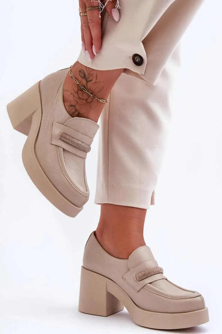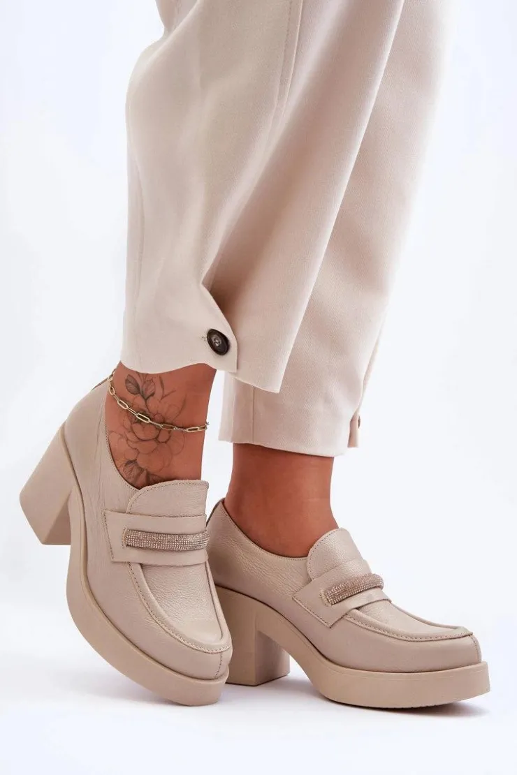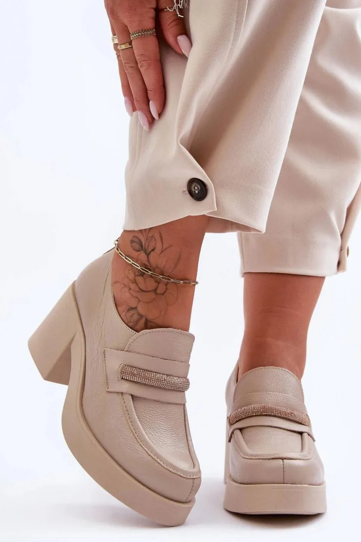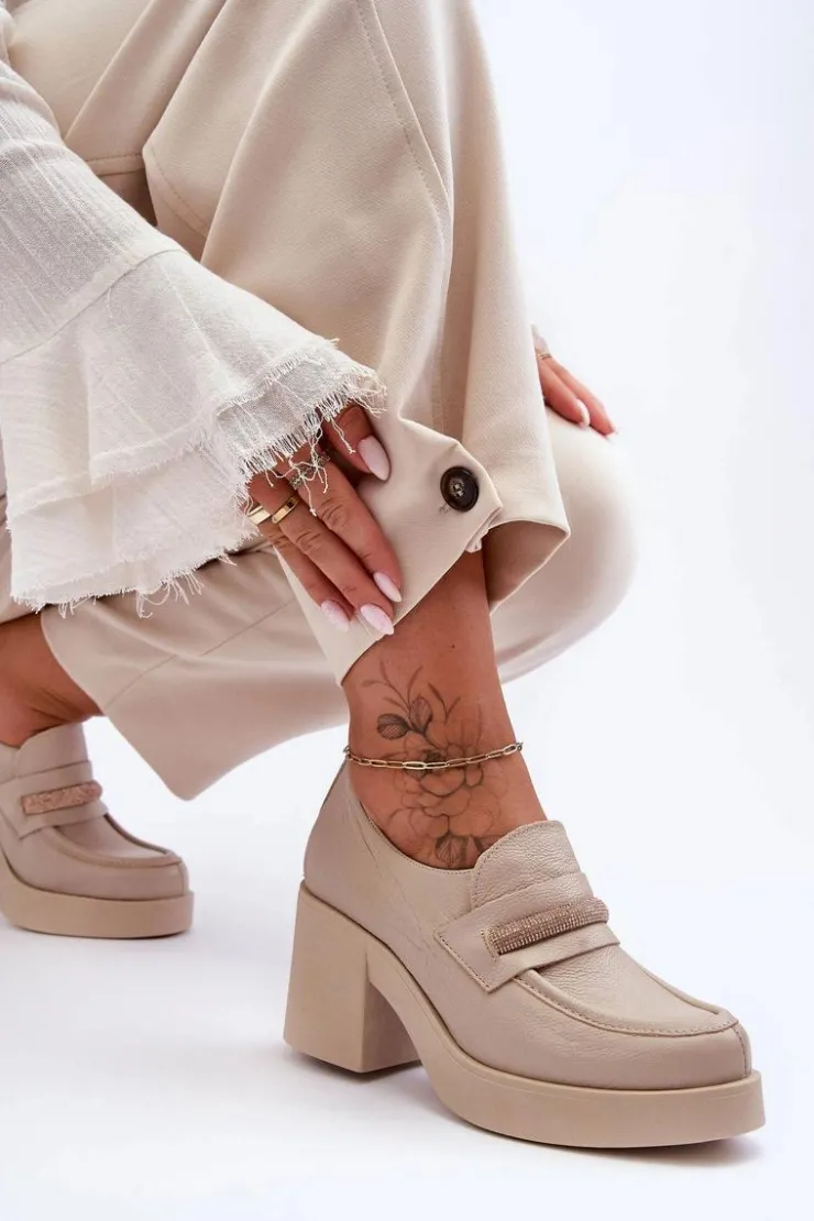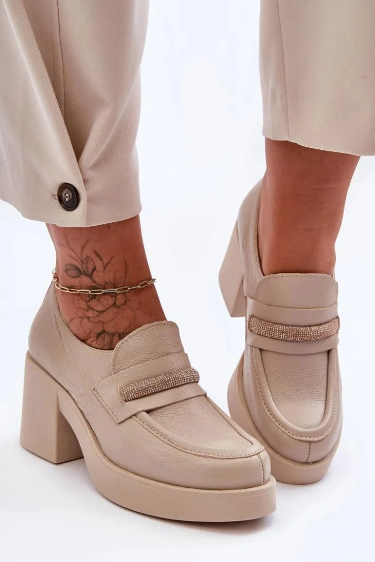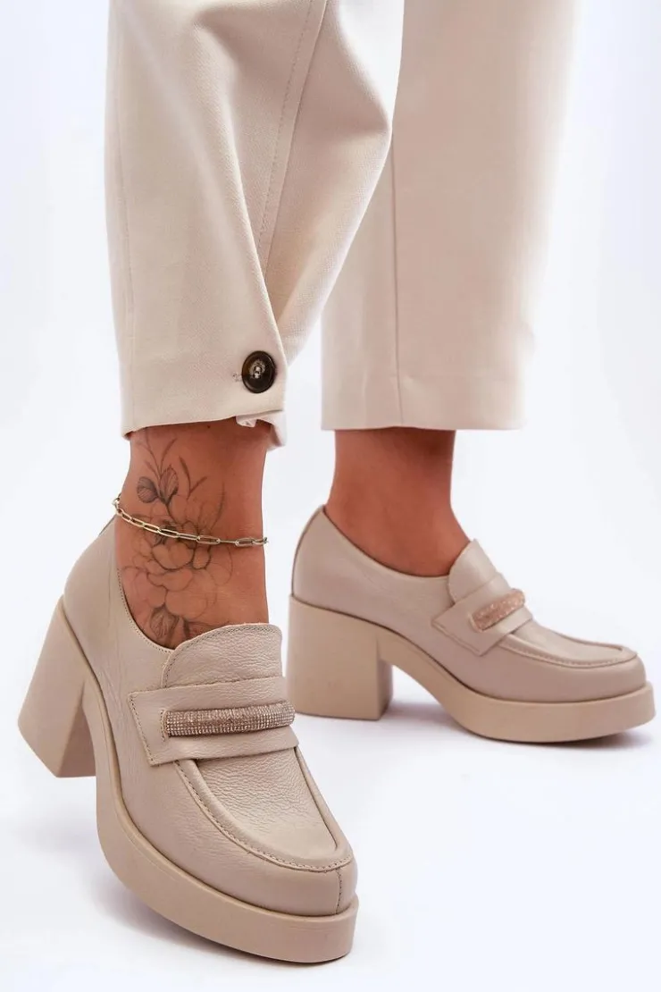 Boto Półbuty Skórzane*Skórzane Półbuty Na Słupku Z Ozdobą Beżowe Lemar Gelanor Beżowy