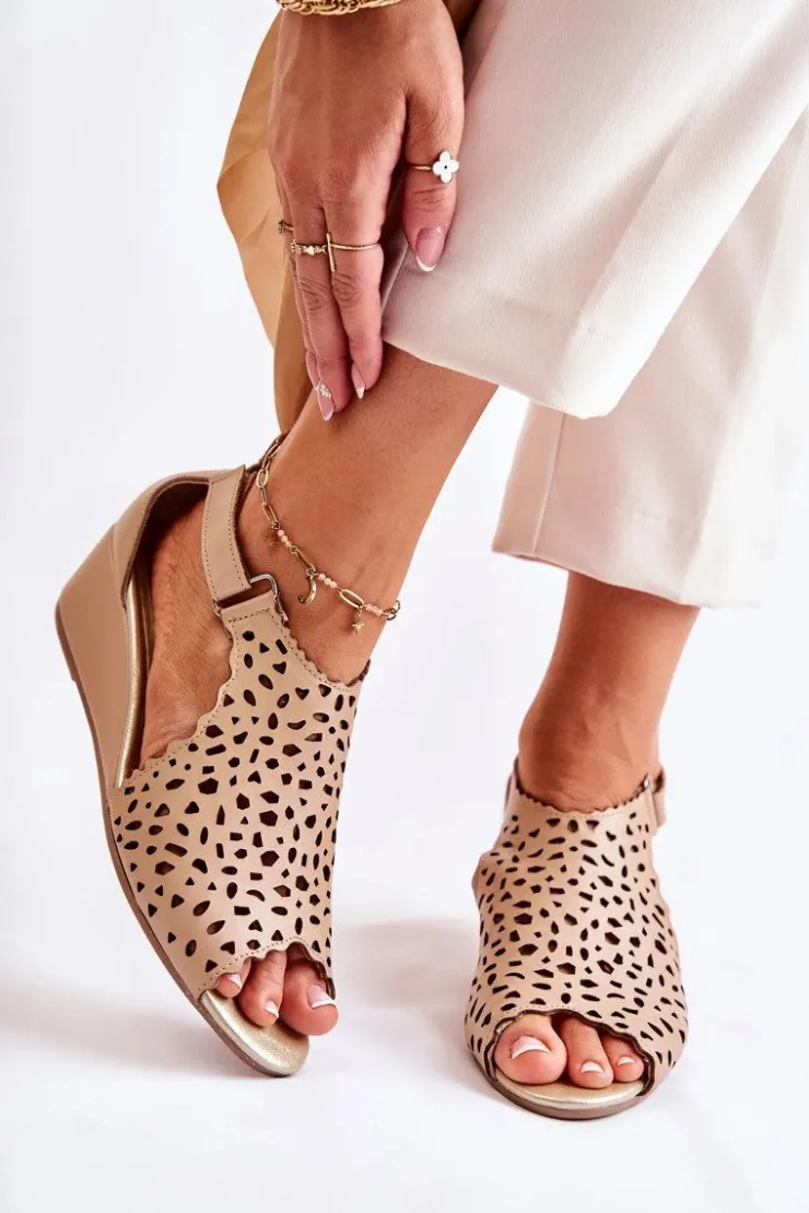 Sandały damskie wykonane z naturalnej skóry w ażurowy wzór. Zapinane przy kostce na rzep. Dodatkowo znajduje się także gumka przy usztywnianym zapiętku, co pozwoli na odpowiednie dopasowanie obuwia. Buty są osadzone na koturnie. Sandały posiadają odkryty, zaokrąglony nosek. Miękka wkładka wykonana także z naturalnej skóry pozwoli na wygodne użytkowanie obuwia. Fason idealny na upalne dni! Przy wyborze rozmiaru prosimy sugerować się tabelą rozmiarów.