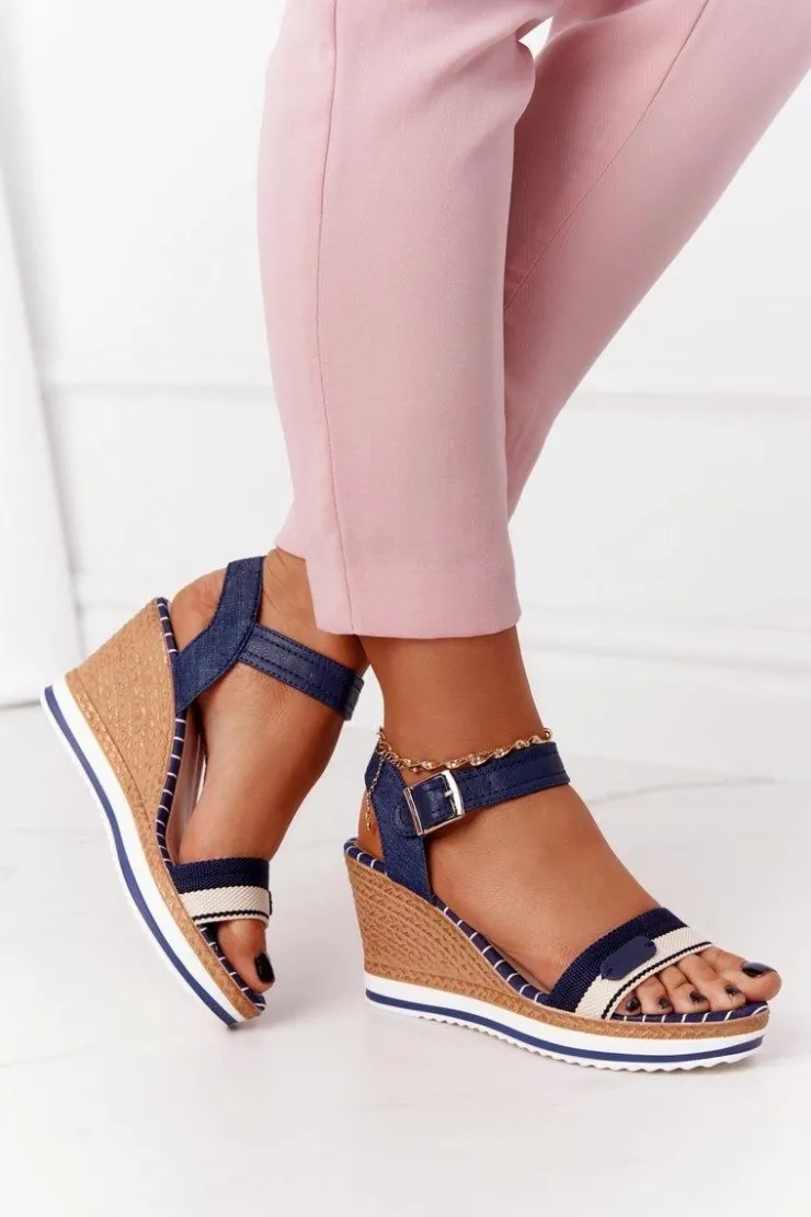 Piękne oraz wygodne sandały na koturnie wykonane z połączenia eko skóry, oraz tkaniny. Buty posiadają miękką wkładkę ze skóry ekologicznej. Modny fason w marynarskim stylu urozmaici Twoją letnią garderobę! Koniecznie sprawdź całą naszą kolekcję damskich sandałów. Przy wyborze rozmiaru prosimy sugerować się tabelą rozmiarów.