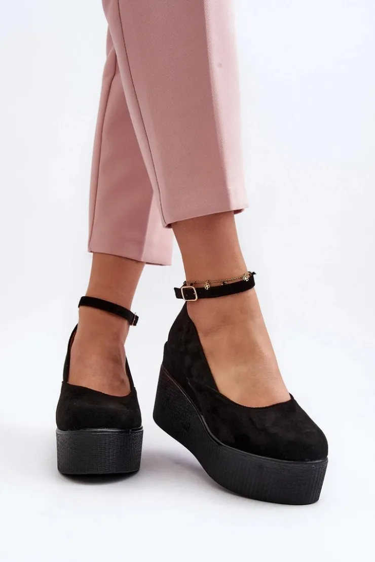 Espadryle damskie osadzone na platformie wraz z koturnem. Wykonane z eko zamszu. Noski zakryte, zaokrąglone. Zapinane na regulowany pasek ze sprzączką. Model ten posiada miękką wkładkę z eko skóry, która zapewni wygodę podczas użytkowania. Idealne do wiosenno-letnich stylizacji! Przy wyborze rozmiaru prosimy sugerować się tabelą rozmiarów.
