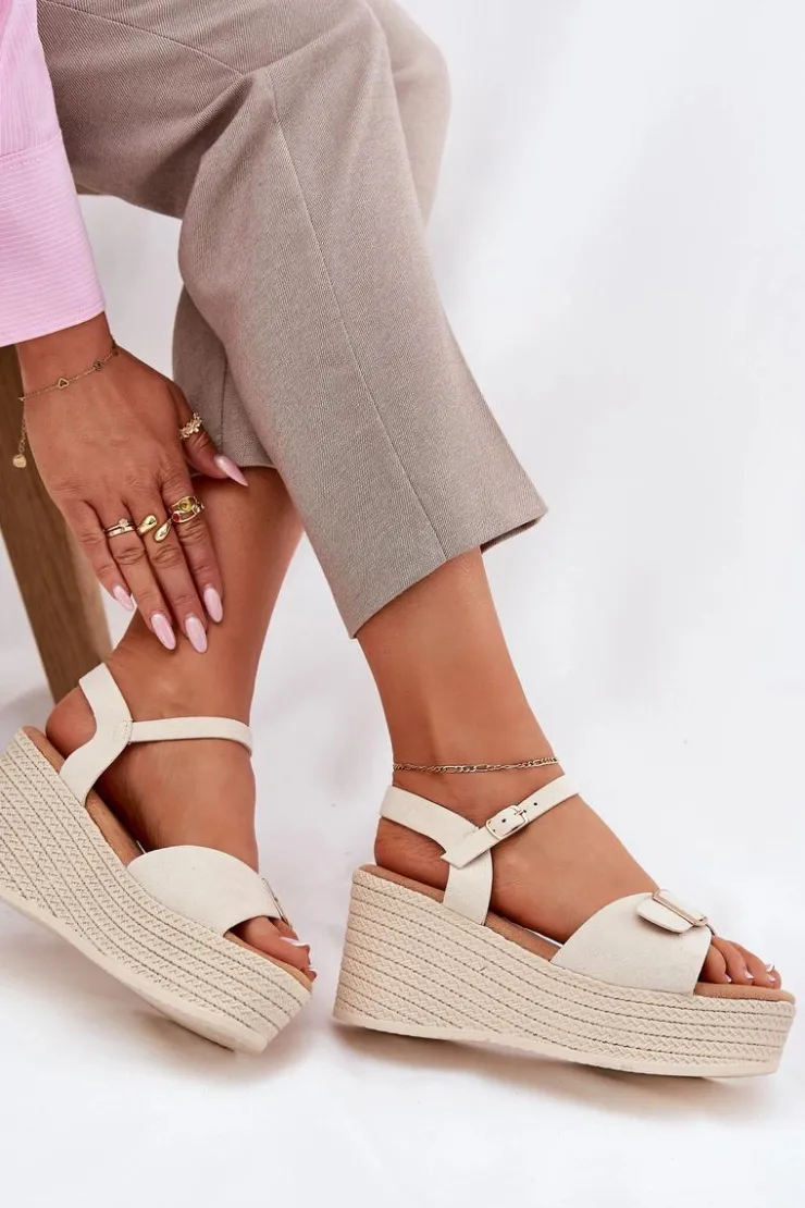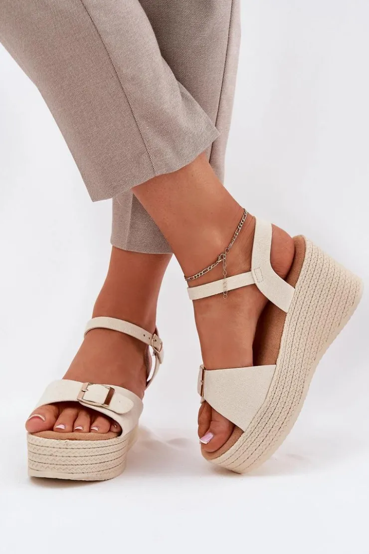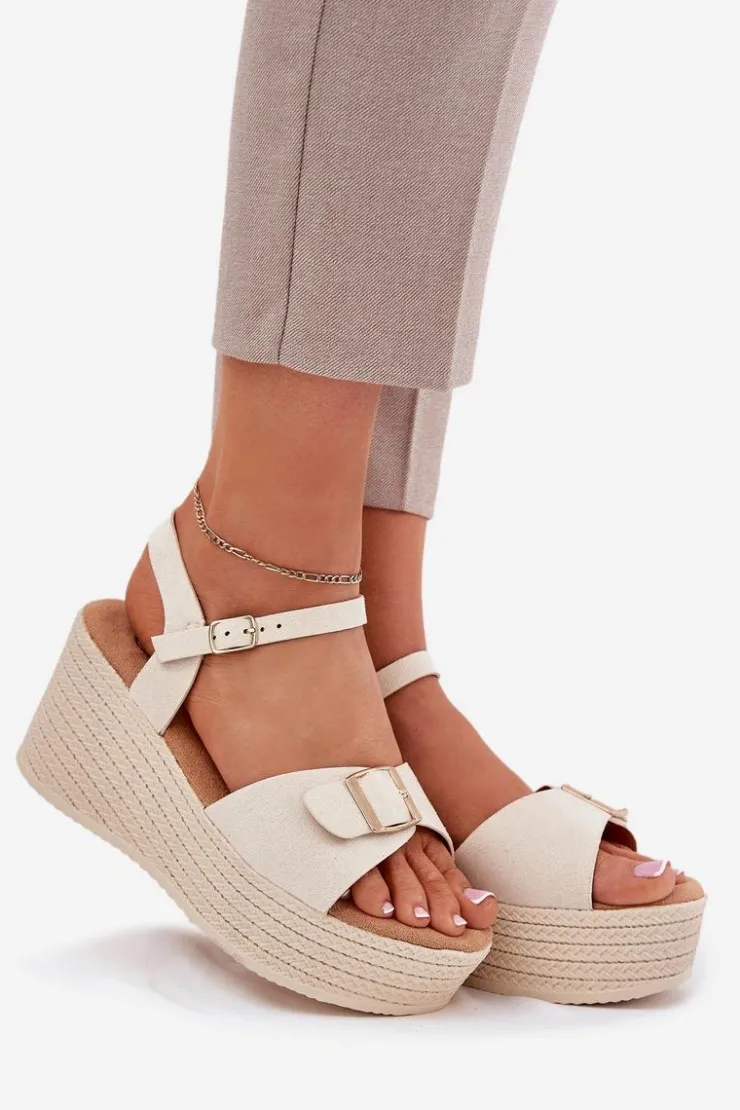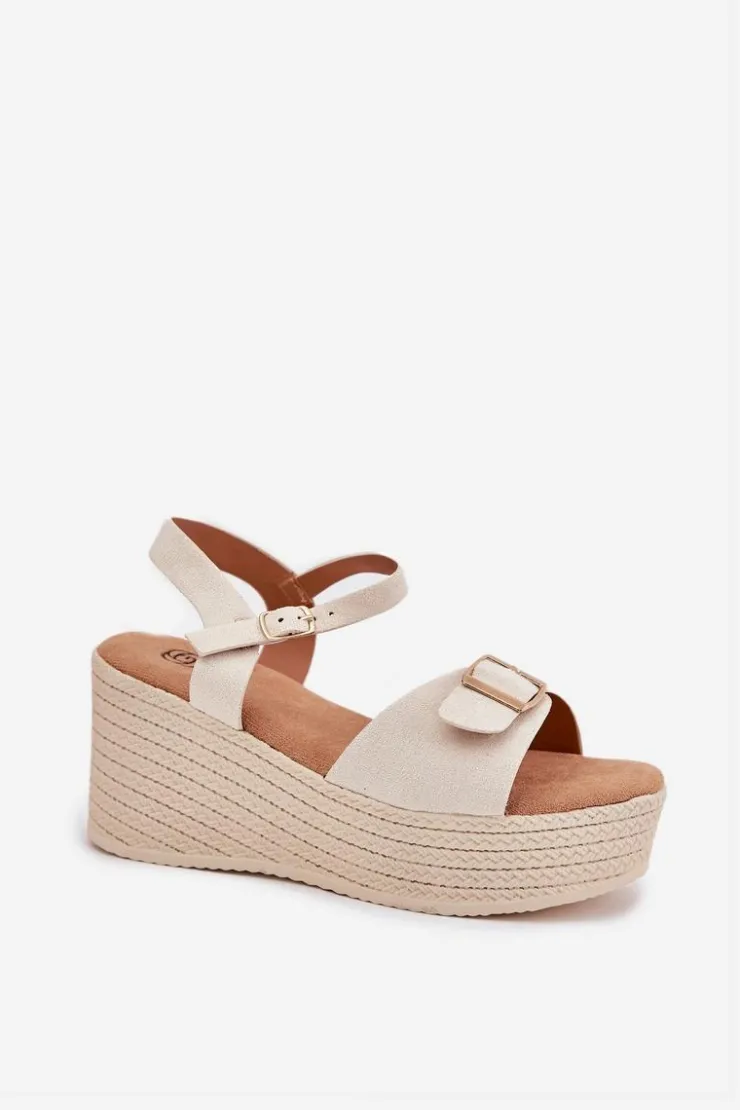 Damskie sandały wykonane z eko zamszu. Osadzone na koturnie i platformie z imitacją plecionki, zapewniają wygodę oraz stabilność przez cały dzień. Z przodu znajdują się ozdobna klamra, która dodaje im unikalnego charakteru. Model zapinany na sprzączkę umożliwia idealne dopasowanie do stopy, a miękka wkładka gwarantuje komfort. Te sandały będą doskonałym uzupełnieniem letnich stylizacji. Przy wyborze rozmiaru prosimy sugerować się tabelą rozmiarów.