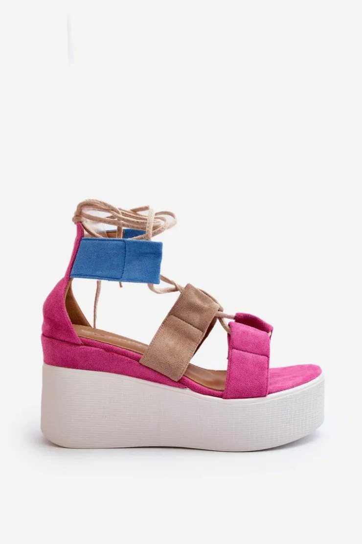 Sandały damskie osadzone na grubej platformie oraz koturnie. Wykonane z eko zamszu. Model ten posiada modne wiązanie wokół kostki. Lekko profilowana wkładka z eko skóry zapewni wygodę podczas użytkowania. Fason ten dopasujesz do wielu stylizacji z letnimi sukienkami, spódnicami oraz spodniami! Przy wyborze rozmiaru prosimy sugerować się tabelą rozmiarów.