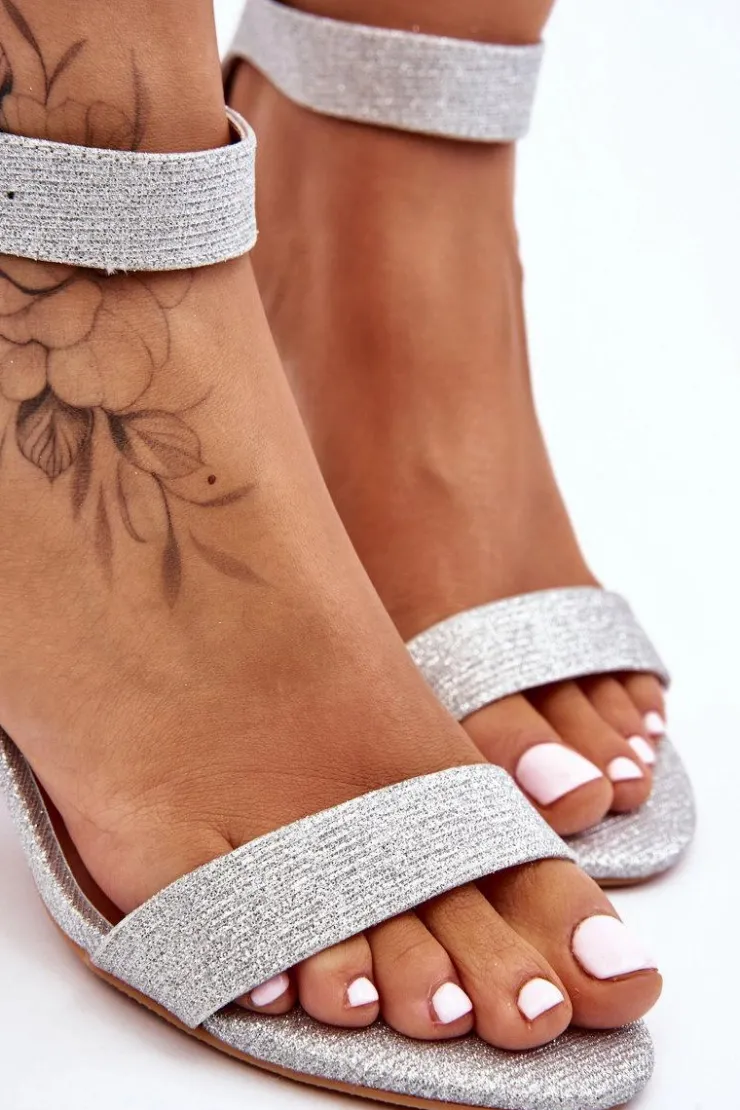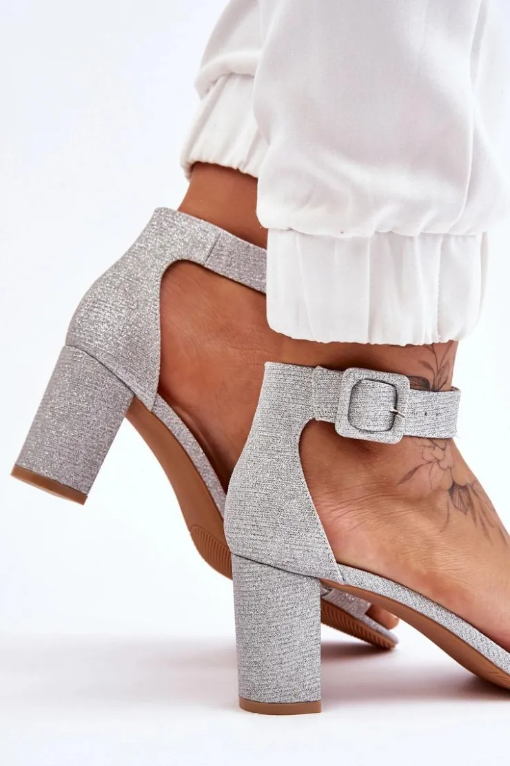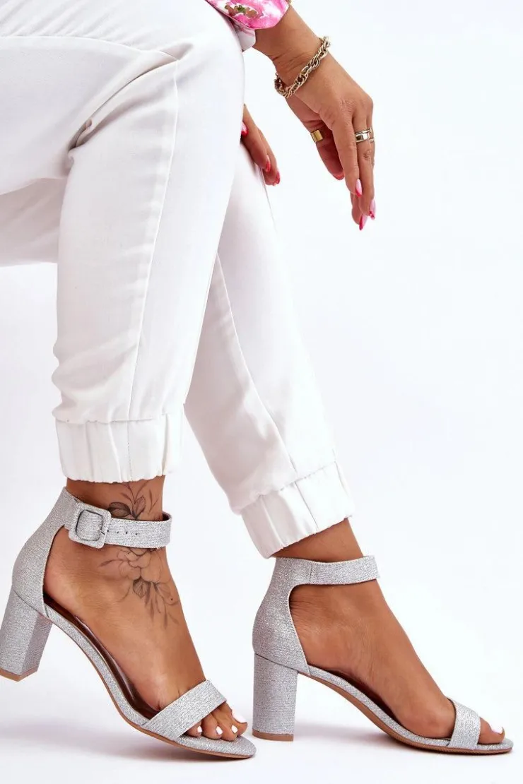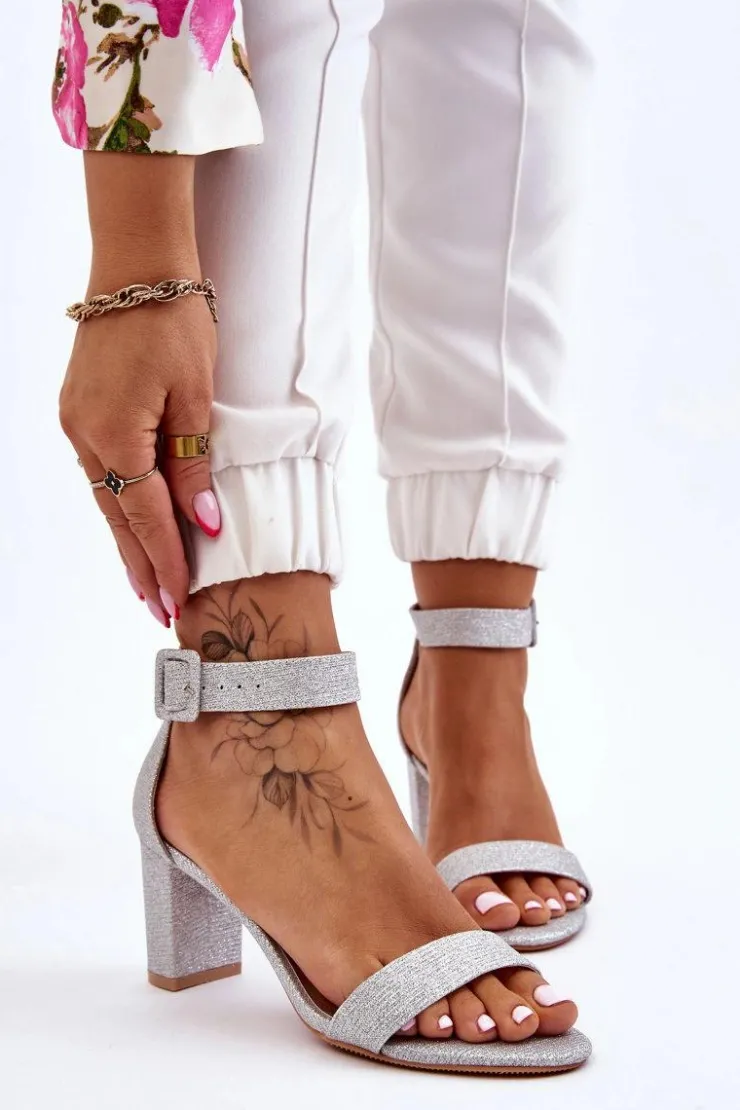 Klasyczne, damskie sandałki na niskim obcasie w postaci słupka. Model ten został wykonany z tworzywa sztucznego z brokatem. Zapinane wokół kostki na regulowany pasek ze sprzączką. Idealne na różnego rodzaju imprezy! Posiadają usztywniany zapiętek. Koniecznie powinnaś je mieć! Przy wyborze rozmiaru prosimy kierować tabelą rozmiarów.