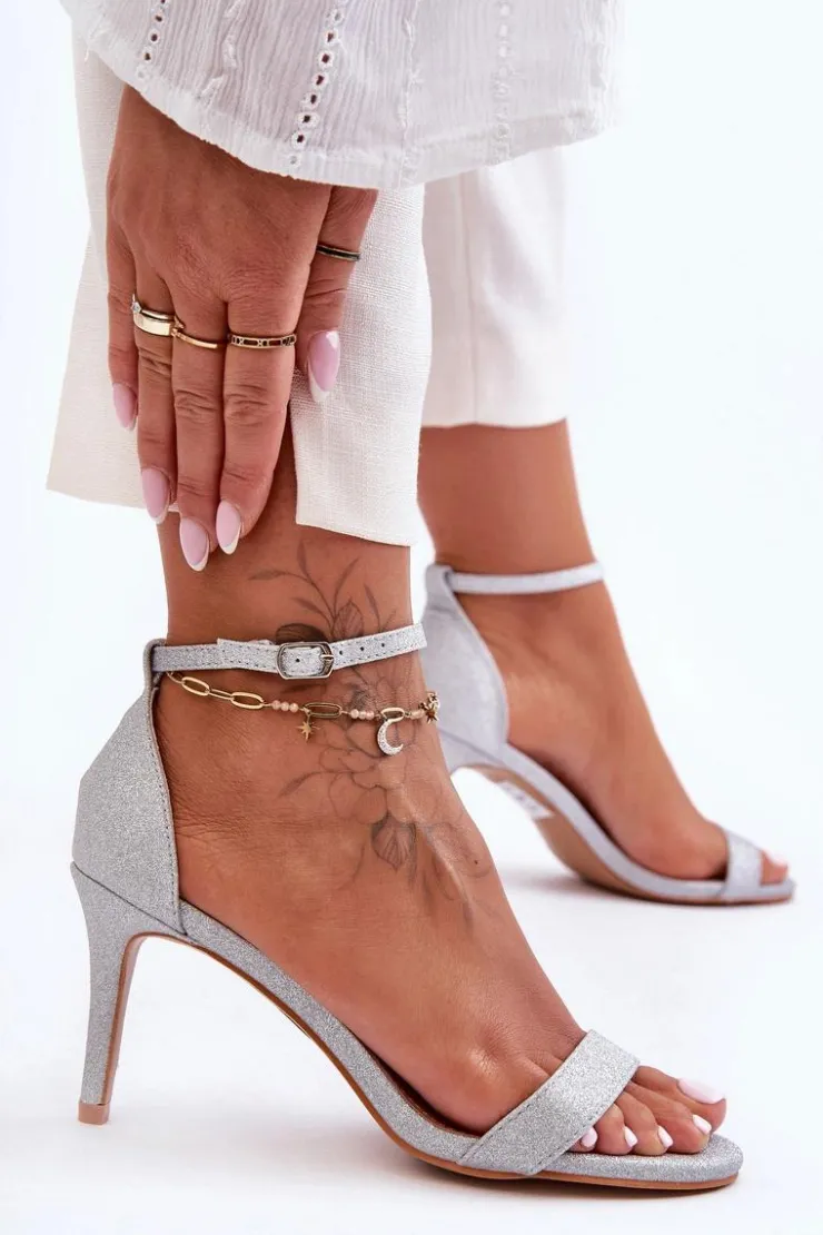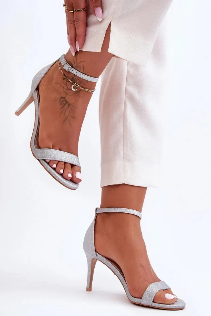 Klasyczne, brokatowe sandały zostały osadzone na obcasie w postaci szpilki. Model ten posiada usztywniany zapiętek oraz zapięcie na cienki pasek ze sprzączką. Wysoki obcas i miękka, eko skórzana wkładka zapewni dobre samopoczucie oraz gustowny wygląd. Przy wyborze rozmiaru prosimy sugerować się tabelą rozmiarów.