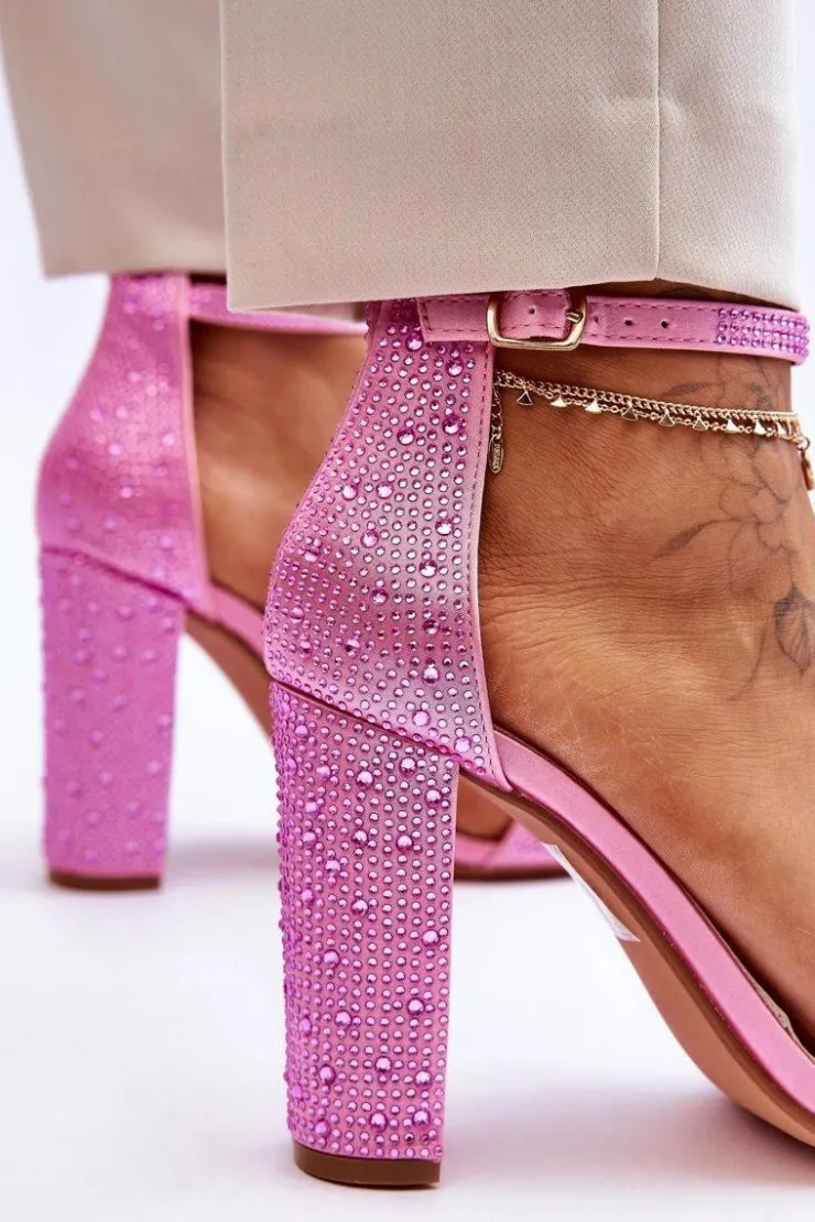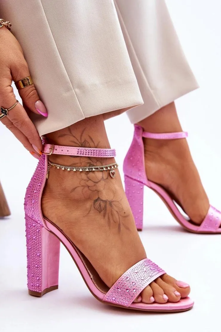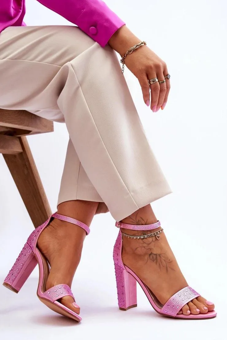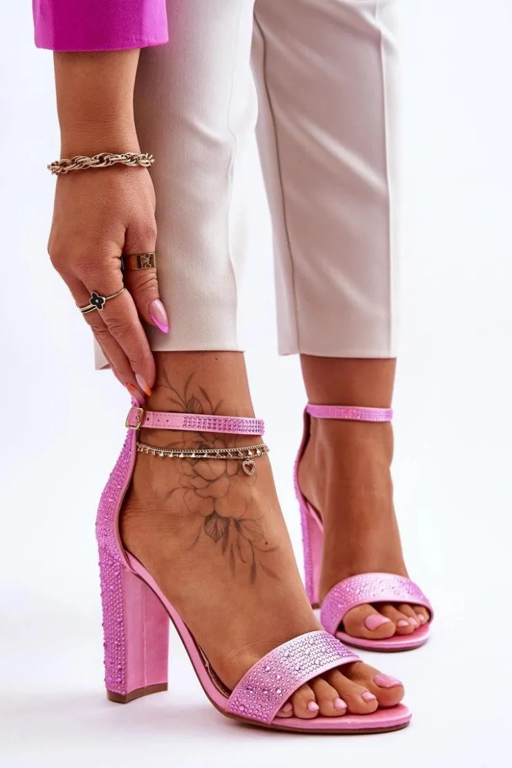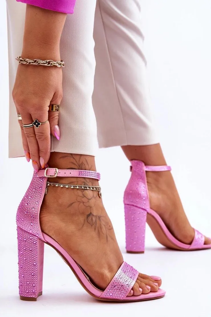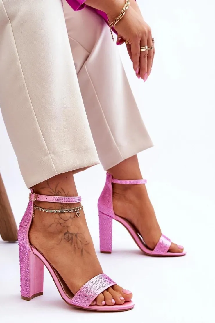 Sandały damskie zostały osadzone na obcasie w postaci słupka. Zapinane na regulowany pasek ze sprzączką znajdującą się na wysokości kostki. Posiadają odkryty, zaokrąglony nosek oraz zakrytą piętą z usztywnianym zapiętkiem. Buty wykonane z materiału tekstylnego imitującego satynę. Miękka wkładka została wykonana z eko skóry. Przy wyborze rozmiaru prosimy sugerować się tabelą rozmiarów.