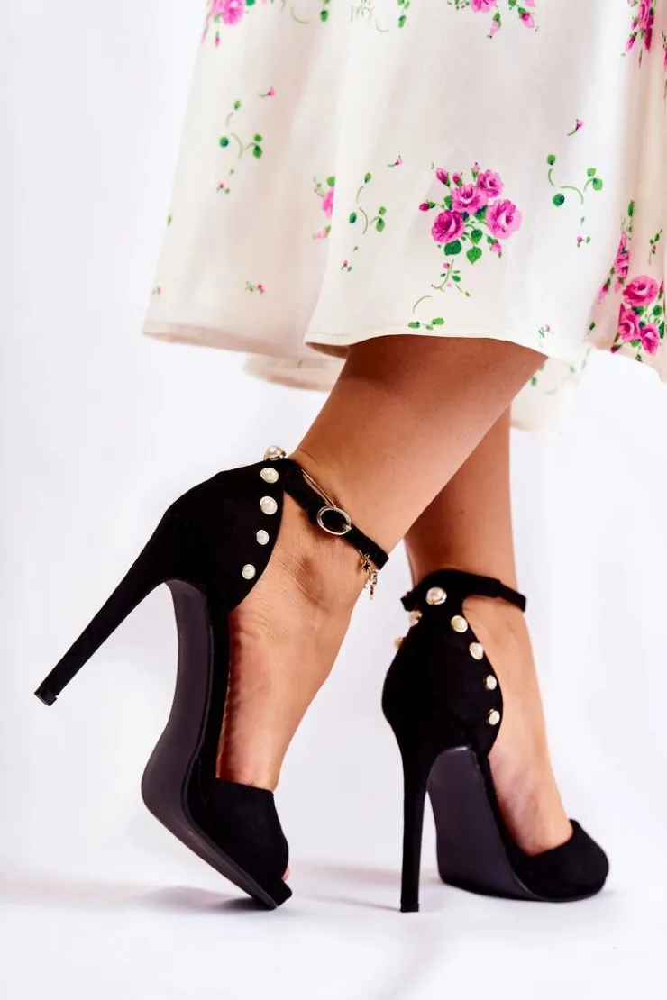 Niezwykłe sandały na klasycznym obcasie w postaci wysokiej szpilki. Wykonane z eko zamszu ze zdobieniami w postaci imitacji pereł. Nosek odkryty, zaokrąglony. Zapinane wokół kostki na regulowany pasek ze sprzączką. Wkładka z eko skóry jest miękka i wygodna w użytkowaniu. Buty posiadają usztywniany zapiętek. Model ten skradnie serce niejednej miłośniczce wysokich obcasów! Sandałki te są idealne na różnego rodzaju uroczystości, takie jak: wesela czy na randkę. Przy wyborze rozmiaru prosimy sugerować się tabelą rozmiarów.