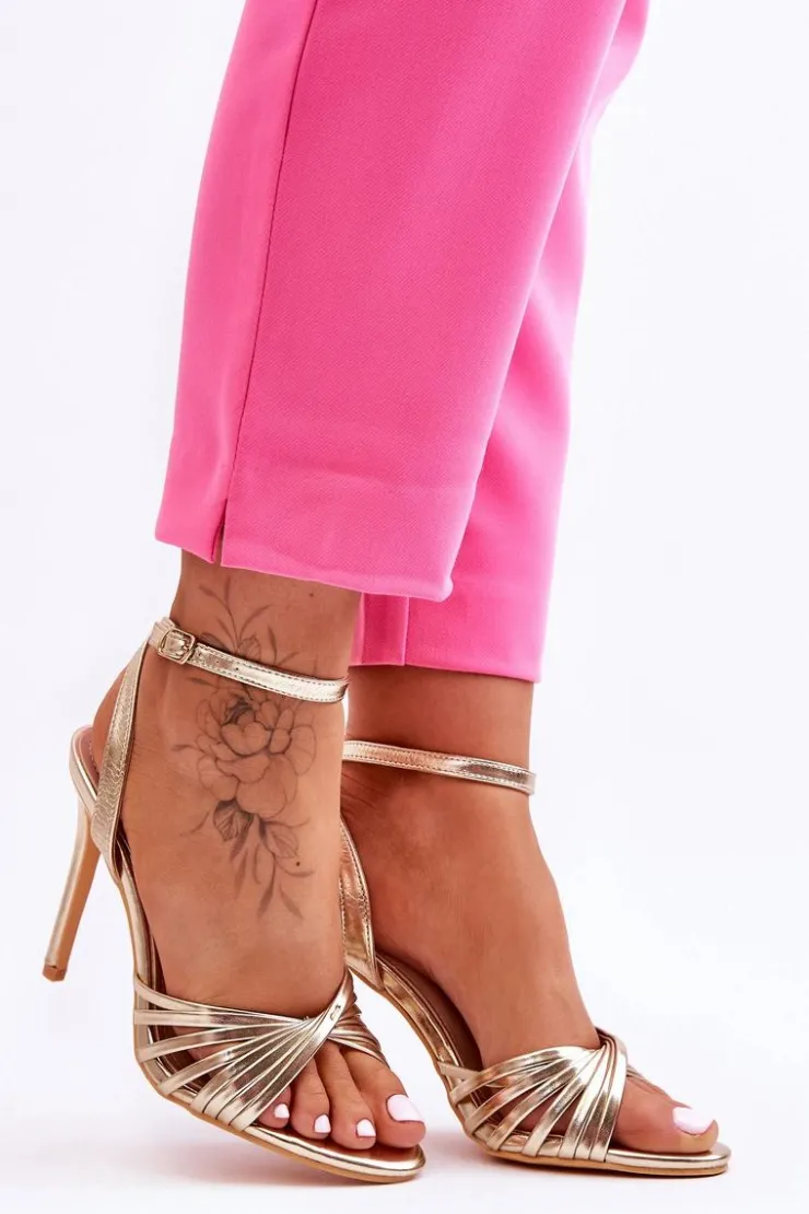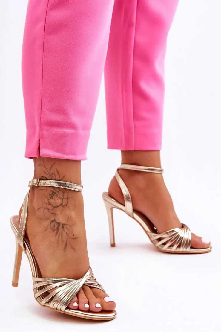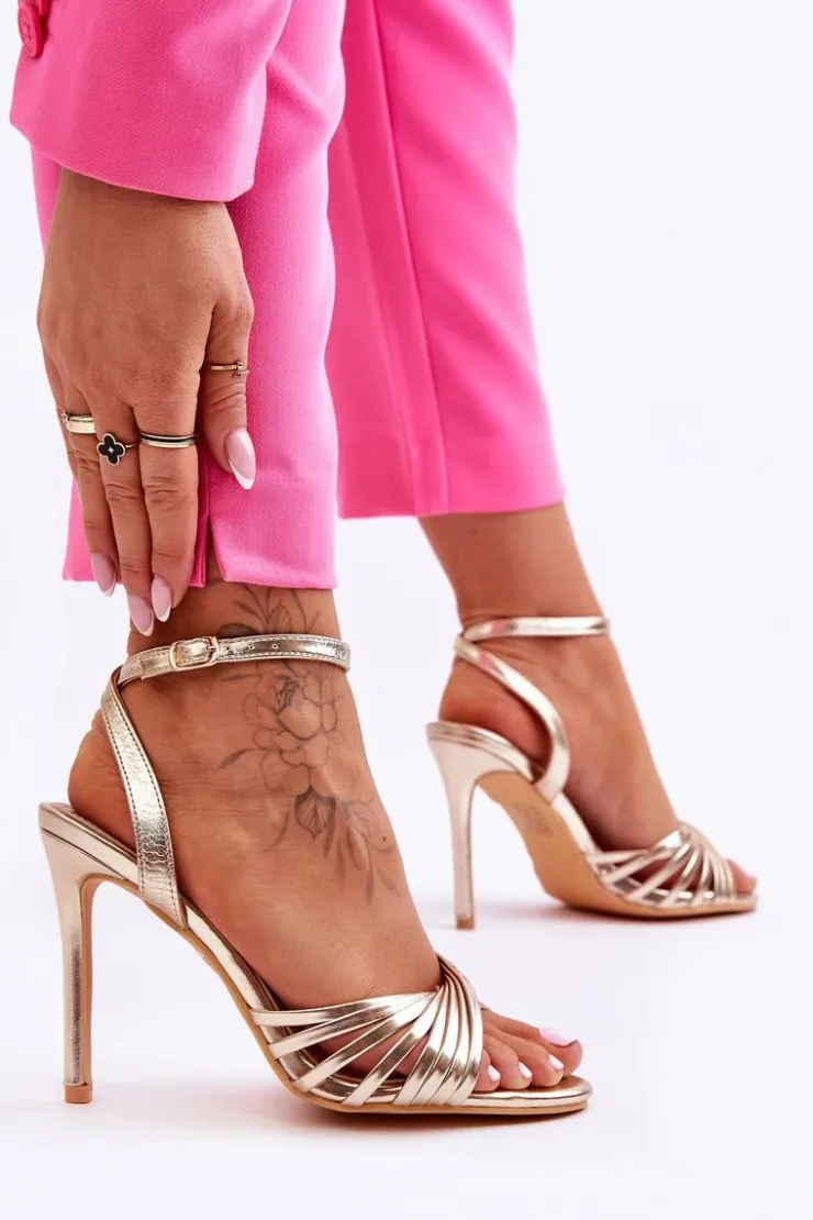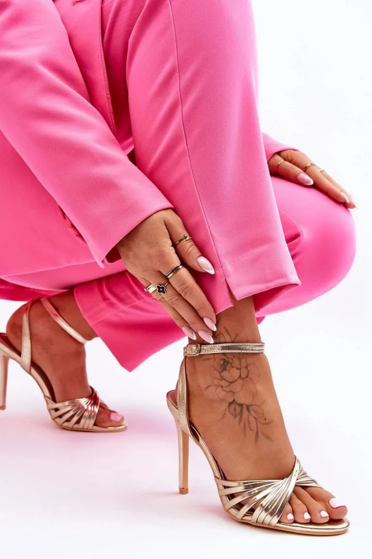 Te piękne sandałki damskie osadzono na obcasie w postaci szpilki. Model ten został wykonany z eko skóry. Sandałki posiadają na przodzie związane paseczki. Zapinane wokół kostki na regulowany pasek ze sprzączką. Te eleganckie sandałki z pewnością sprawdzą się w wielu stylizacjach na różnego rodzaju imprezy, spotkania czy uroczystości! Przy wyborze rozmiaru prosimy sugerować się tabelą rozmiarów.