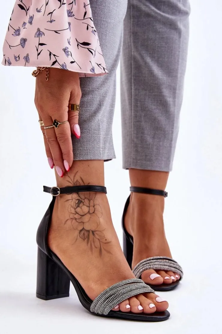 Cudowne sandały na obcasie w postaci stabilnego słupka. Zostały wykonane z eko skóry. Eleganckie zdobienia na przodzie w postaci dżetów imitujących cyrkonie. Nosek odkryty, zaokrąglony. Miękka wkładka oraz średniej wysokości obcas zapewnią komfort podczas użytkowania. Buty posiadają regulowany pasek zapinany na sprzączkę wokół kostki. Model ten z pewnością wykorzystasz w wielu sytuacjach. Koniecznie sprawdź całą naszą kolekcję damskich sandałów na obcasie! Przy wyborze rozmiaru prosimy sugerować się tabelą rozmiarów.