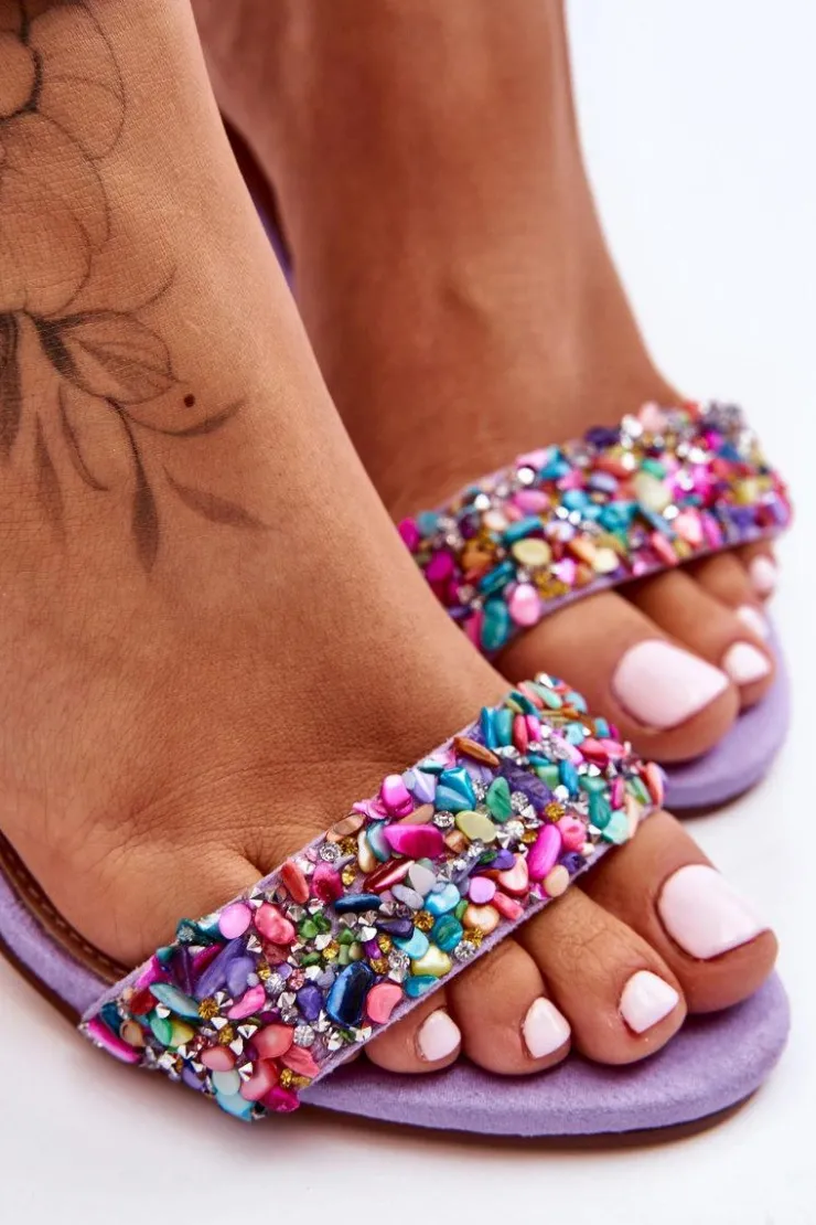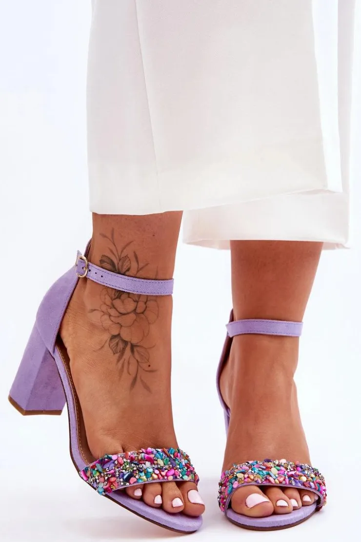 Modne sandały damskie zostały wykonane z miłego w dotyku eko zamszu. Osadzone na obcasie w postaci słupka. Paseczek na przodzie został ozdobiony modnymi kamieniami, co dodaje tym butom elegancji. Miękka wkładka z eko skóry zadba o Twój komfort podczas użytkowania. Model ten świetnie sprawdzi się na różnego rodzaju ważnych uroczystościach czy spotkaniach biznesowych. Przy wyborze rozmiaru prosimy sugerować się tabelą rozmiarów.