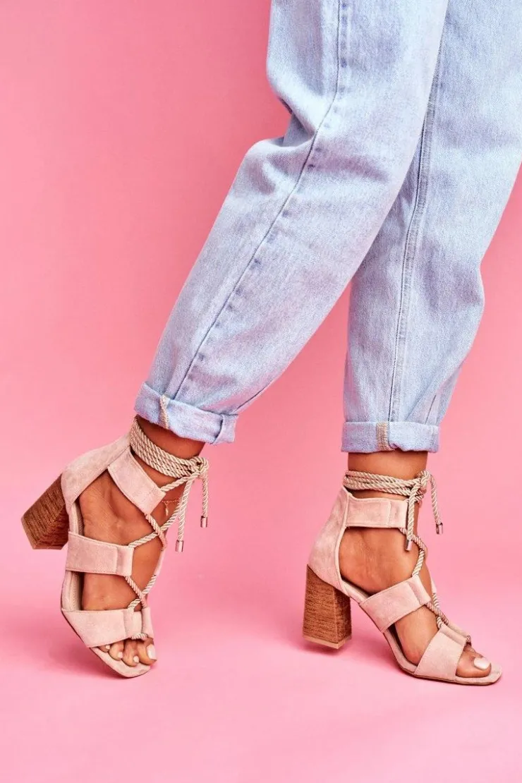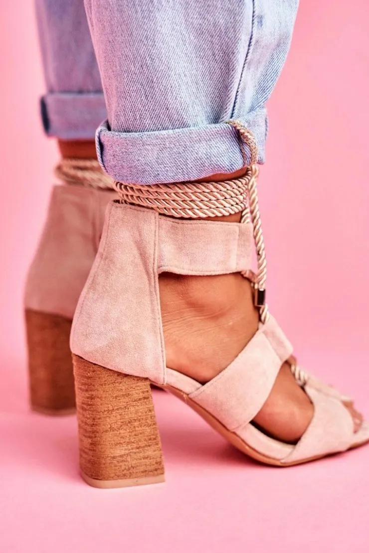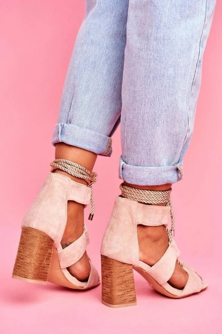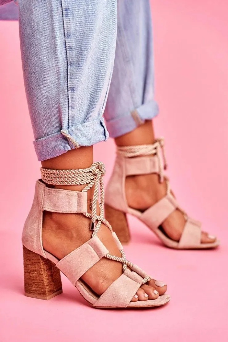 Boto Sandały Na Obcasie*Sandały Damskie Na Słupku Wiązane Zamszowe Beżowe Amore