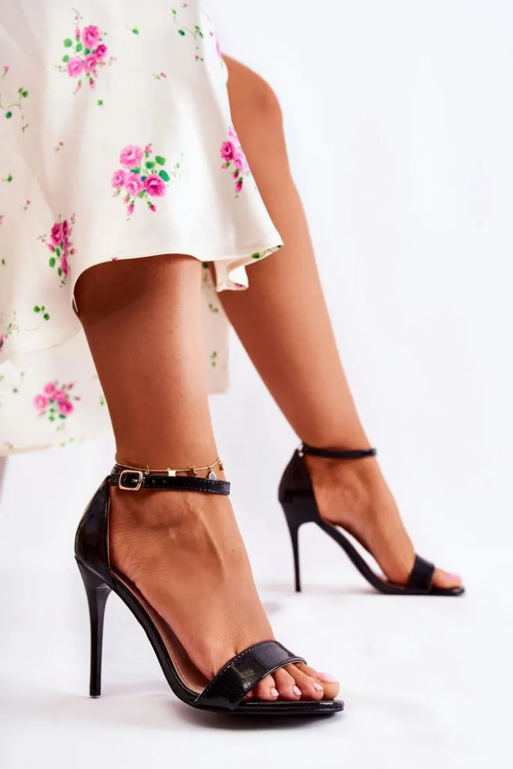 Klasyczne sandały na szpilce wykonane z eko skóry. Posiadają delikatnie usztywniany zapiętek. Model z odkrytym, zaokrąglonym noskiem. Sandały są zapinane wokół kostki na regulowany pasek ze sprzączką. Miękka wkładka wykonana z eko skóry pozwoli na komfortowe użytkowanie. Te buty idealnie sprawdzą się podczas różnego rodzaju uroczystości. Przy wyborze rozmiaru prosimy sugerować się tabelą rozmiarów.