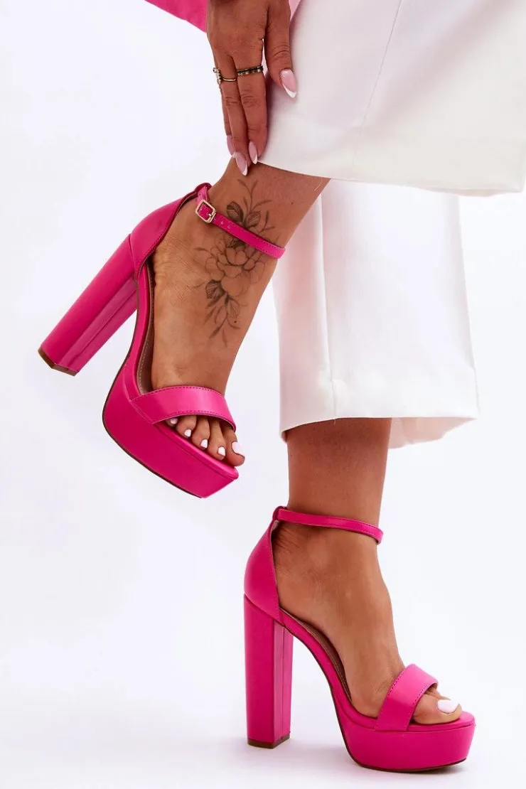 Damskie sandałki zostały wykonane z eko skóry. Model ten posiada na przodzie pasek przytrzymujący stopę przed przesuwaniem. Sandałki osadzono na obcasie w postaci wysokiego słupka oraz platformie. Dodatkowo sandałki posiadają usztywniany zapiętek. Model ten jest zapinany na regulowany pasek ze sprzączką. Przy wyborze rozmiaru prosimy sugerować się tabelą rozmiarów.