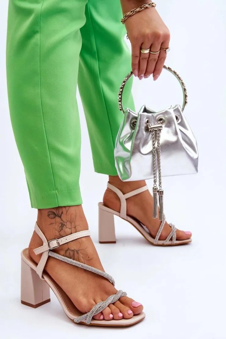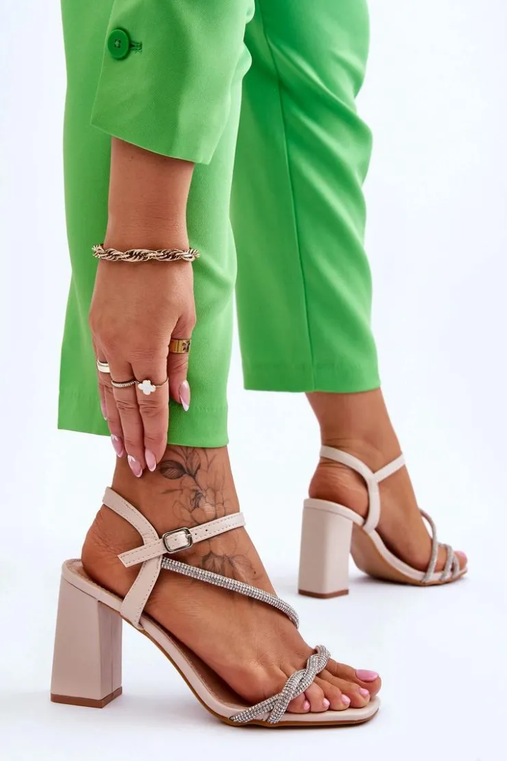 Damskie sandały zostały wykonane z eko skóry. Posiadają z przodu przeplatające się paski z dżetami imitującymi cyrkonie oraz paseczek znajdujący się na środku sandałek. Wygodna wkładka z eko skóry pozwoli na komfortowe użytkowanie obuwia. Buty posiadają regulowany pasek zapinany na sprzączkę wokół kostki. Ten model powinien być Twój! Przy wyborze rozmiaru prosimy sugerować się tabelą rozmiarów.