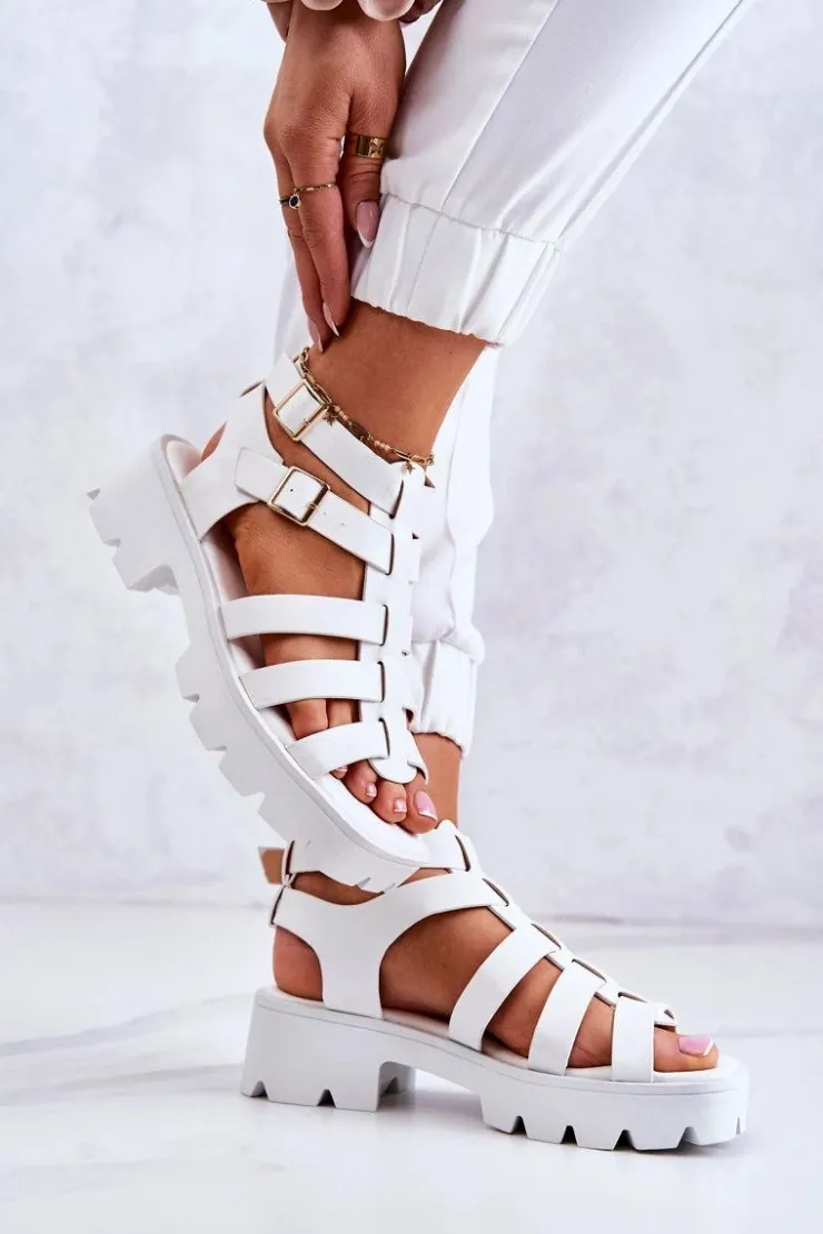 Przewiewne sandały wykonane z eko skóry. Paseczki świetnie podtrzymują stopę. Zapinane na regulowane paski ze sprzączką. Sandałki posiadają odkryty, kwadratowy nosek oraz odkrytą piętę. Miękka, eko skórzana wkładka zapewni wygodę podczas użytkowania. Płaski, masywny obcas oraz platforma sprawiają, że buty są niezwykle stabilne. Te sandałki to idealny fason na upalne dni. Świetnie będą prezentować się z zarówno ze spodniami, jak i sukienkami. Przy wyborze rozmiaru prosimy sugerować się tabelą rozmiarów.