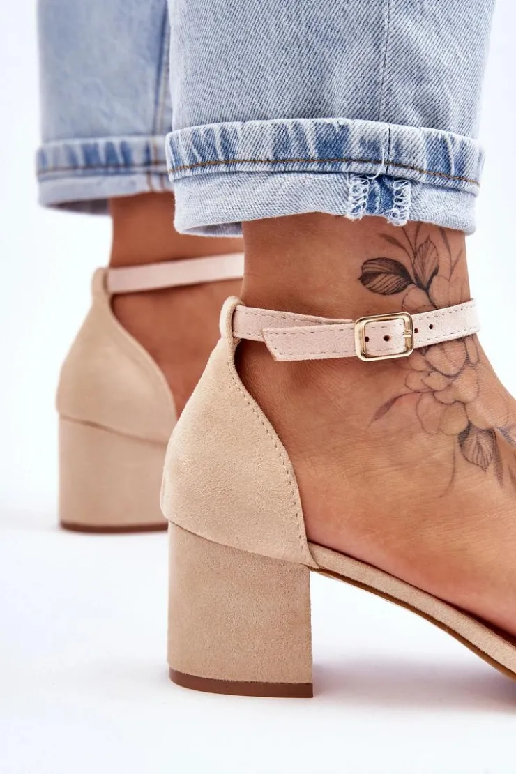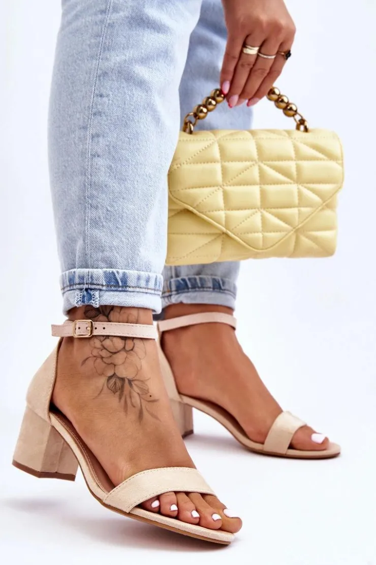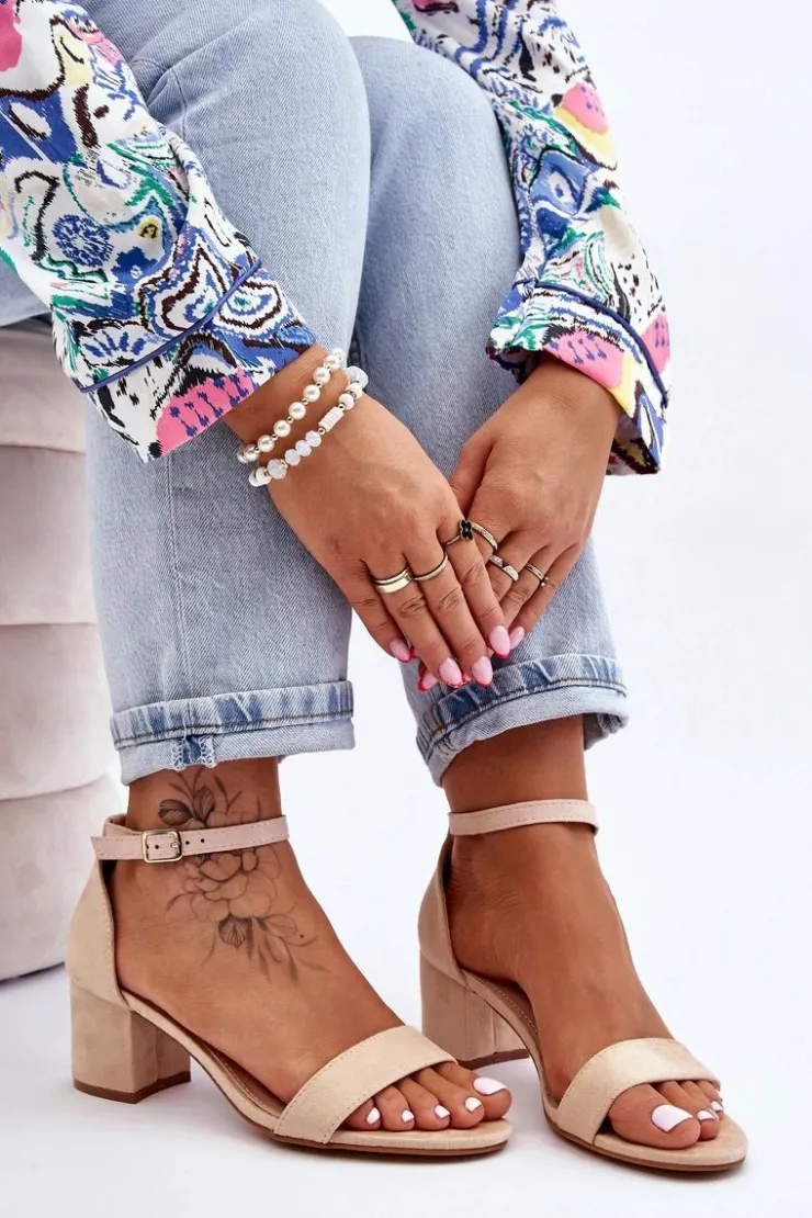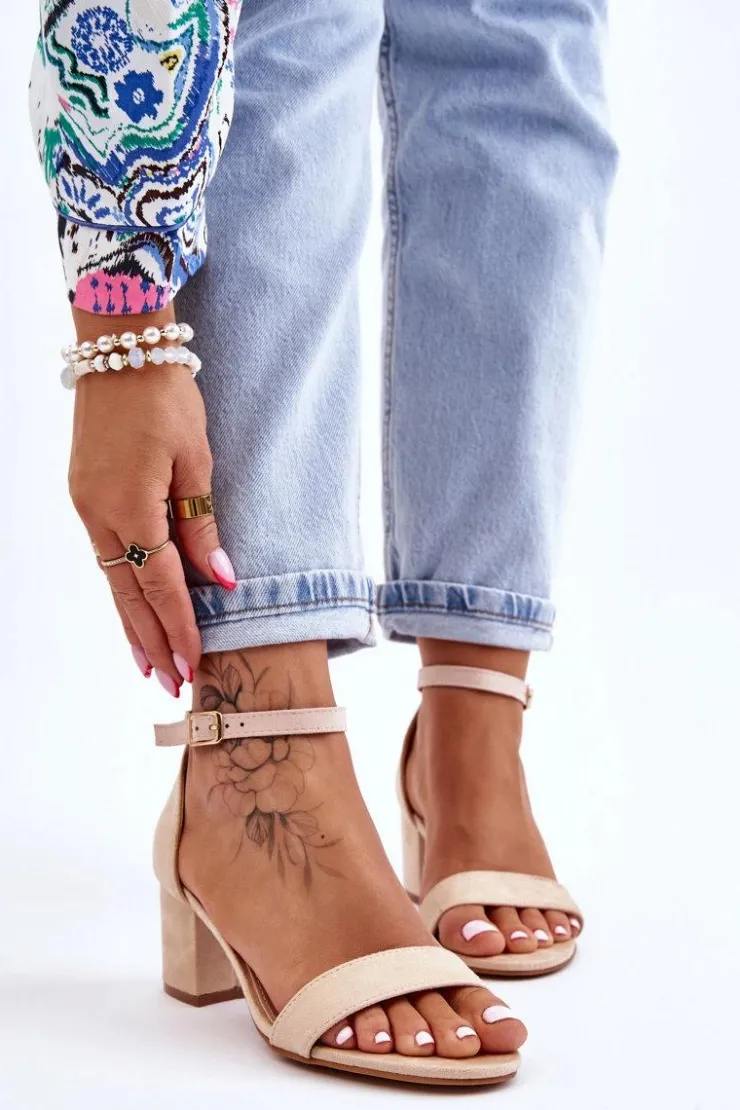 Wyjątkowe sandałki na niewysokim obcasie w postaci stabilnego słupka. Wykonane z przyjemnego w dotyku eko zamszu. Sandałki te posiadają usztywniany zapiętek. Wkładka wykonana z eko skóry zapewni komfortowe użytkowanie. Nosek odkryty, zaokrąglony. Zapinane wokół kostki na regulowany pasek ze sprzączką. Na pewno wykorzystasz je w wielu sytuacjach! Przy wyborze rozmiaru prosimy sugerować się tabelą rozmiarów.