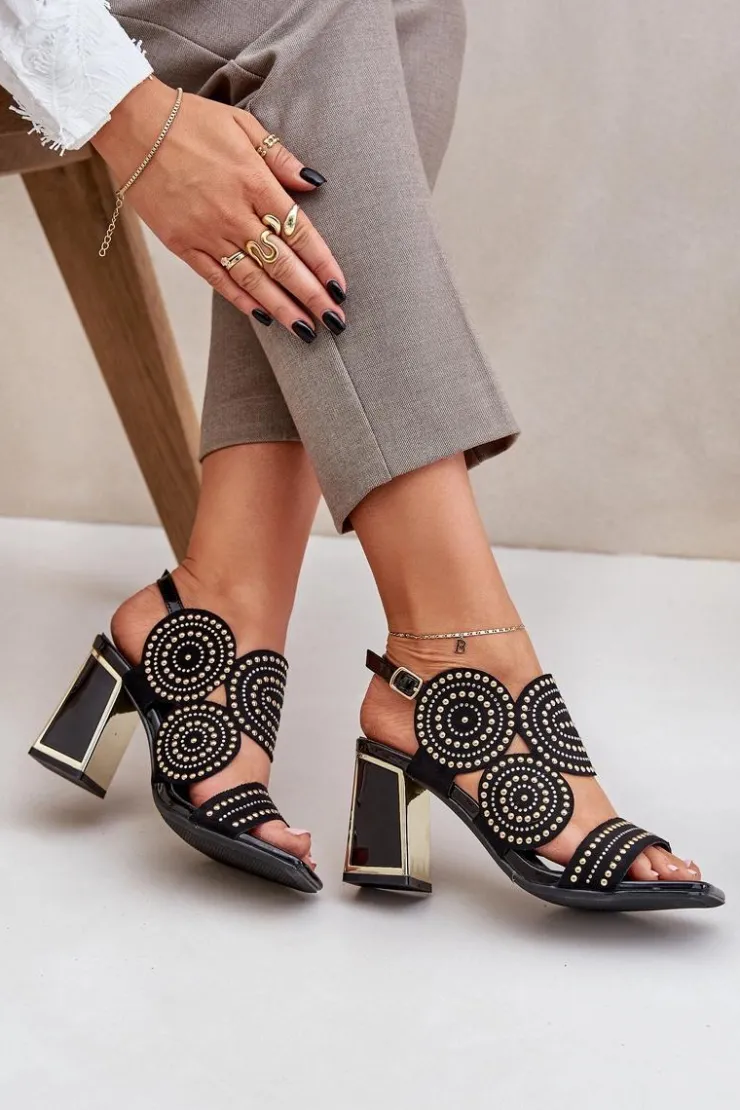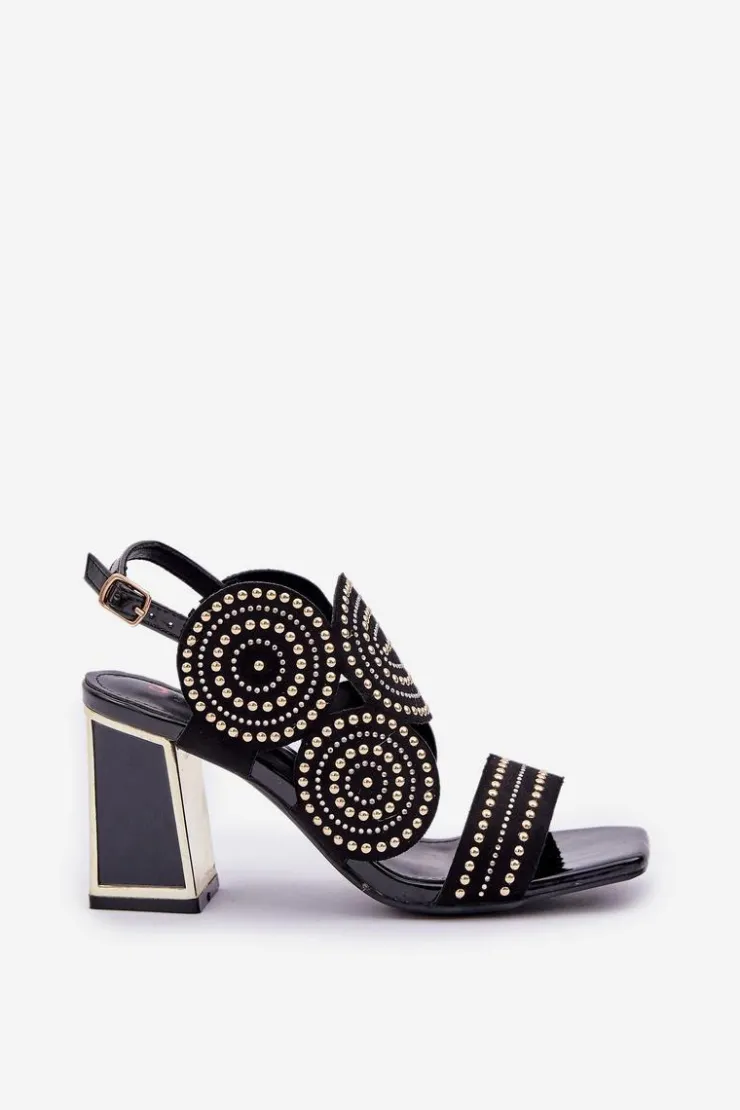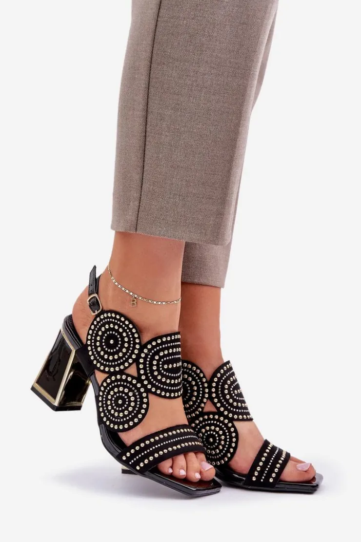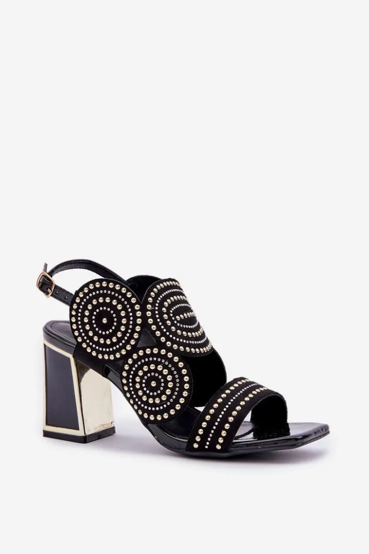 Sandały damskie wykonane z eko zamszu. Osadzone na obcasie słupku z lustrzanym złotym elementem. Zdobienie nadaje im wyjątkowego blasku i elegancji. Model zapinany na regulowany pasek ze sprzączką zapewnia idealne dopasowanie i komfort noszenia. Liczne zdobienie nadaje wyjątkowego uroku. Te sandały będą idealnym wyborem na wieczorne wyjścia oraz na specjalne okazje, łącząc wygodę z eleganckim wyglądem. Przy wyborze rozmiaru prosimy sugerować się tabelą rozmiarów.