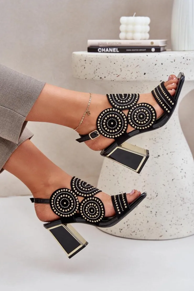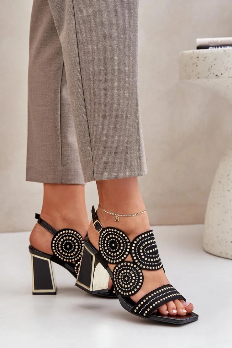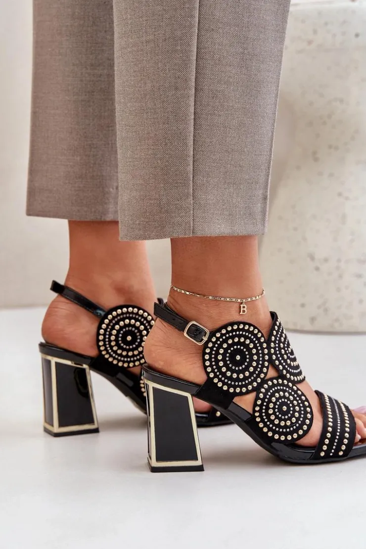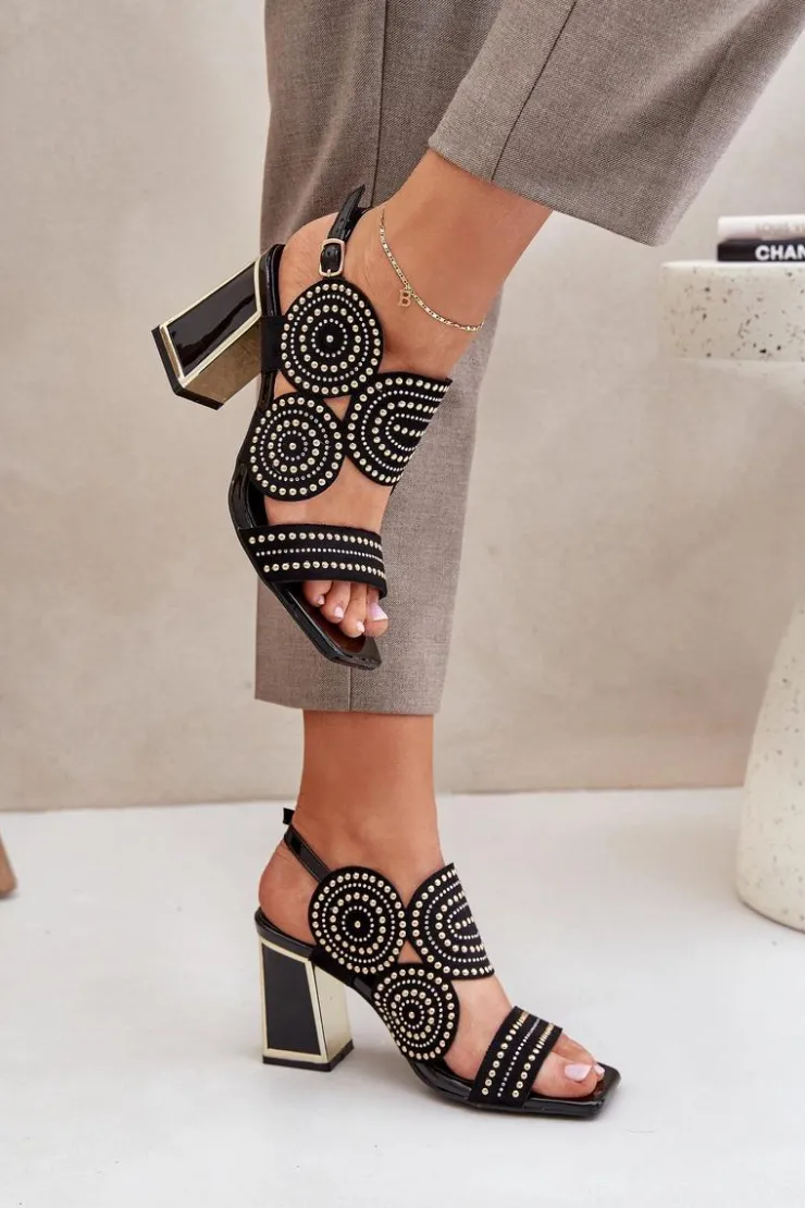 Sandały damskie wykonane z eko zamszu. Osadzone na obcasie słupku z lustrzanym złotym elementem. Zdobienie nadaje im wyjątkowego blasku i elegancji. Model zapinany na regulowany pasek ze sprzączką zapewnia idealne dopasowanie i komfort noszenia. Liczne zdobienie nadaje wyjątkowego uroku. Te sandały będą idealnym wyborem na wieczorne wyjścia oraz na specjalne okazje, łącząc wygodę z eleganckim wyglądem. Przy wyborze rozmiaru prosimy sugerować się tabelą rozmiarów.