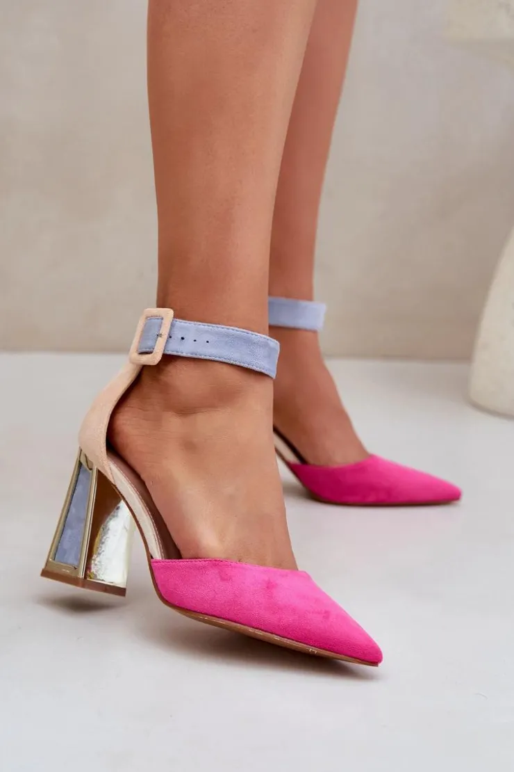 Kolorowe sandały z eko zamszu to odważna i stylowa propozycja dla kobiet, które lubią wyróżniać się w tłumie. Osadzone na obcasie słupku ze złotym, lustrzanym elementem, który dodaje im nowoczesnego blasku. Szpiczaste noski nadają im eleganckiego charakteru, a zakryta piętka oraz regulowany pasek ze sprzączką zapewniają wygodę i stabilność. Te sandały będą doskonałym wyborem na wieczorne wyjścia, imprezy czy eleganckie spotkania, łącząc wyjątkowy design z funkcjonalnością. Przy wyborze rozmiaru prosimy sugerować się tabelą rozmiarów.