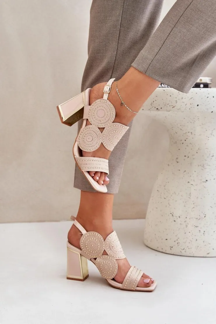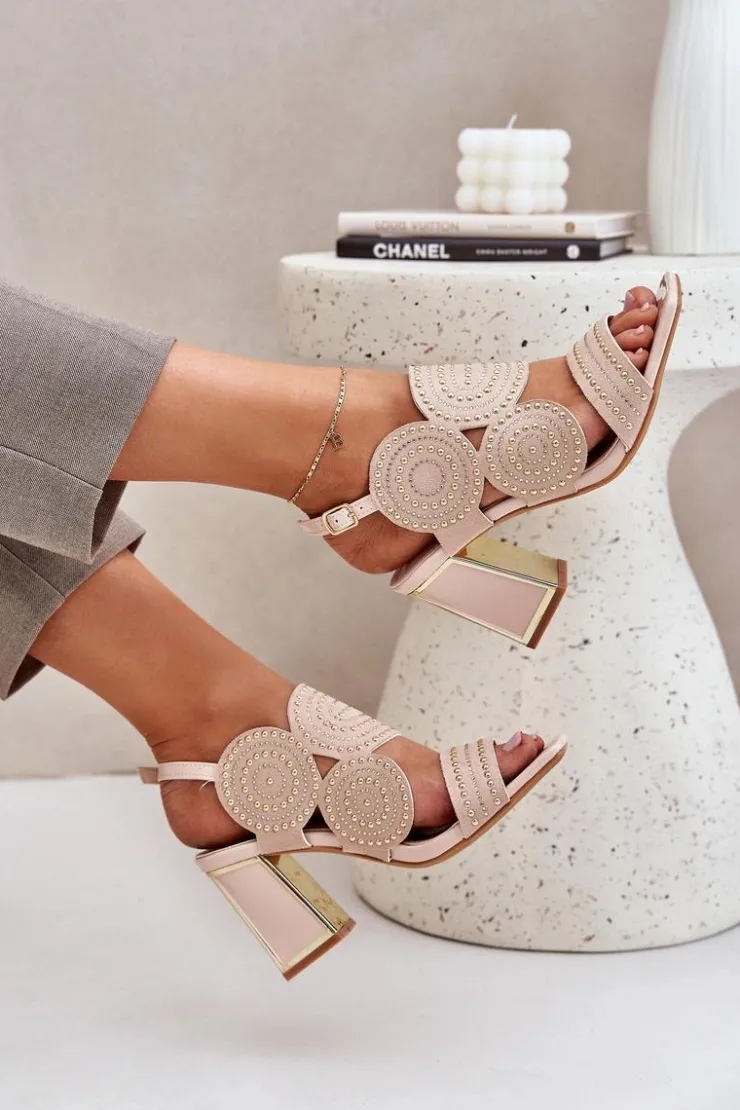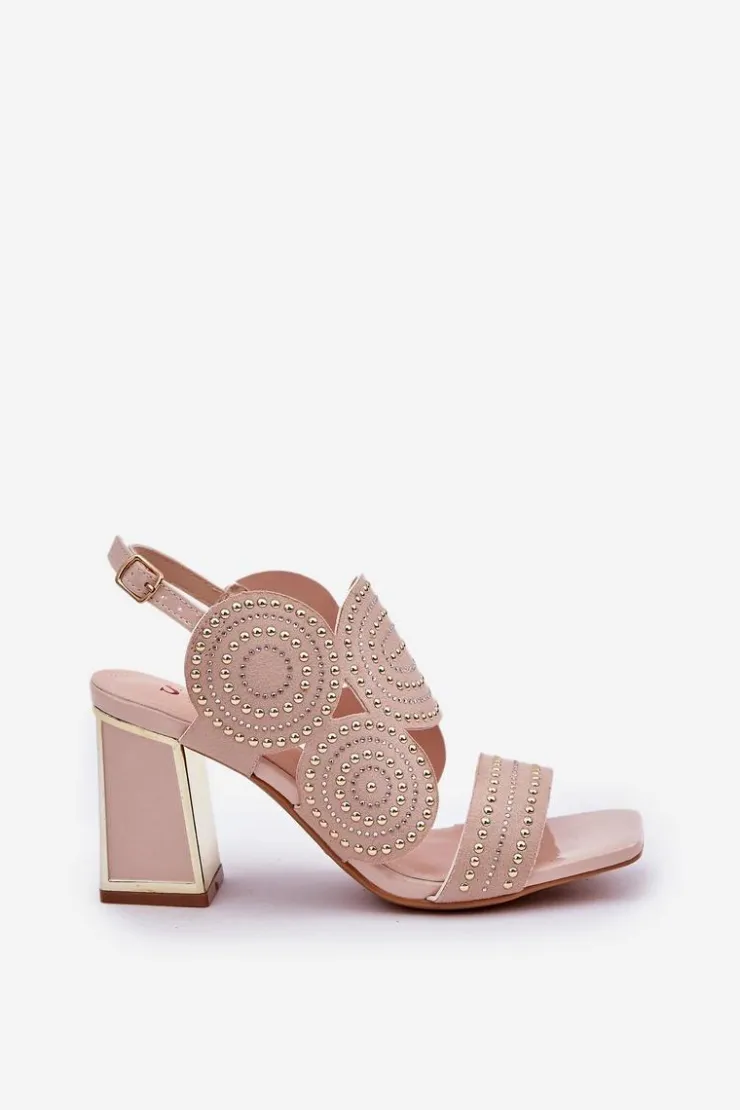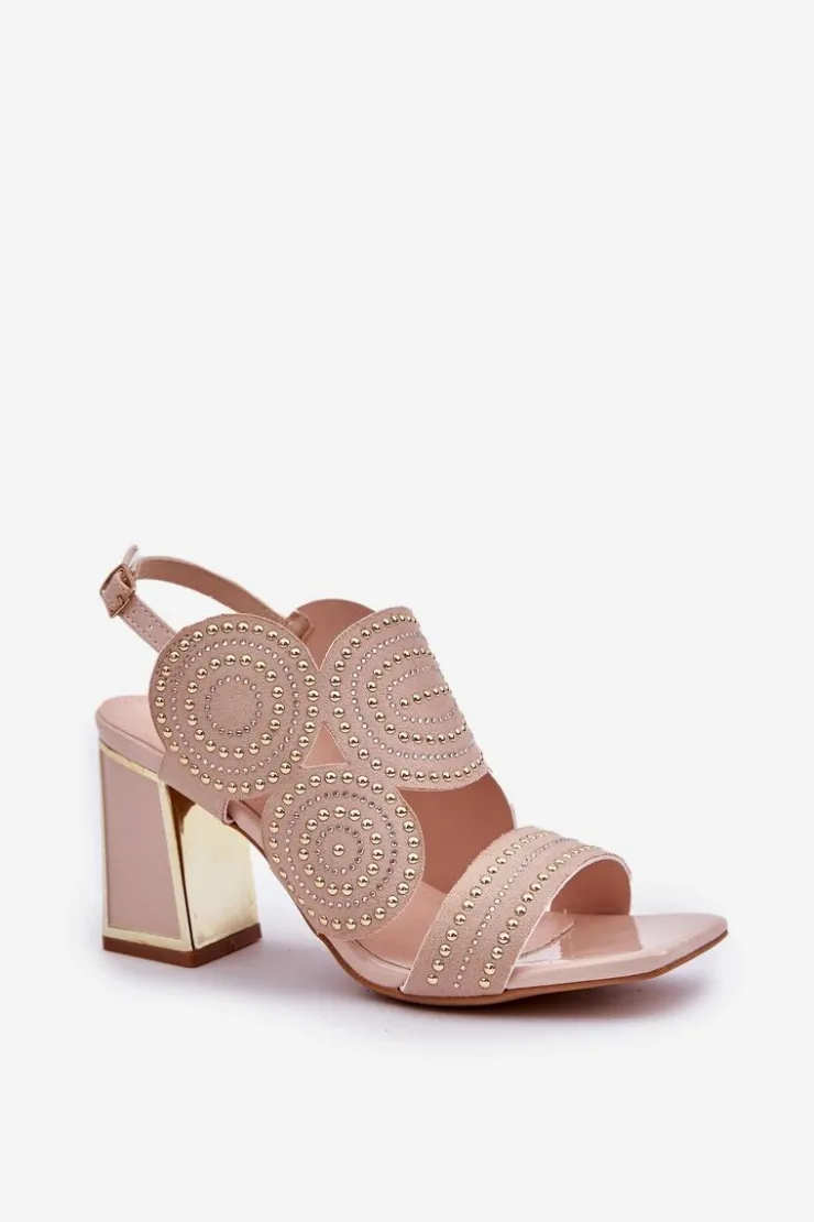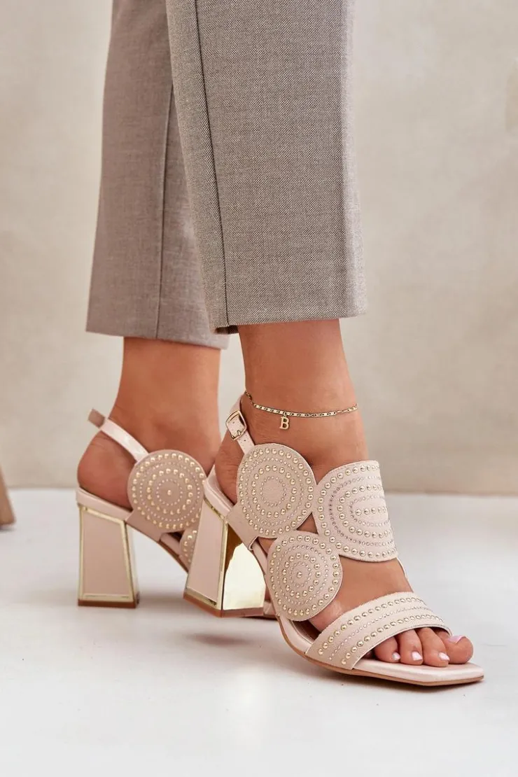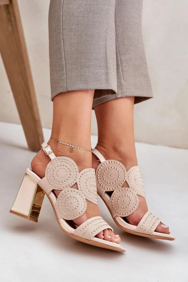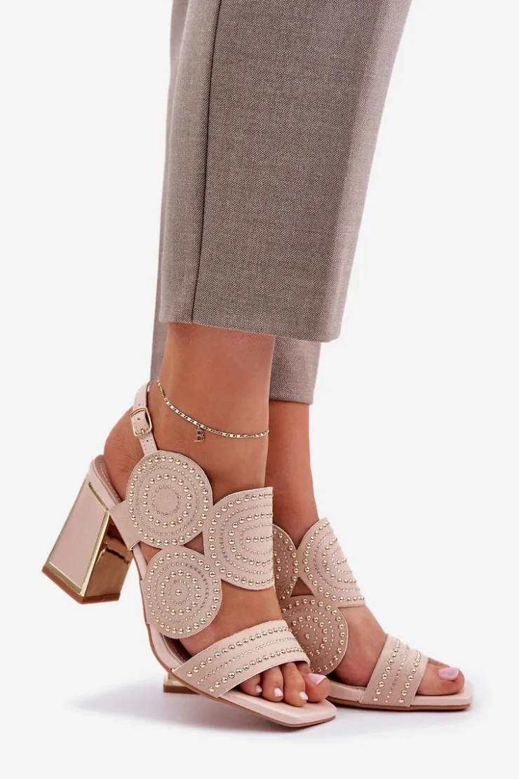 Sandały damskie wykonane z eko zamszu. Osadzone na obcasie słupku z lustrzanym złotym elementem. Zdobienie nadaje im wyjątkowego blasku i elegancji. Model zapinany na regulowany pasek ze sprzączką zapewnia idealne dopasowanie i komfort noszenia. Liczne zdobienie nadaje wyjątkowego uroku. Te sandały będą idealnym wyborem na wieczorne wyjścia oraz na specjalne okazje, łącząc wygodę z eleganckim wyglądem. Przy wyborze rozmiaru prosimy sugerować się tabelą rozmiarów.
