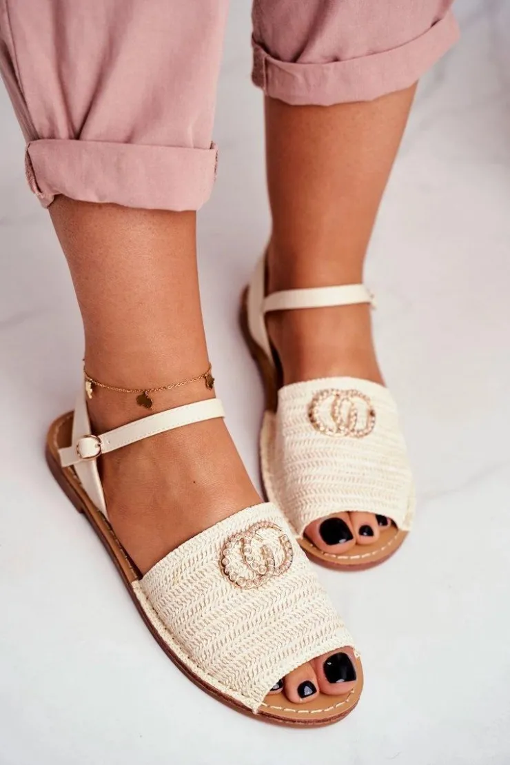 Wspaniała kolekcja nowoczesnych damskich sandałek firmy Lu Boo. Model jest ozdobiony złotym elementem z białymi perełkami, nadającym butom elegancji. Niezwykle wygodne sandałki na płaskim obcasie, których nie da się nie zauważyć! Wierzch sandałek jest pokryty plecionym materiałem – najnowszy trend tego lata! Nie zwlekaj, może zabraknąć!