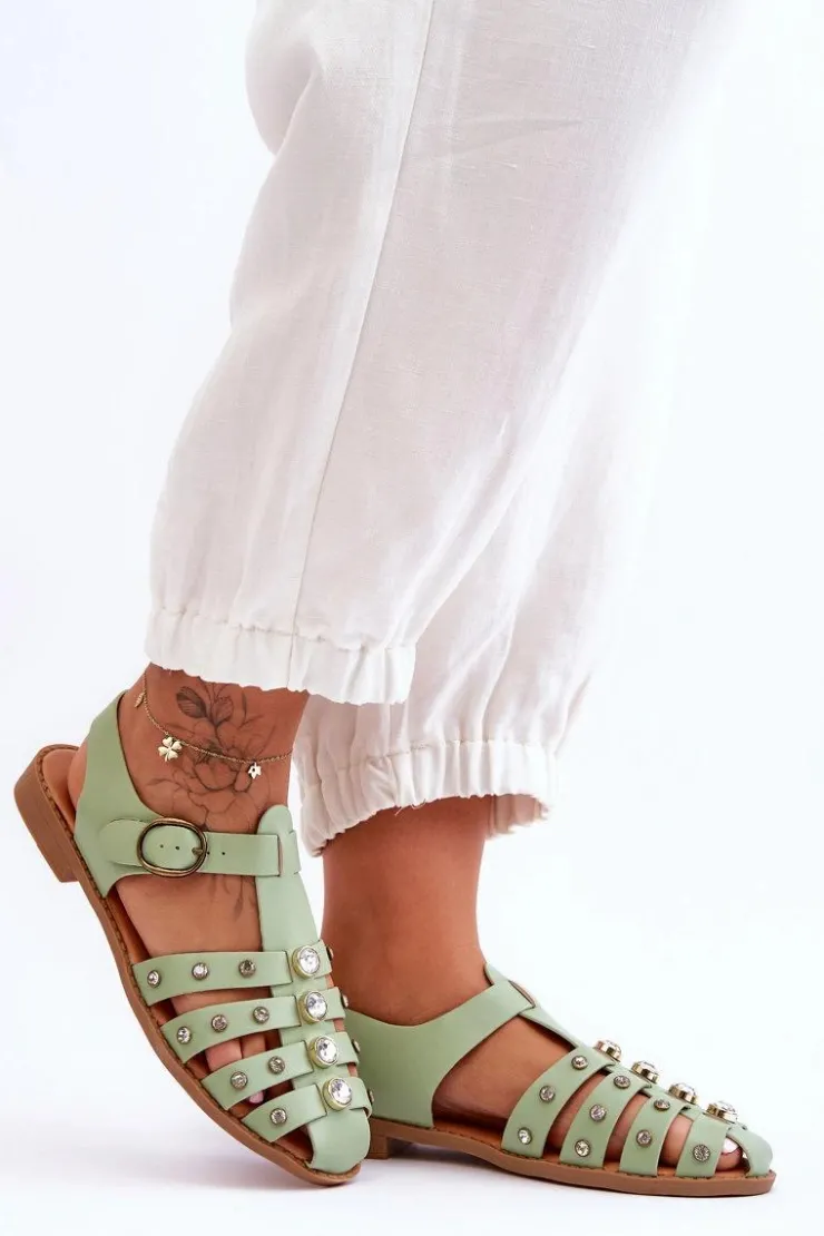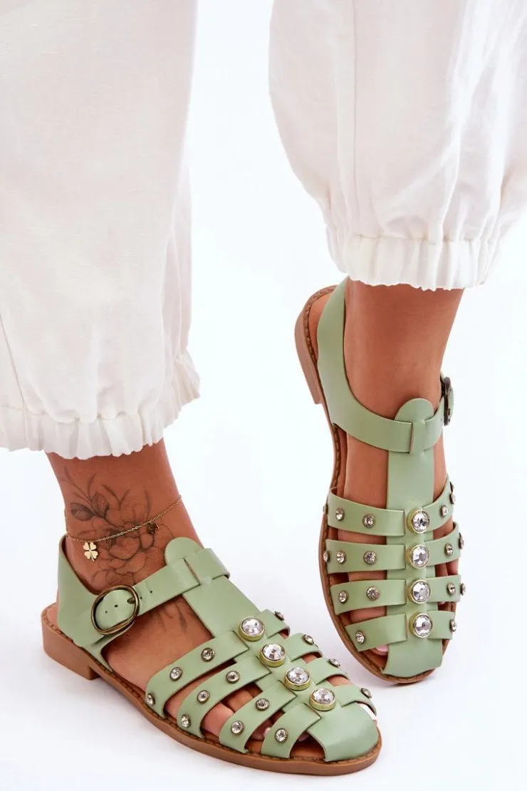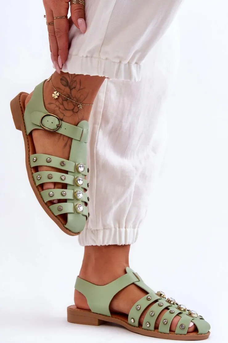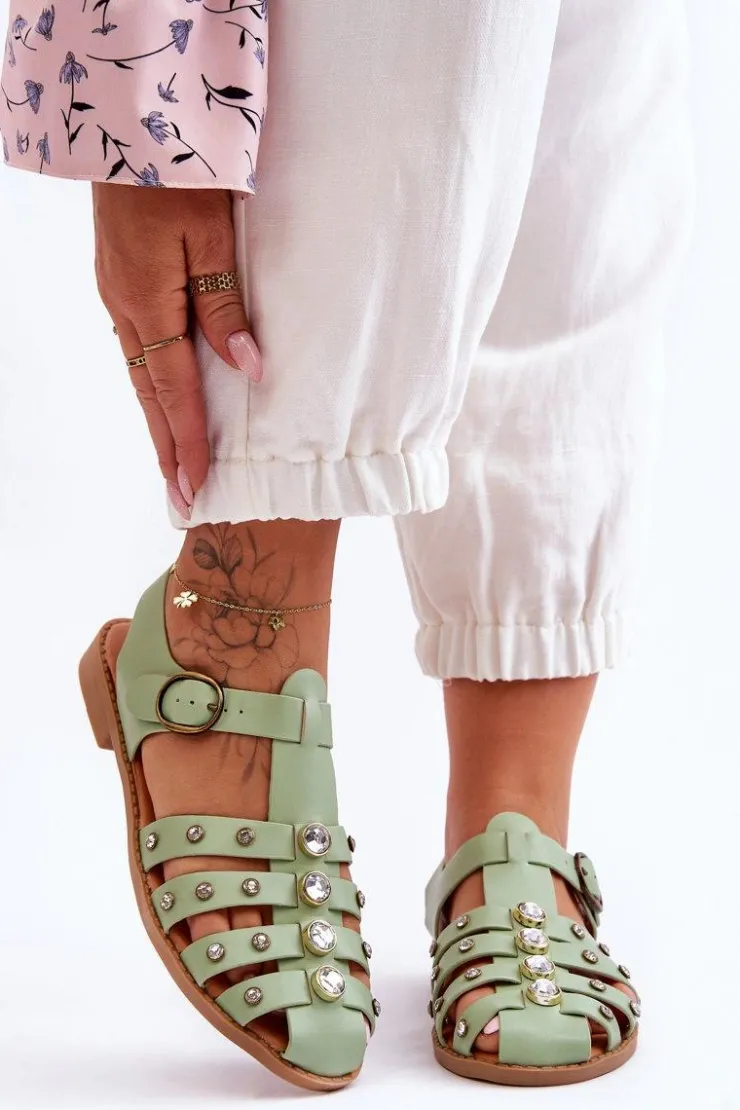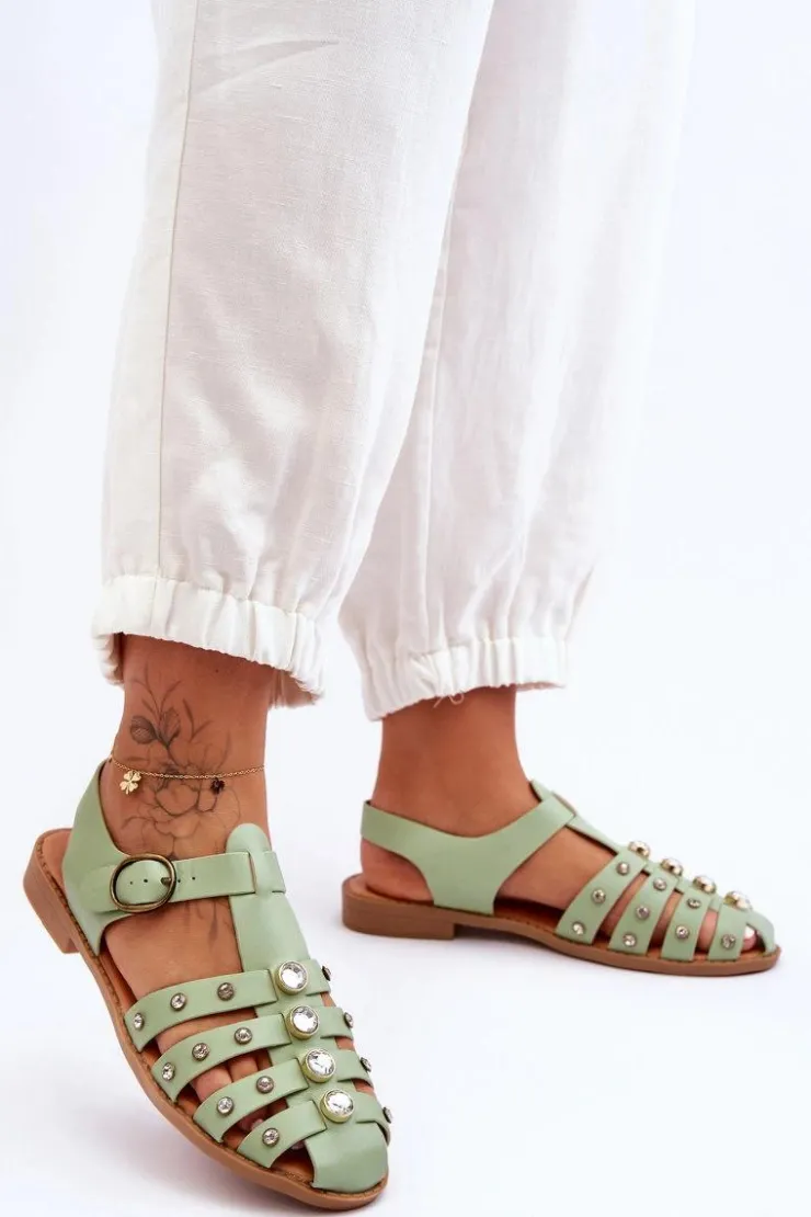 Sandały damskie zostały wykonane z eko skóry. Model ten posiada ozdobne dżety na całości cholewki imitujące cyrkonie. Klasycznie zapinane na regulowany pasek ze sprzączką. Wkładka jest miękka i wygodna podczas użytkowania. Ten niezwykle przewiewny model idealnie sprawdzi się na letnie, upalne dni! Sandałki osadzono na płaskim obcasie z antypoślizgową podeszwą. Przy wyborze rozmiaru prosimy sugerować się tabelą rozmiarów.