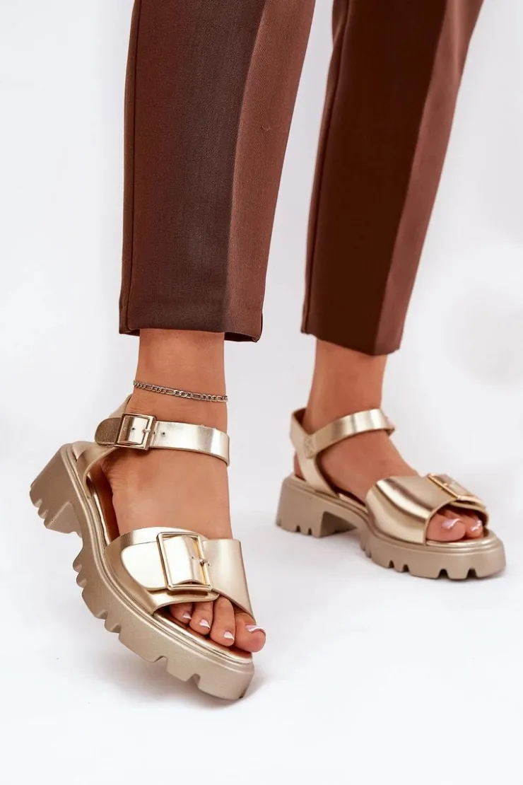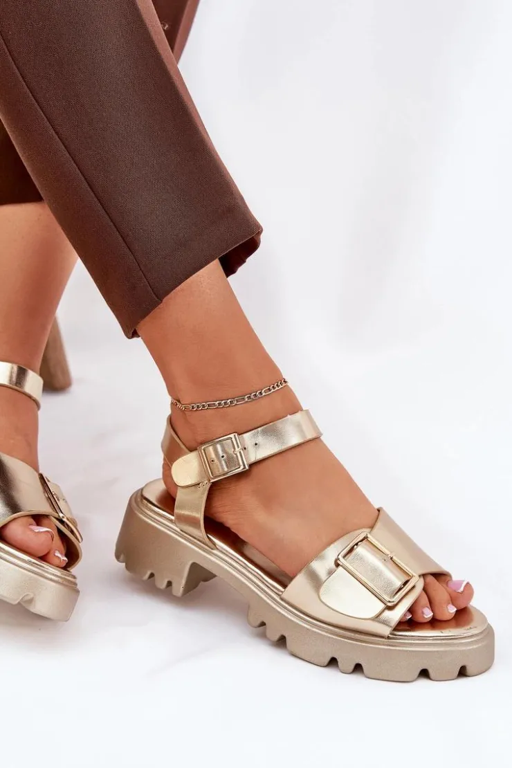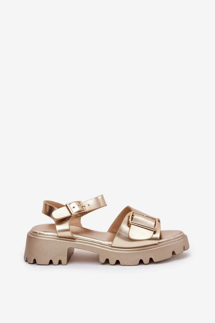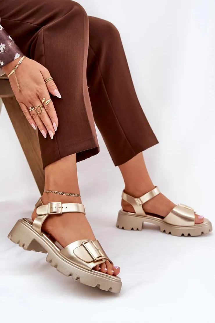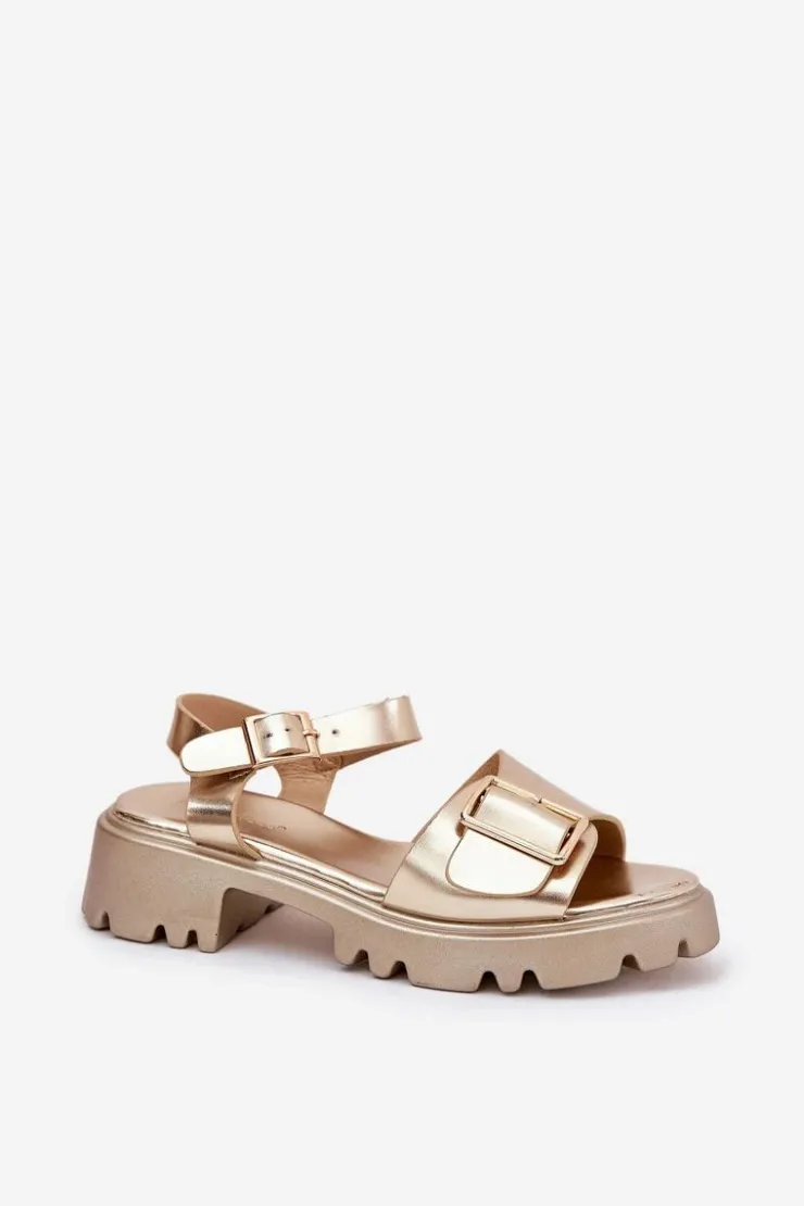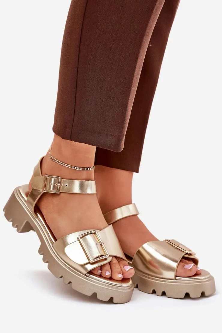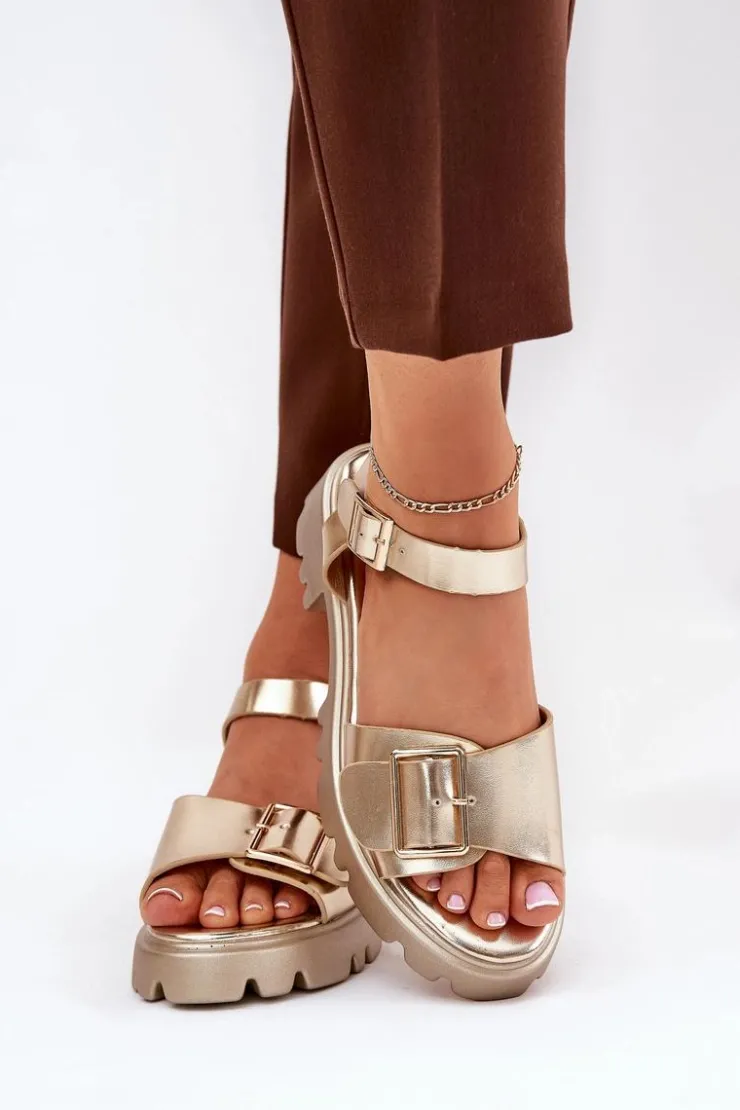 Eleganckie sandały damskie wykonane z eko skóry, osadzone na platformie oraz płaskim obcasie, które zapewniają wygodę i stabilność. Z przodu buty ozdobione zostały dużą złotą klamrą, która dodaje im subtelnej elegancji i charakteru. Zapinane na regulowany pasek ze sprzączką, co pozwala na idealne dopasowanie do stopy. Te sandały to doskonały wybór na ciepłe dni, pasujące zarówno do sukienek, jak i spodni, łącząc styl i komfort w każdej stylizacji. Przy wyborze rozmiaru prosimy sugerować się tabelą rozmiarów.