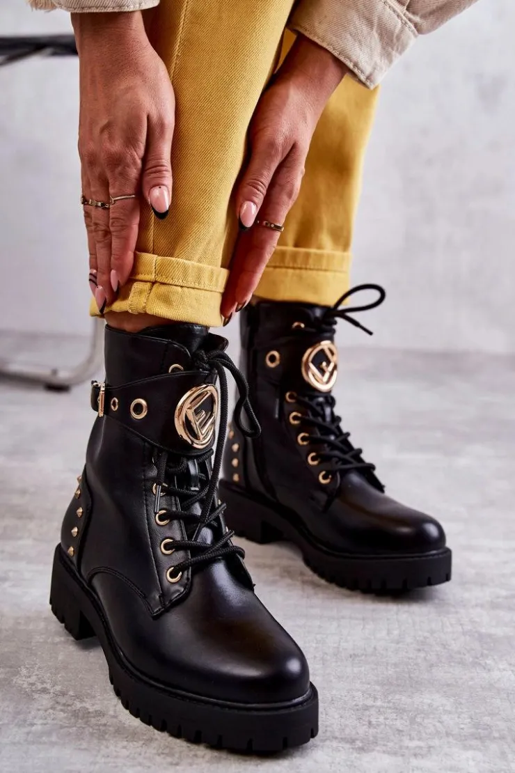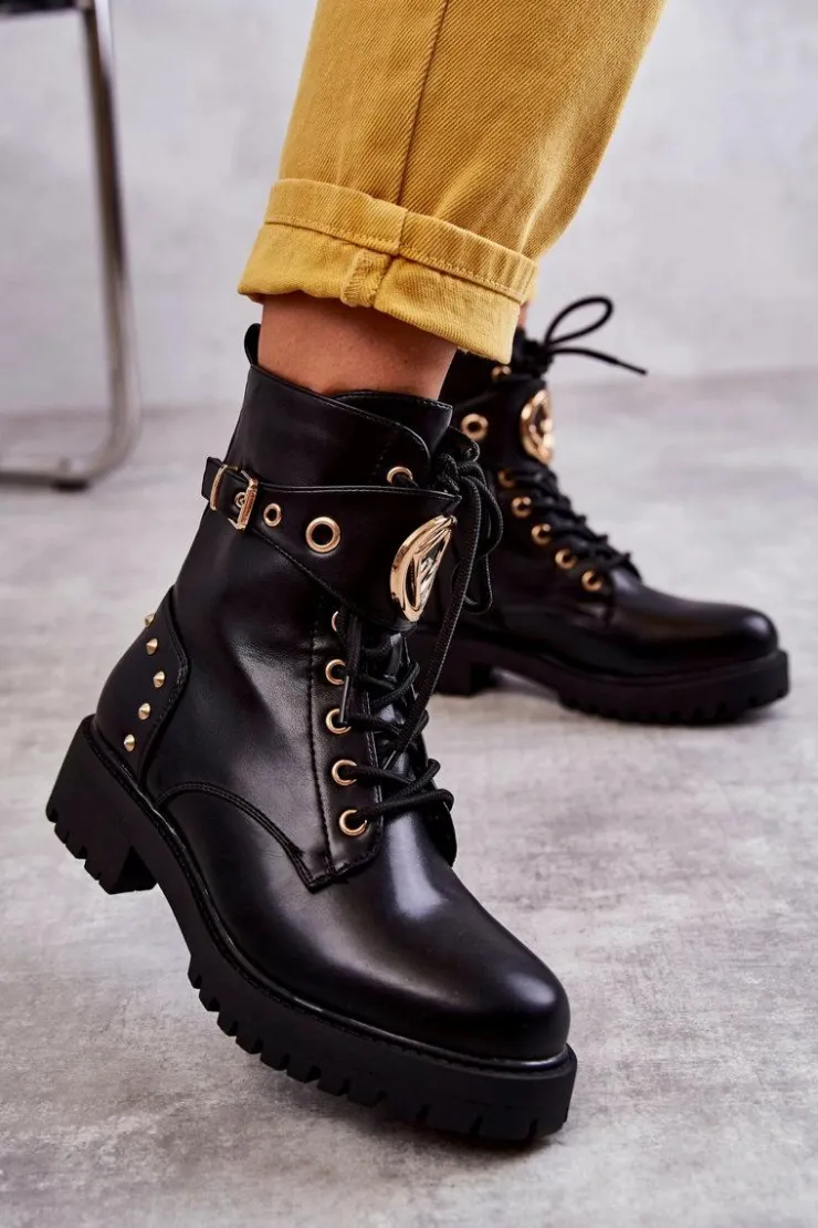 Modne damskie botki świetnie sprawdzą się podczas jesiennych stylizacji! Wykonane z eko skóry. Dodatkowo zostały przyozdobione ćwiekami oraz emblematem z tworzywa sztucznego. Botki posiadają klasyczne wiązanie oraz suwak. W środku znajduje się ocieplenie w postaci koca obuwniczego. Osadzone na płaskim obcasie oraz platformie. Przy wyborze rozmiaru prosimy sugerować się tabelą rozmiarów.