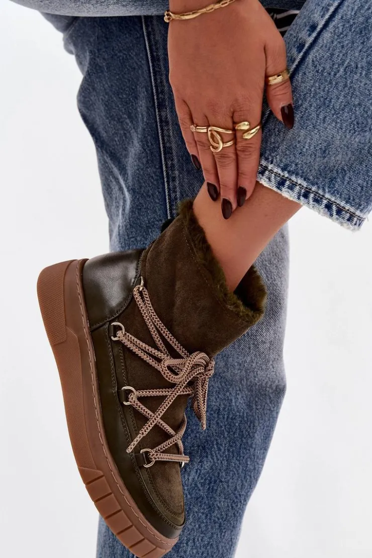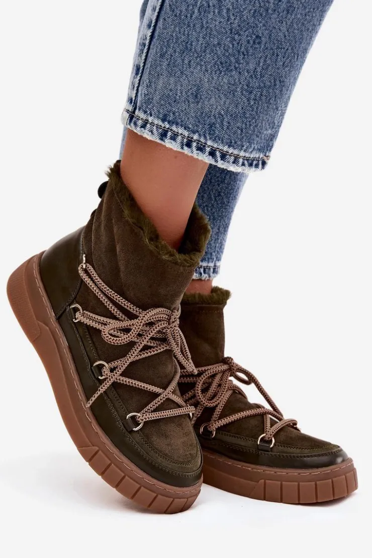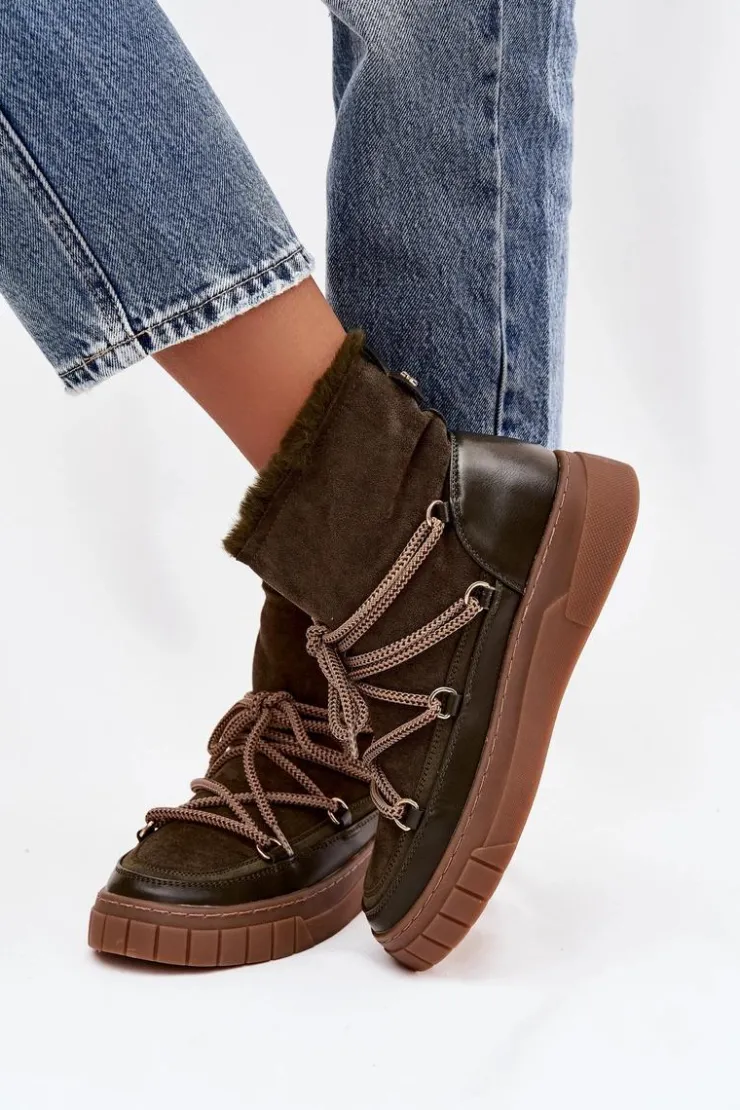 Śniegowce damskie wykonane z połączenia eko zamszu i eko skóry. Model osadzony na platformie zapewnia stabilność i doskonałą izolację od podłoża, a miękkie futerko wewnątrz gwarantuje ciepło i komfort nawet w mroźną pogodę. ,Buty są wsuwane, co ułatwia zakładanie, a wiązanie z przodu pozwala lepiej dopasować je do stopy i stanowi modny element ozdobny. Te śniegowce świetnie sprawdzą się podczas codziennych zimowych stylizacji, łącząc funkcjonalność z modnym, miejskim stylem. Przy wyborze rozmiaru prosimy sugerować się tabelą rozmiarów.