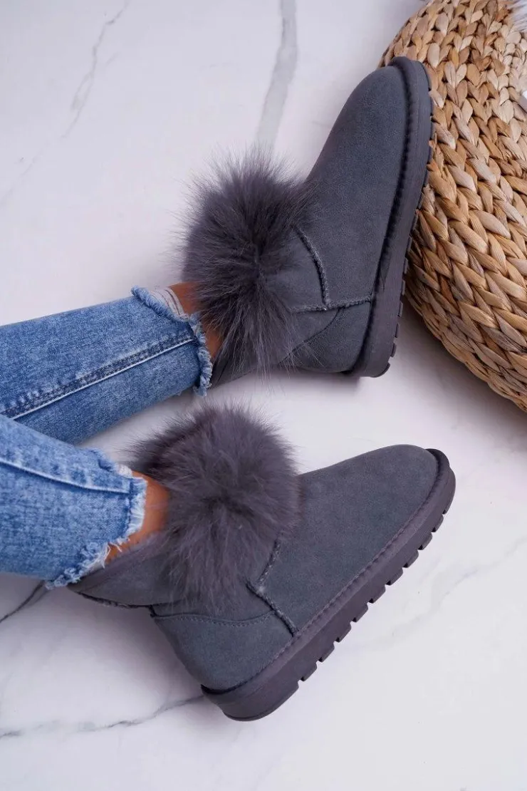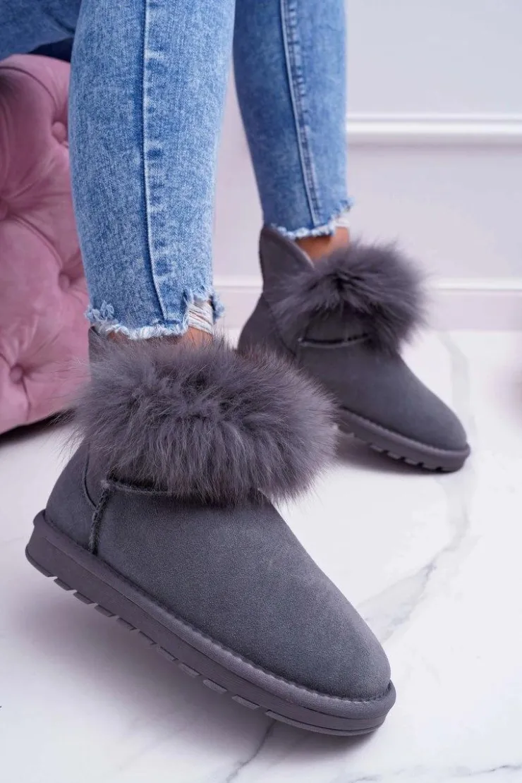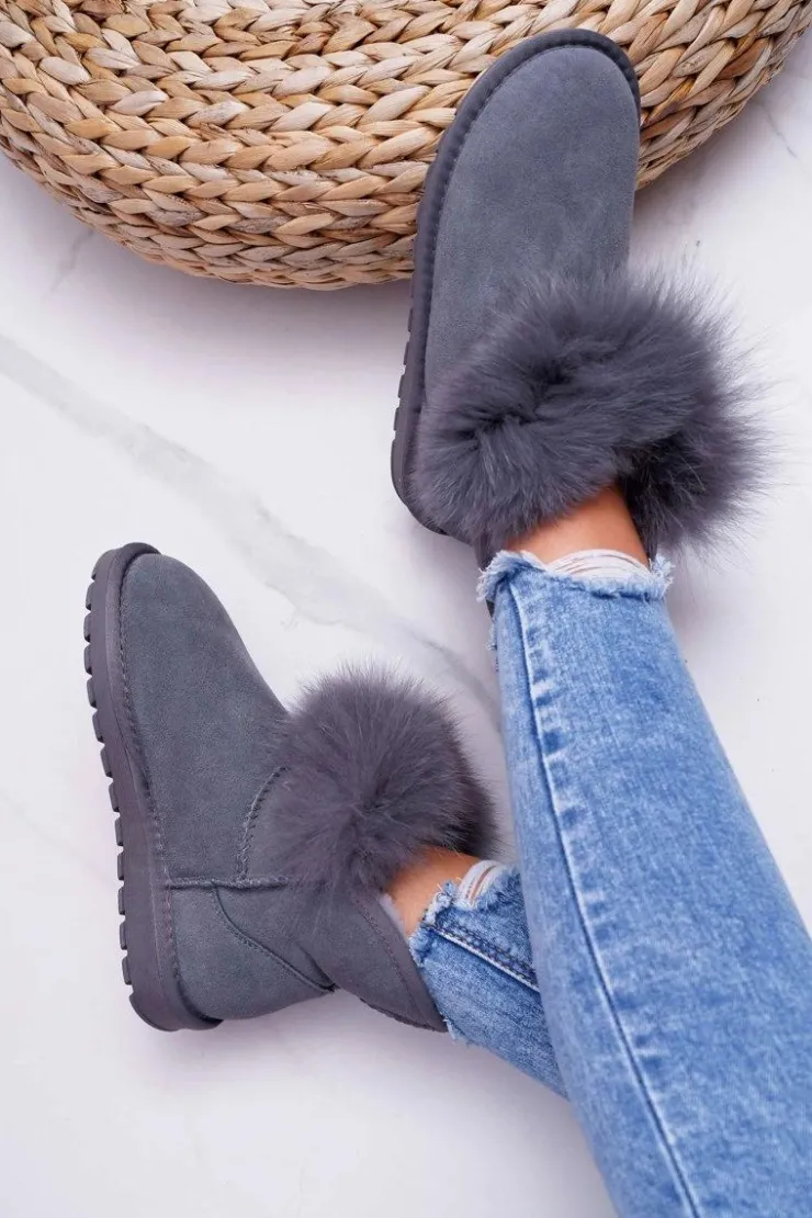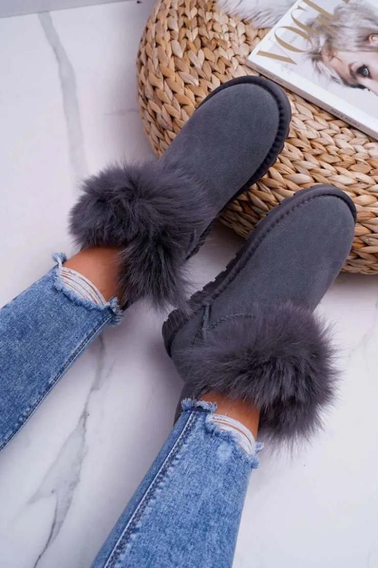 Boto Śniegowce Damskie*Damskie Botki Śniegowce Ocieplane Futerkiem Skóra Zamsz Szare Memento