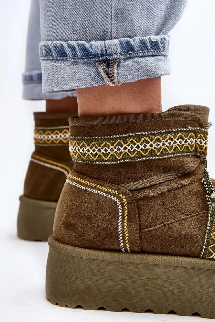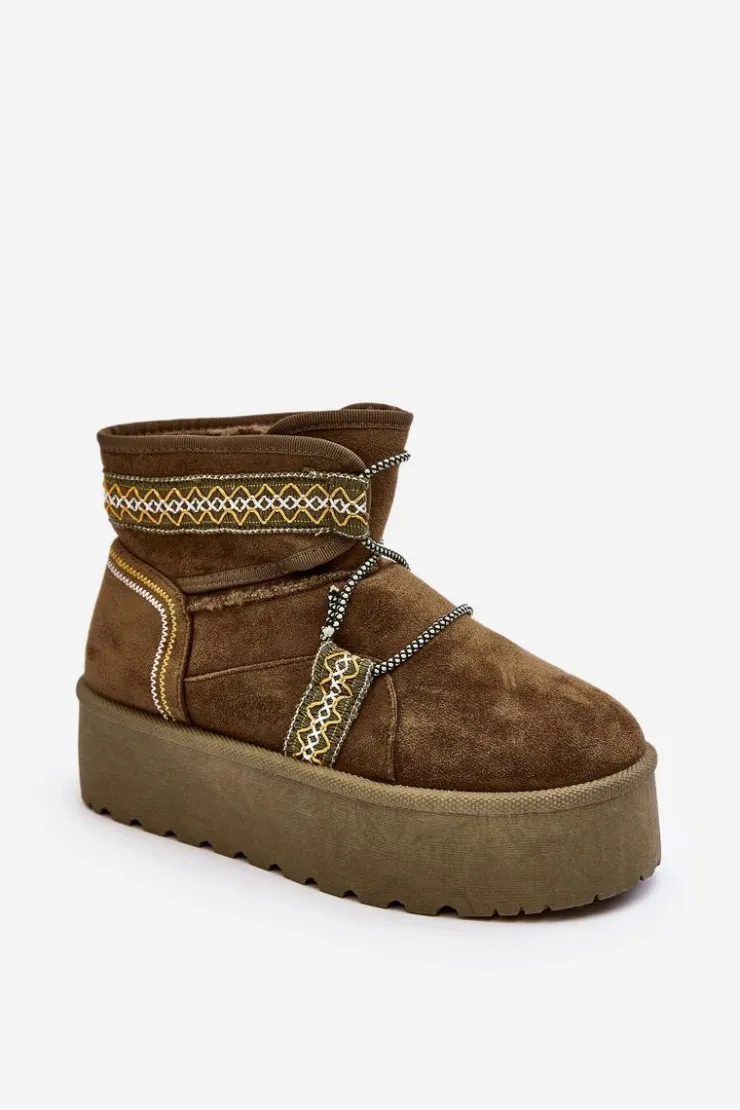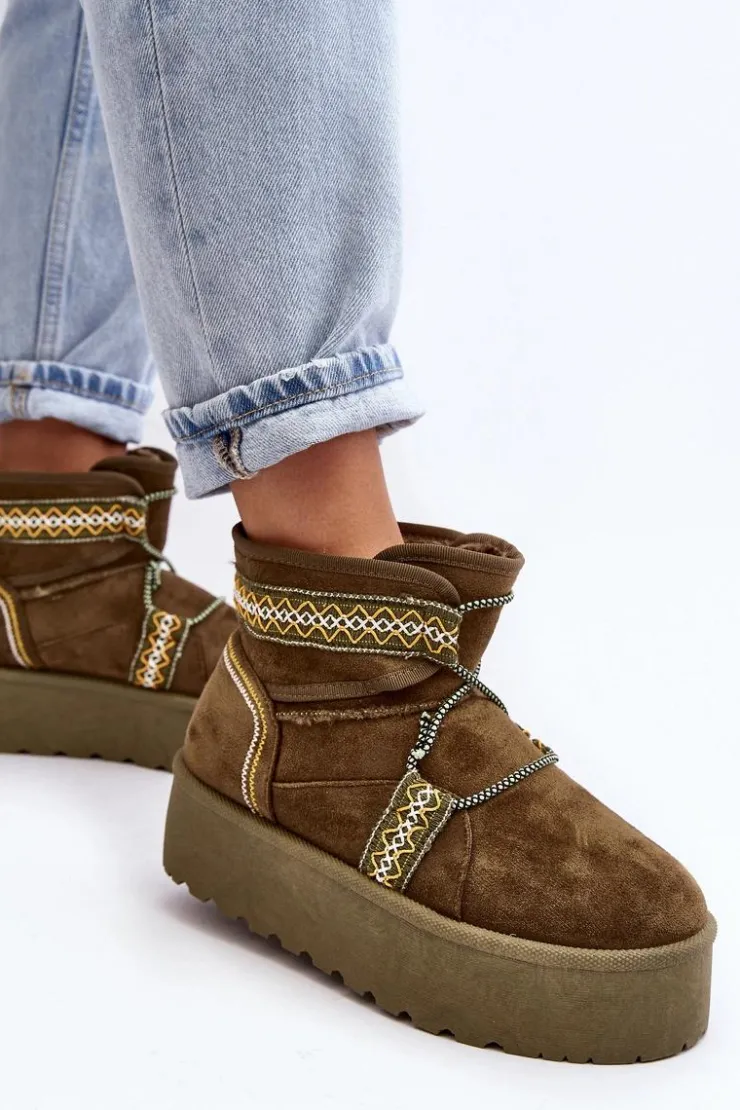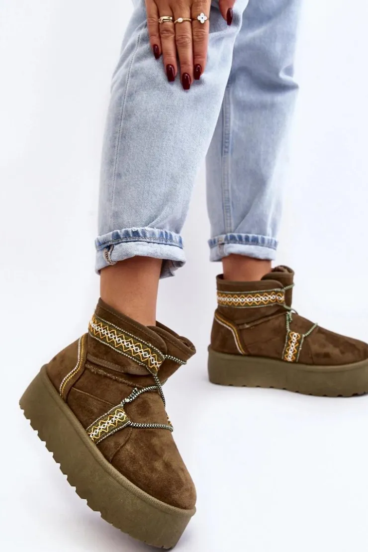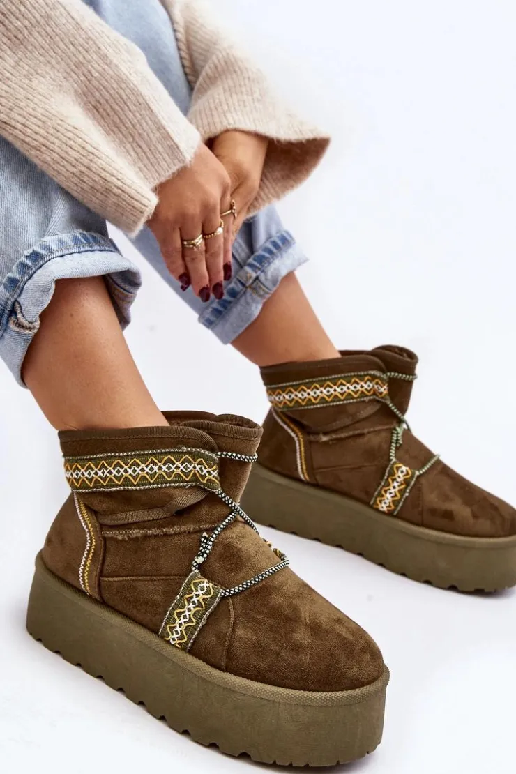 Śniegowce damskie z modnym wzorem i wiązaniem na cholewce. Wykonane z eko zamszu. Osadzone na masywnej platformie z gumowego tworzywa, która świetnie odizoluje od zimnego podłoża. Cholewka za kostkę. Środek ocieplony futerkiem. Koniecznie musisz je mieć! Przy wyborze rozmiaru prosimy sugerować się tabelą rozmiarów.