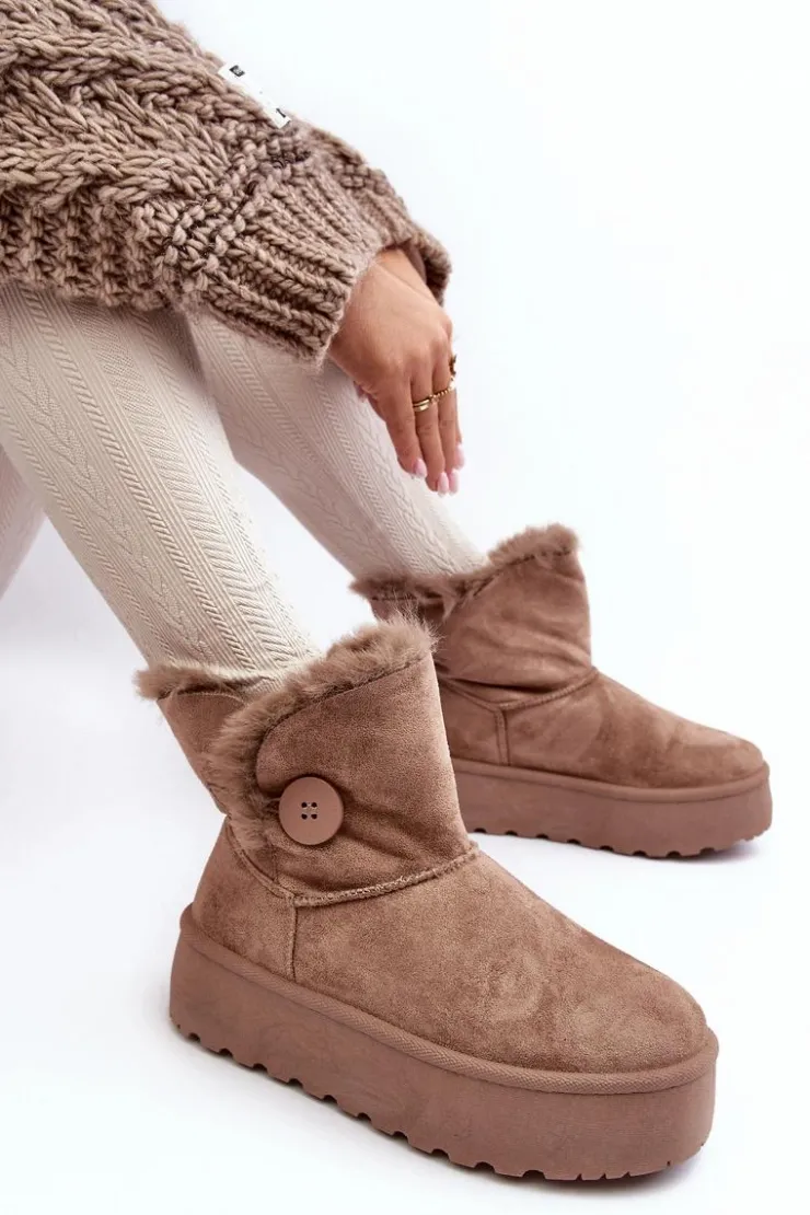 Śniegowce damskie osadzone na grubej platformie z gumowego tworzywa. Cholewka za kostkę, ozdobiona guzikiem i futerkiem. Wykonane z eko zamszu. Środek ocieplony. Ten modny model świetnie sprawdzi się w sezonie jesienno-zimowym. Koniecznie musisz je mieć! Przy wyborze rozmiaru prosimy sugerować się tabelą rozmiarów.