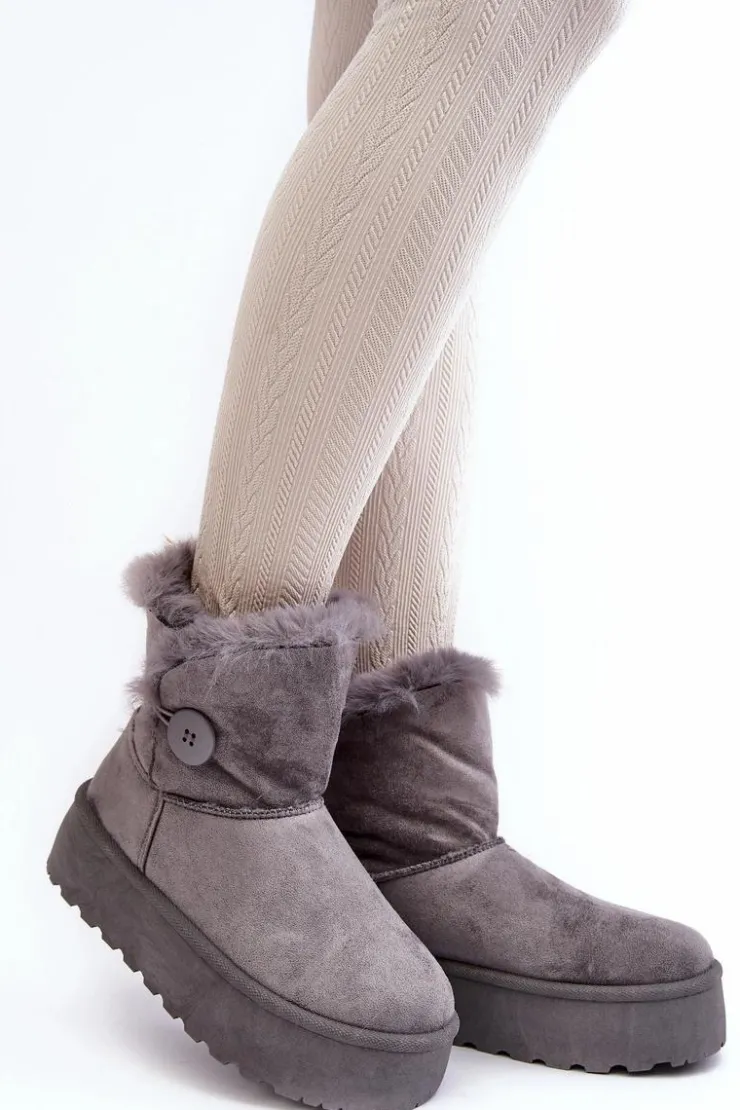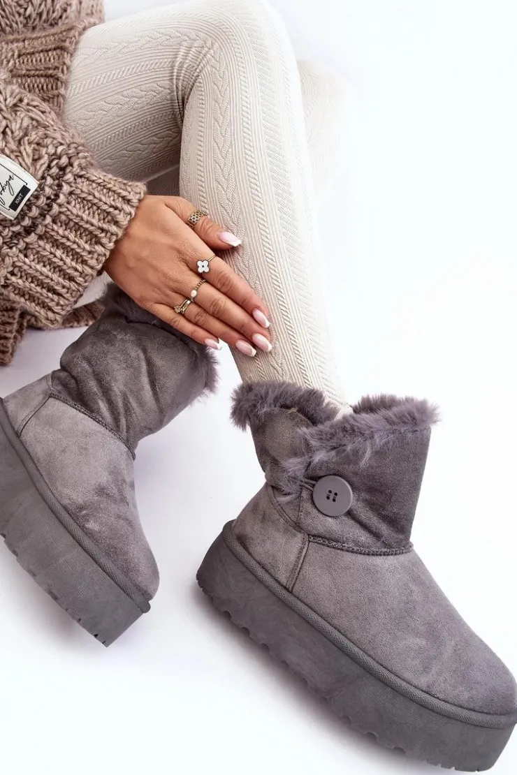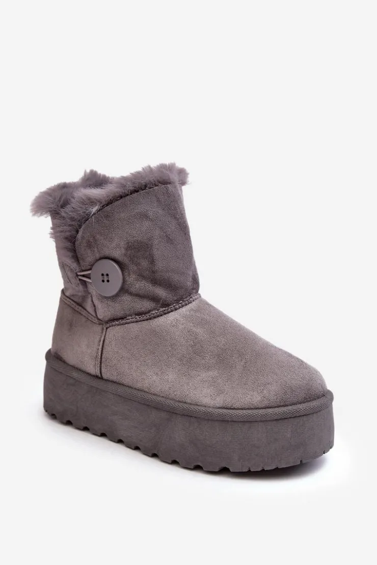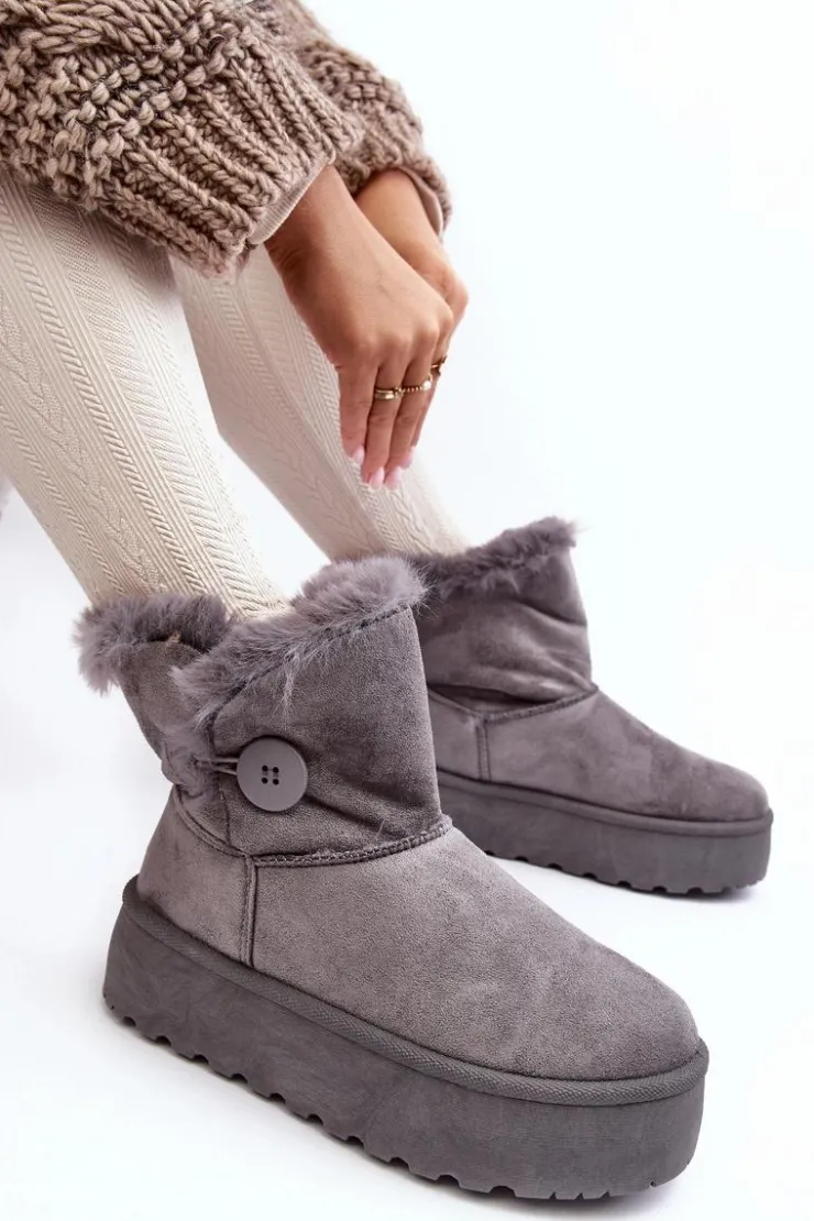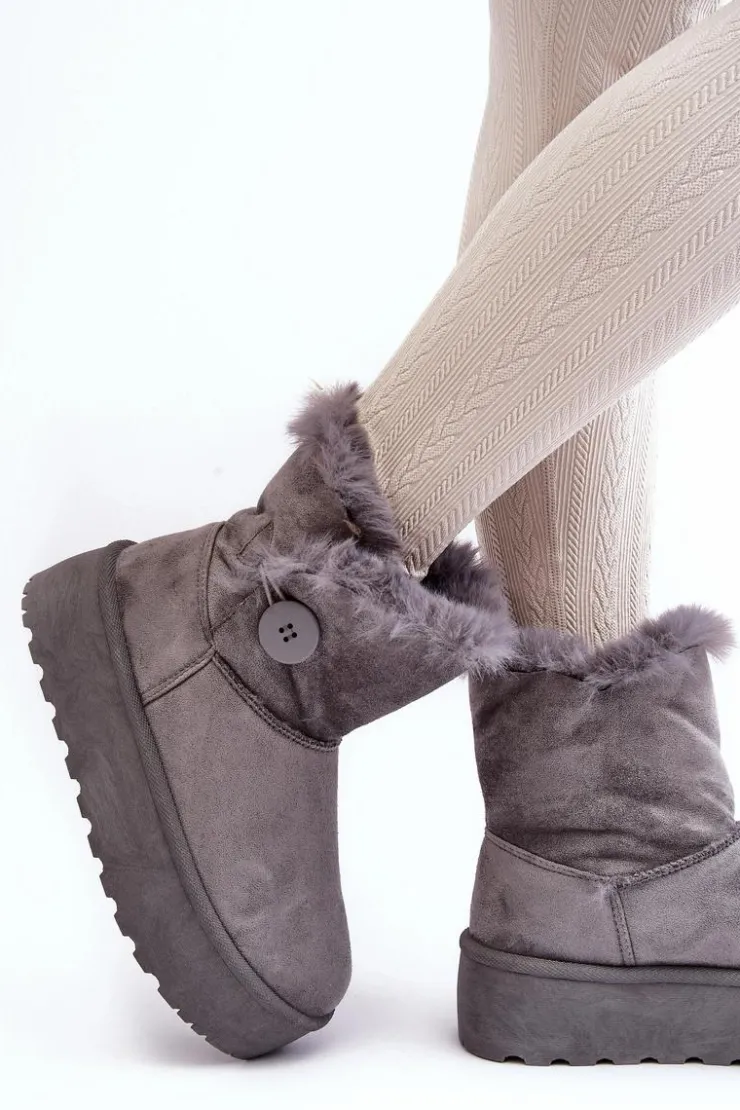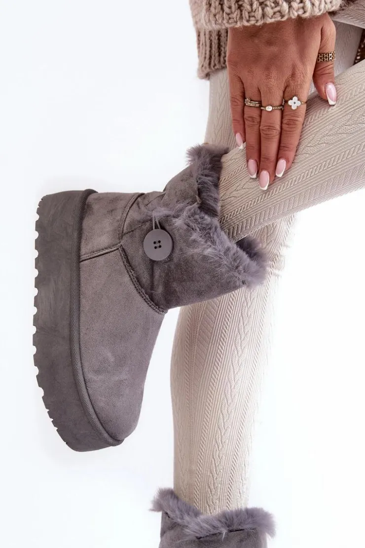 Śniegowce damskie osadzone na grubej platformie z gumowego tworzywa. Cholewka za kostkę, ozdobiona guzikiem i futerkiem. Wykonane z eko zamszu. Środek ocieplony. Ten modny model świetnie sprawdzi się w sezonie jesienno-zimowym. Koniecznie musisz je mieć! Przy wyborze rozmiaru prosimy sugerować się tabelą rozmiarów.