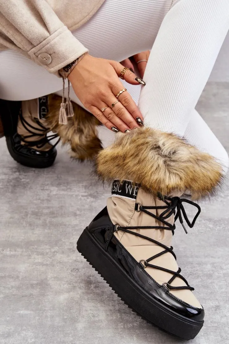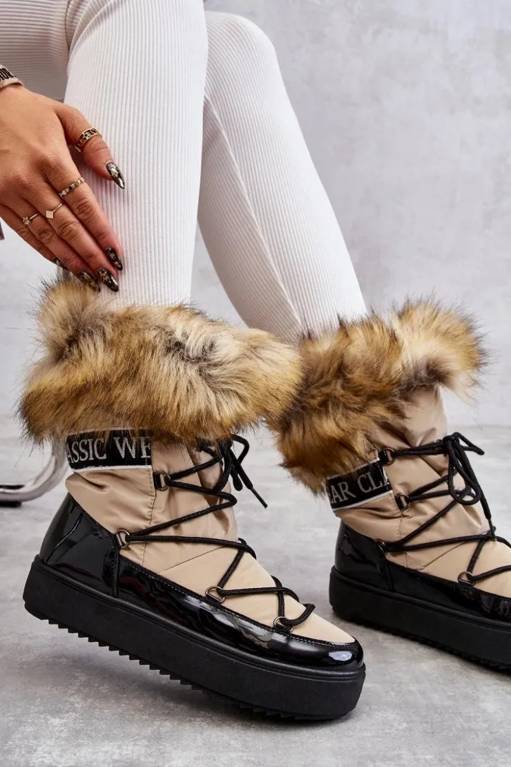 Modne śniegowce zostały wykonane z materiału odpornego na zimno i wiatr. Cholewka zakończona sztucznym futerkiem. Model klasycznie sznurowany. Śniegowce zostały osadzone na masywnej platformie. Posiadają w środku ocieplenie w postaci grubego futerka. Dekorowane tasiemką z nadrukiem. Niezwykle ciepłe, a zarazem stylowe. Powinnaś je mieć! Przy wyborze rozmiaru prosimy sugerować się tabelą rozmiarów.