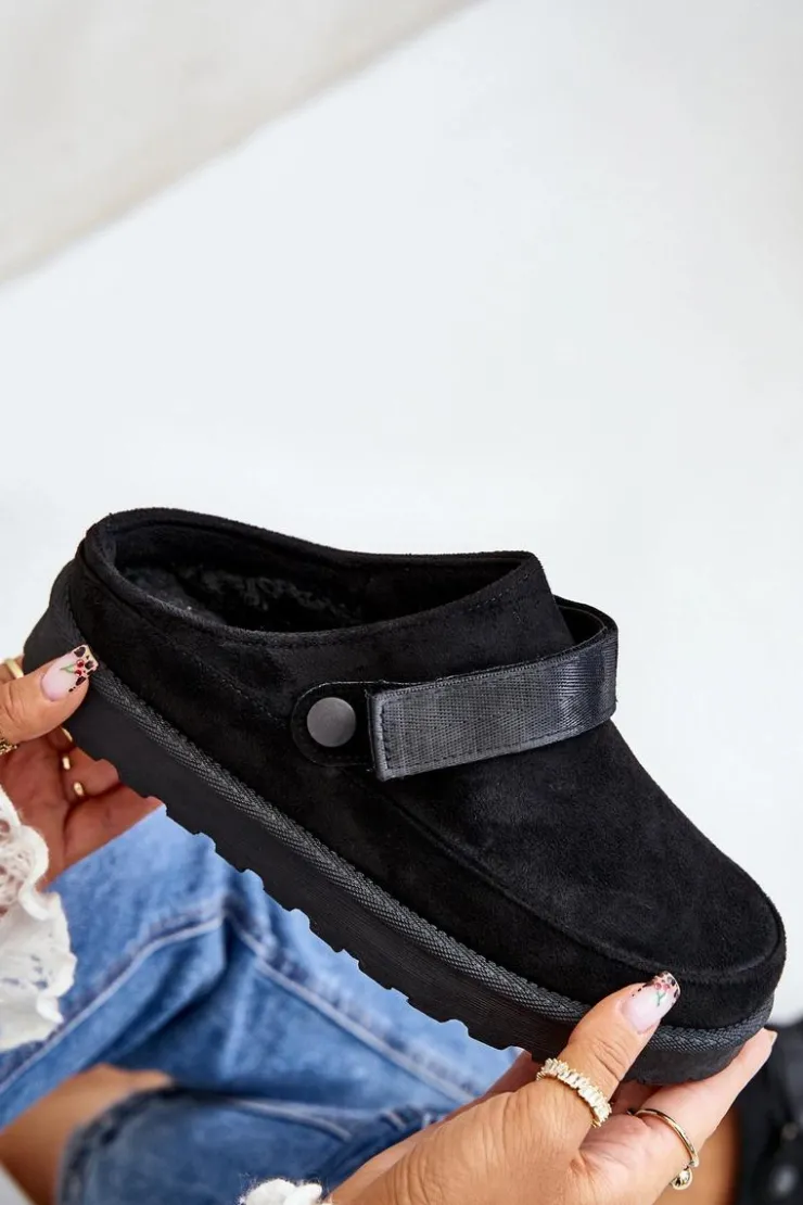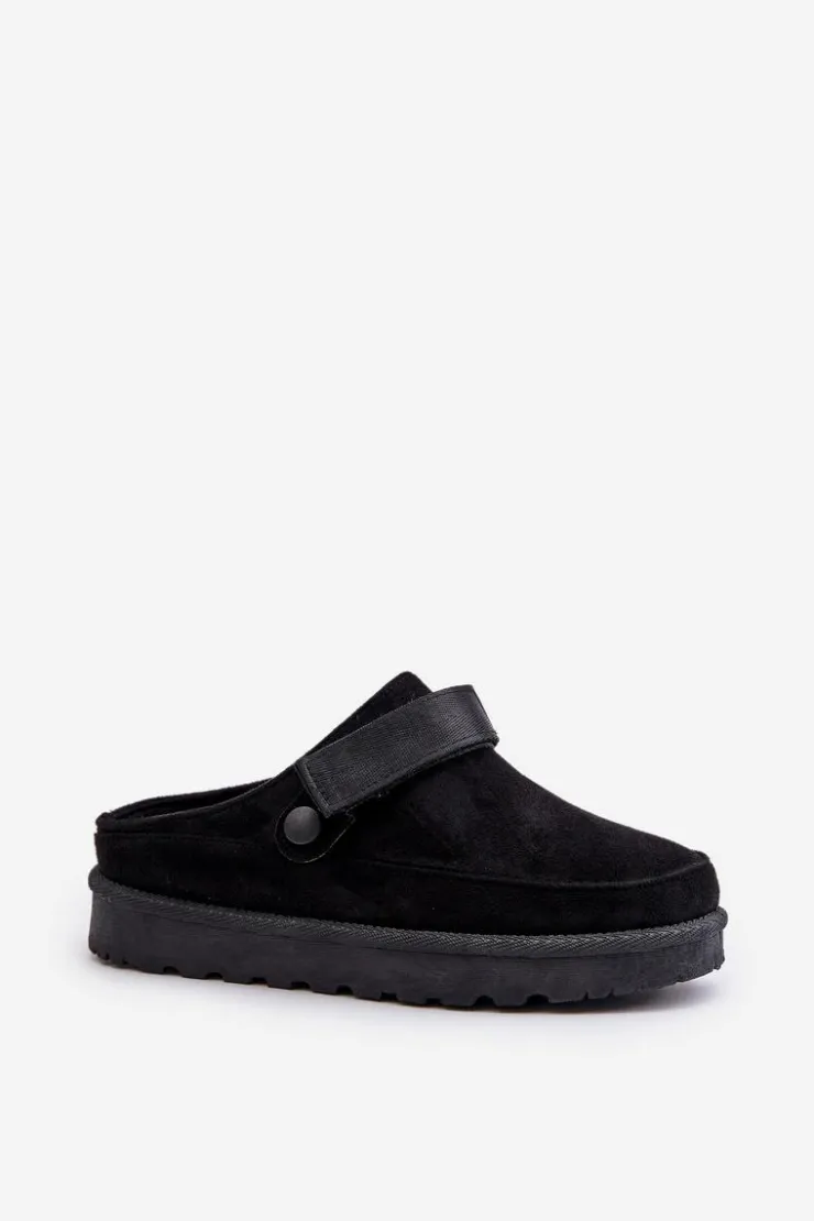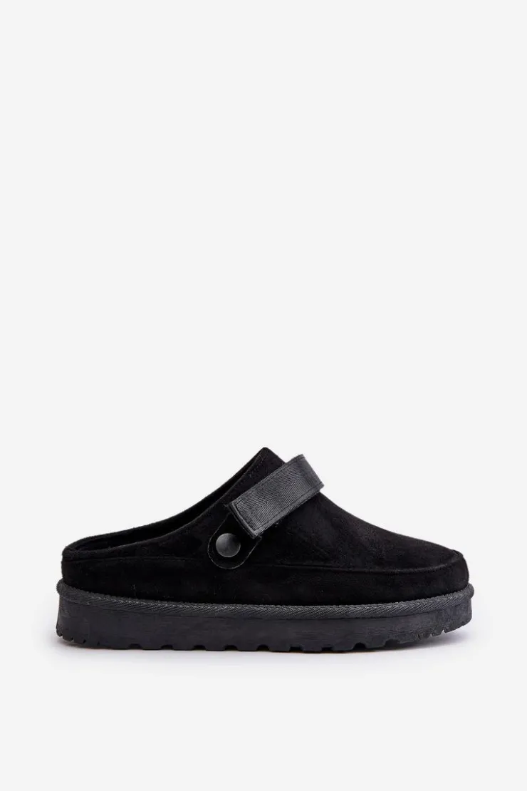 Damskie klapki wykonane z eko zamszu. Osadzone na platformie. Wnętrze ocieplone przyjemnym futerkiem, co zapewnia komfort w chłodniejsze dni. Dodatkowo posiadają ruchomy pasek zapinany na rzep, który stabilizuje piętę i umożliwia idealne dopasowanie. Idealne na co dzień, łączą styl z funkcjonalnością. Przy wyborze rozmiaru prosimy sugerować się tabelą rozmiarów.