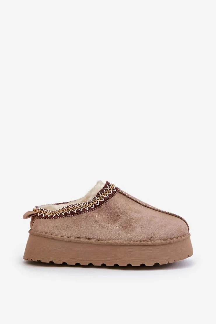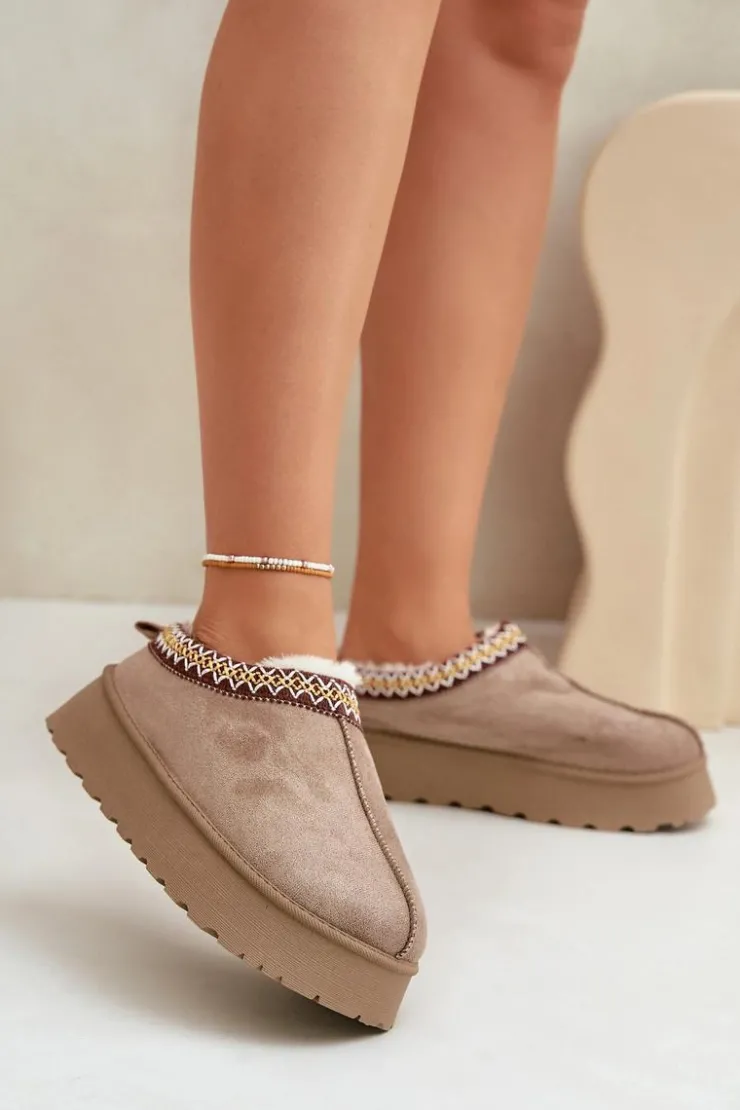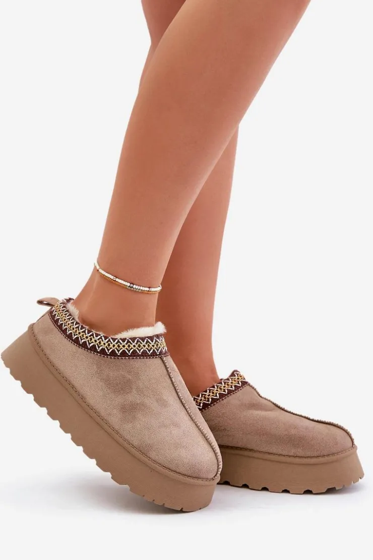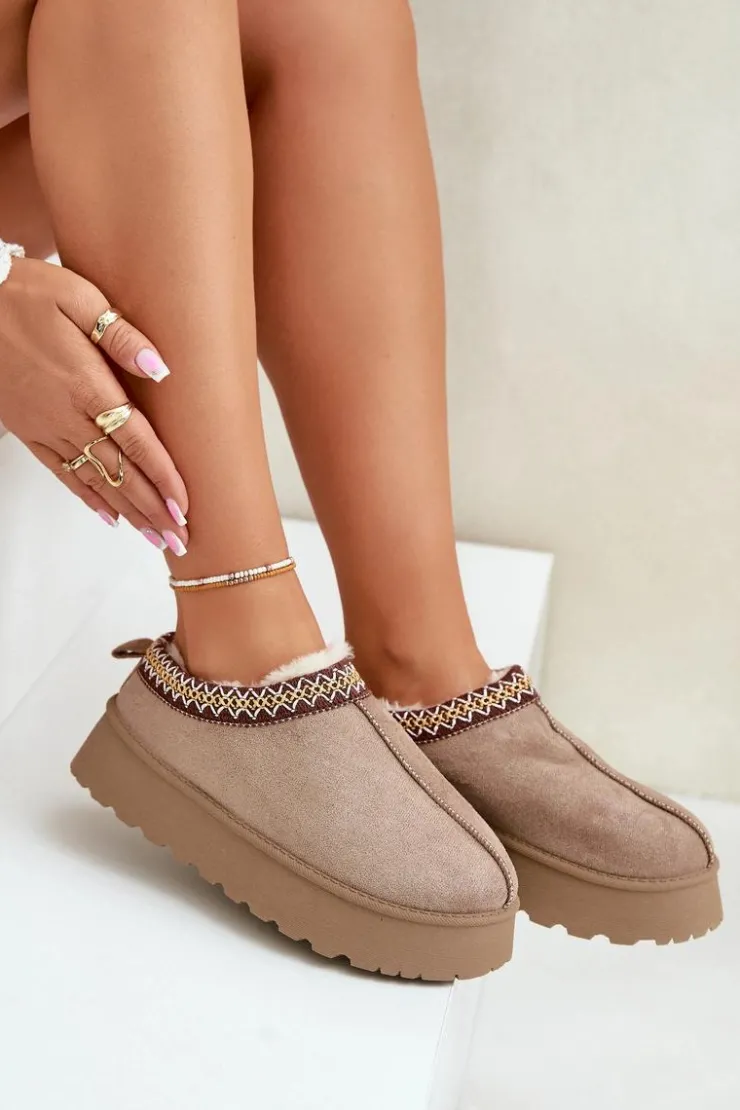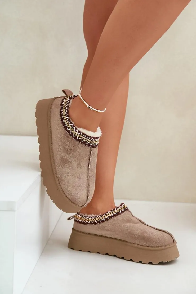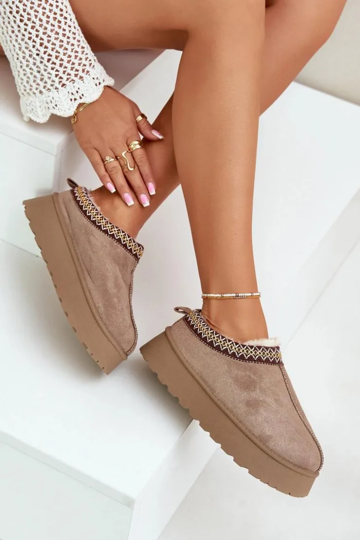 Stylowe kapcie wykonane z eko zamszu to doskonały wybór na chłodniejsze dni. Osadzone na platformie, z zakrytymi noskami i ocieplane miękkim futerkiem, zapewniają komfort i ciepło. Górę cholewki zdobi subtelny haft, który nadaje im eleganckiego charakteru. Idealne do codziennego użytku w domu oraz szybkie wyjścia na zewnątrz. Przy wyborze rozmiaru prosimy kierować tabelą rozmiarów.