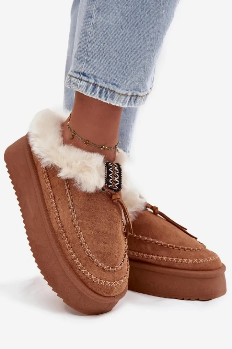 Śniegowce damskie wykonane z eko zamszu. Osadzone na masywnej platformie skutecznie izolują stopy od zimnego podłoża, zapewniając wygodę nawet podczas długiego noszenia. Wyróżniają się stylowym futerkiem, które dodaje im zimowego charakteru oraz dekoracyjnymi przeszyciami, podkreślającymi unikalny wygląd modelu. To idealny wybór na chłodne dni – praktyczne, ciepłe i zarazem stylowe obuwie, które świetnie dopełni codzienne zimowe stylizacje.