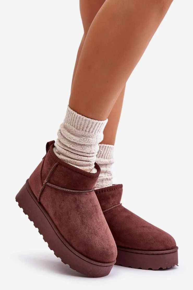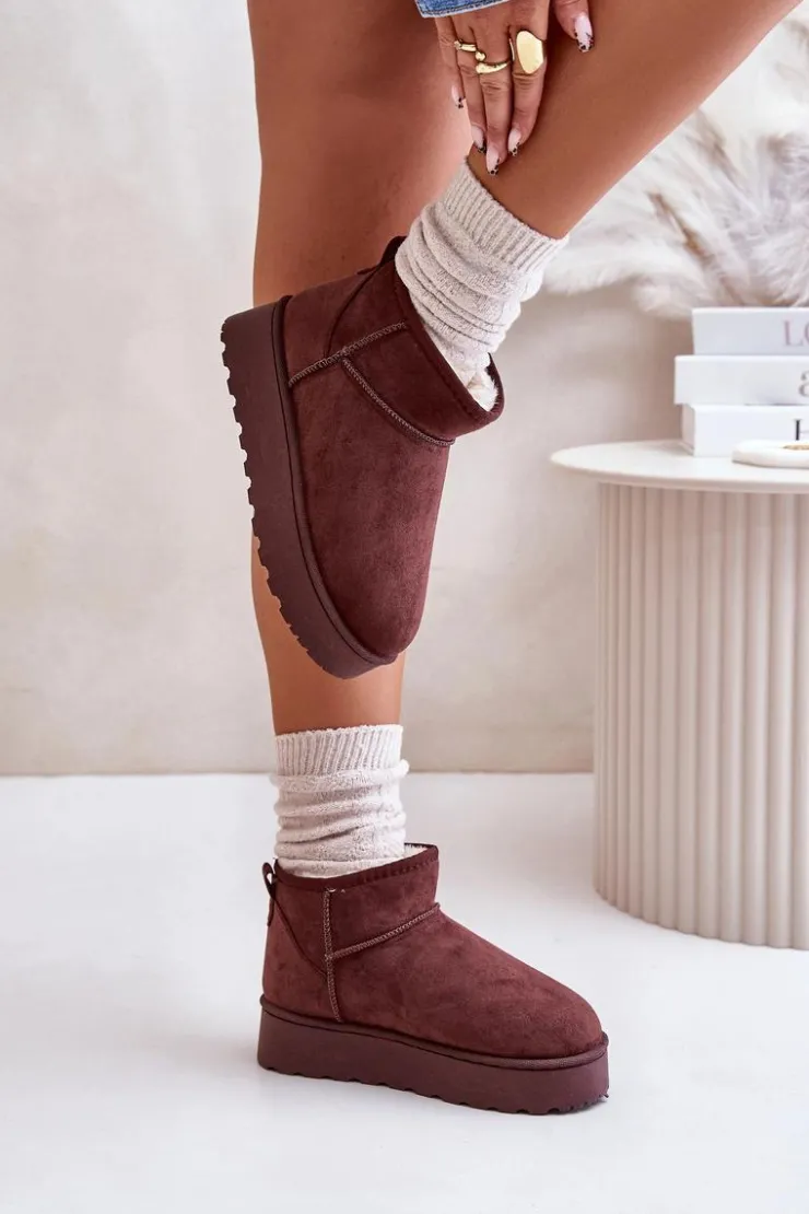 Modne śniegowce z cholewką za kostkę. Wewnątrz ocieplone grubym, syntetycznym futerkiem. Wykonane z eko zamszu. Osadzone na grubej platformie z gumowego tworzywa, która świetnie odizoluje od zimnego podłoża. Idealnie sprawdzą się podczas mroźnych dni. Modny od kilku sezonów fason świetnie wpasuje się w jesienno-zimowe stylizacje! Model ten dostępny jest również w rozmiarach dziecięcych. Stwórz komplet mama + dziecko! Przy wyborze rozmiaru prosimy sugerować się tabelą rozmiarów.