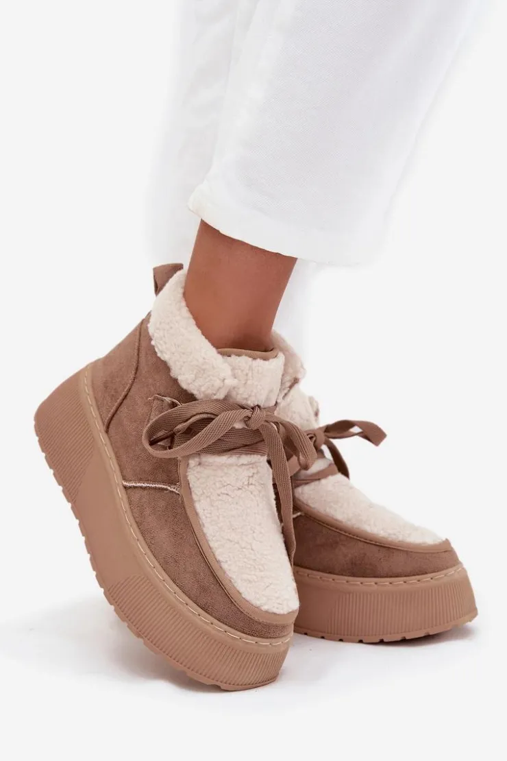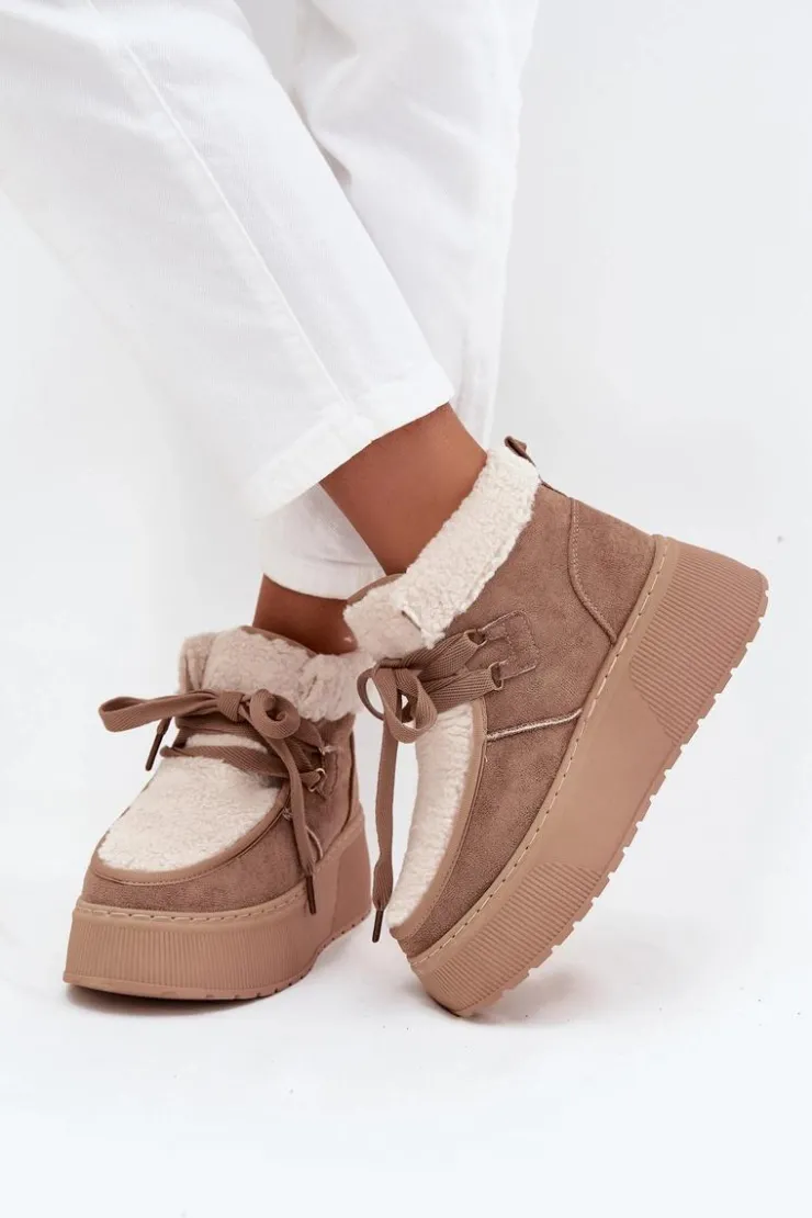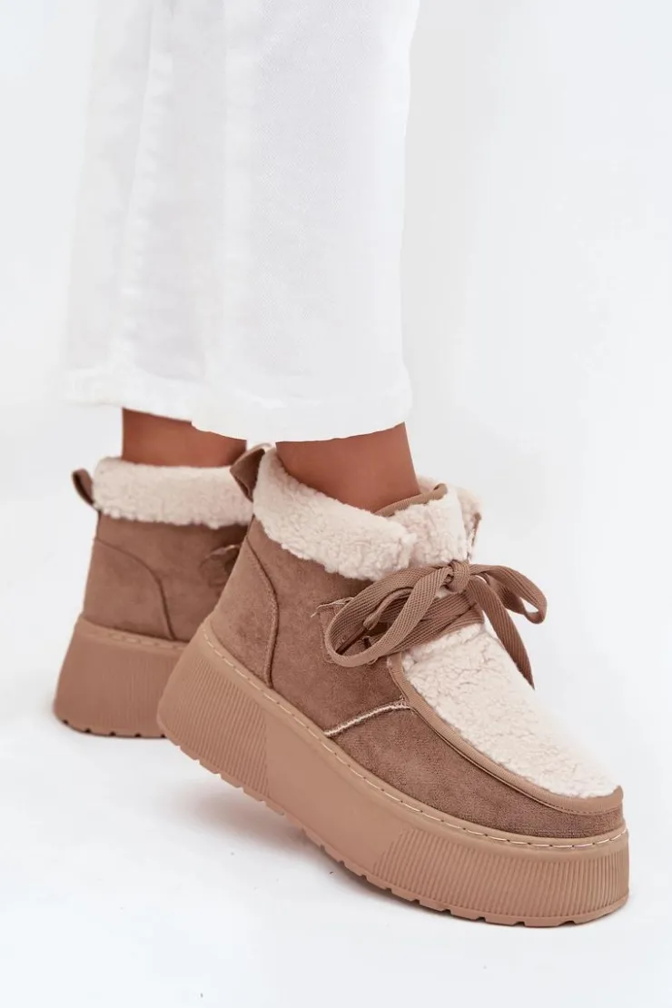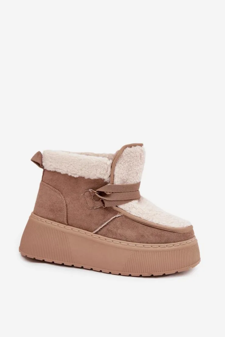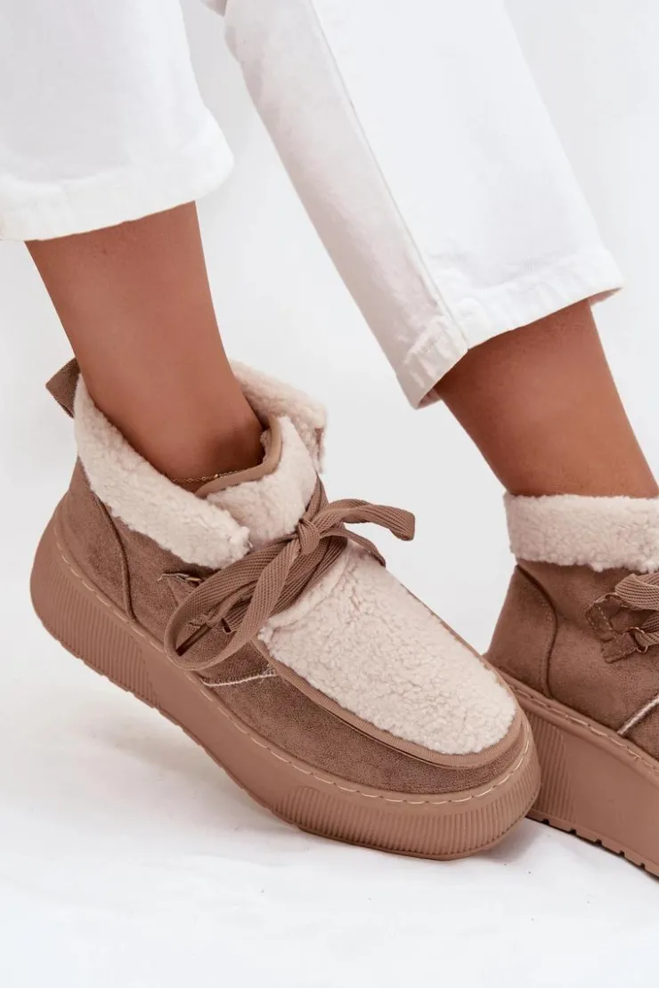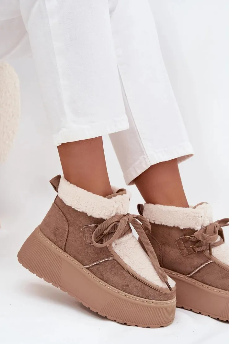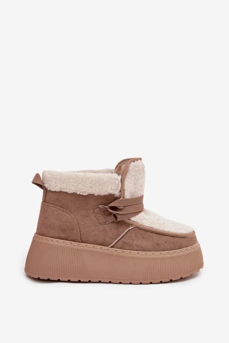 Śniegowce damskie wykonane z miękkiego eko zamszu to idealny wybór na zimowe dni. Model wsuwany ze sznurowaniem świetnie dopasowuje się do stopy, a wnętrze ocieplane futerkiem gwarantuje ciepło i wygodę. Osadzone na solidnej platformie, skutecznie izolują od chłodnego podłoża. To praktyczne i stylowe obuwie, które doskonale sprawdzi się w codziennych, zimowych stylizacjach. Przy wyborze rozmiaru prosimy sugerować się tabelą rozmiarów.